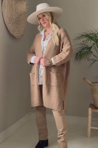 Edestä avoin neuletakki, jossa aavistuksen vajaamittaiset hihat. Halkiot ja taskut sivuilla.