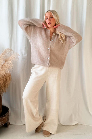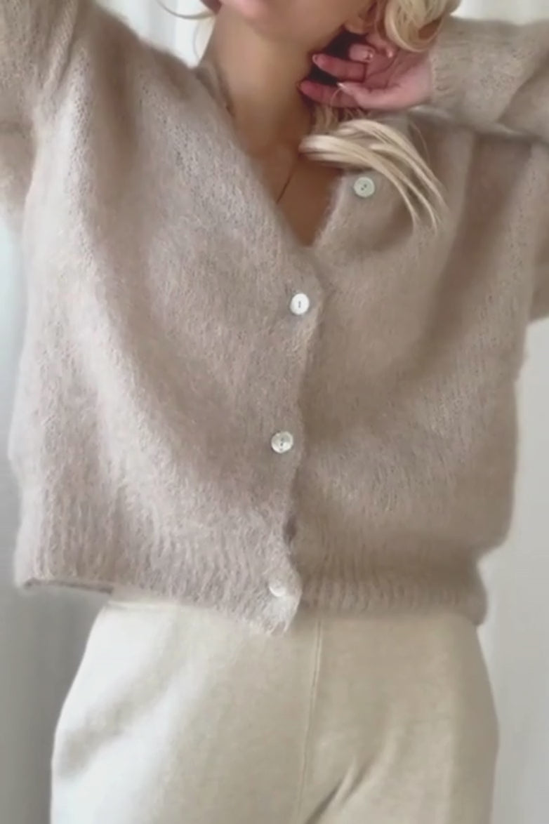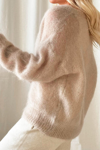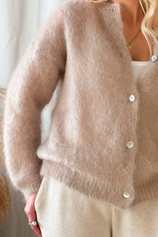 Lyhyt neuletakki pehmeää ja ylellistä Kid Mohairia. Helmiäsinapit edessä, madallettu olkapäälinja ja resorit hihansuissa ja helmassa.