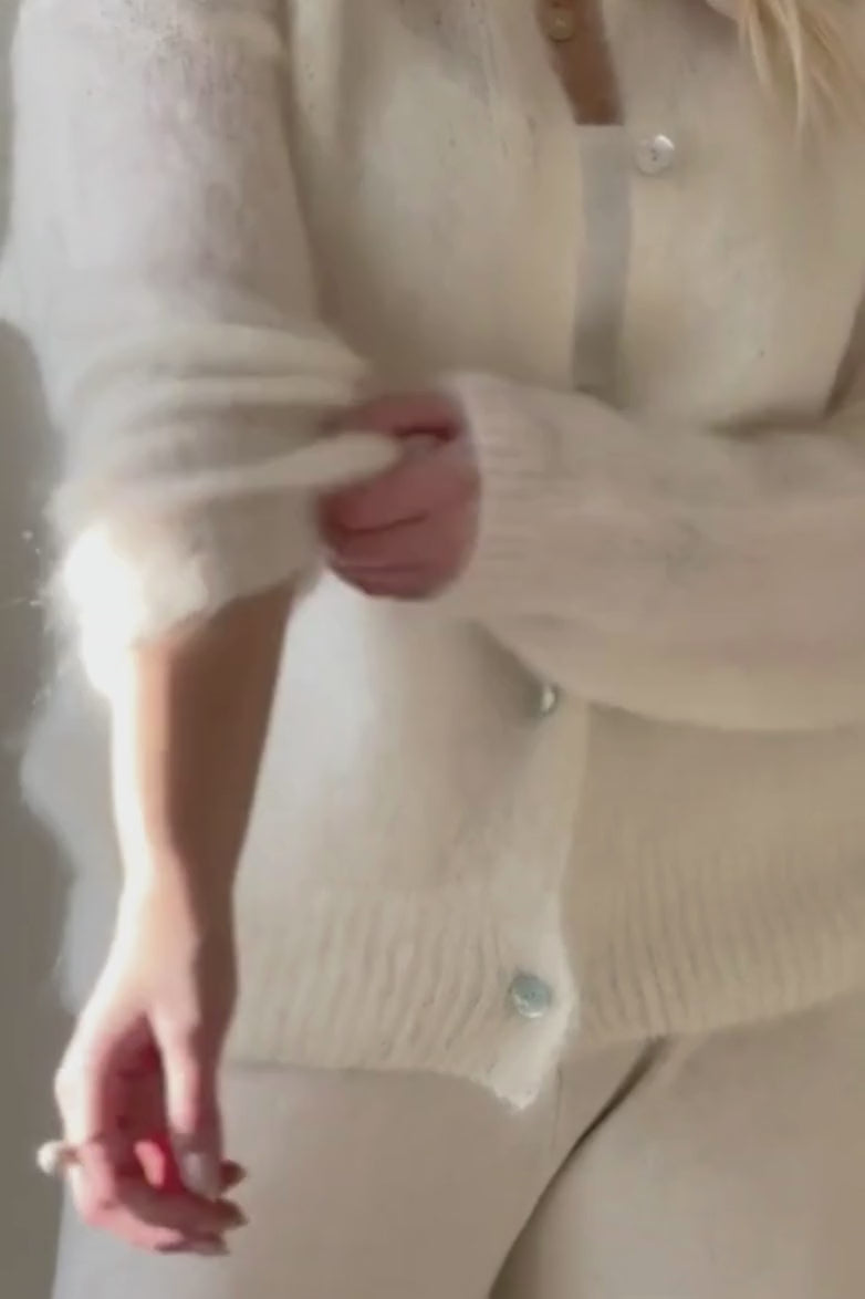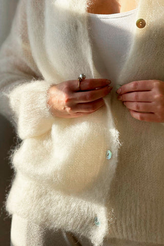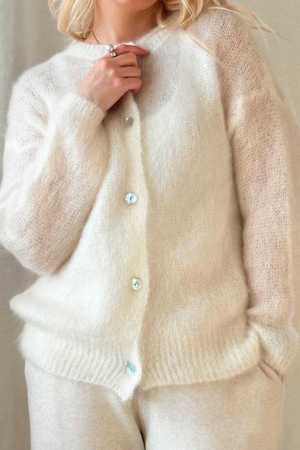 Lyhyt neuletakki pehmeää ja ylellistä Kid Mohairia. Helmiäsinapit edessä, madallettu olkapäälinja ja resorit hihansuissa ja helmassa.