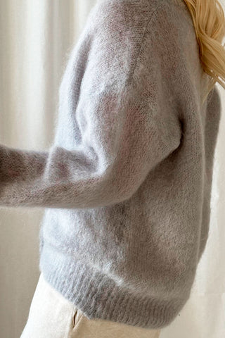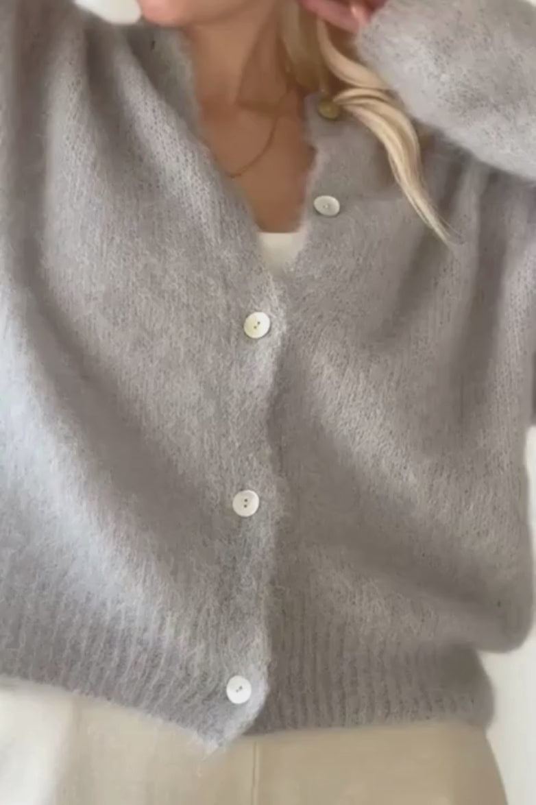 Lyhyt neuletakki pehmeää ja ylellistä Kid Mohairia. Helmiäsinapit edessä, madallettu olkapäälinja ja resorit hihansuissa ja helmassa.