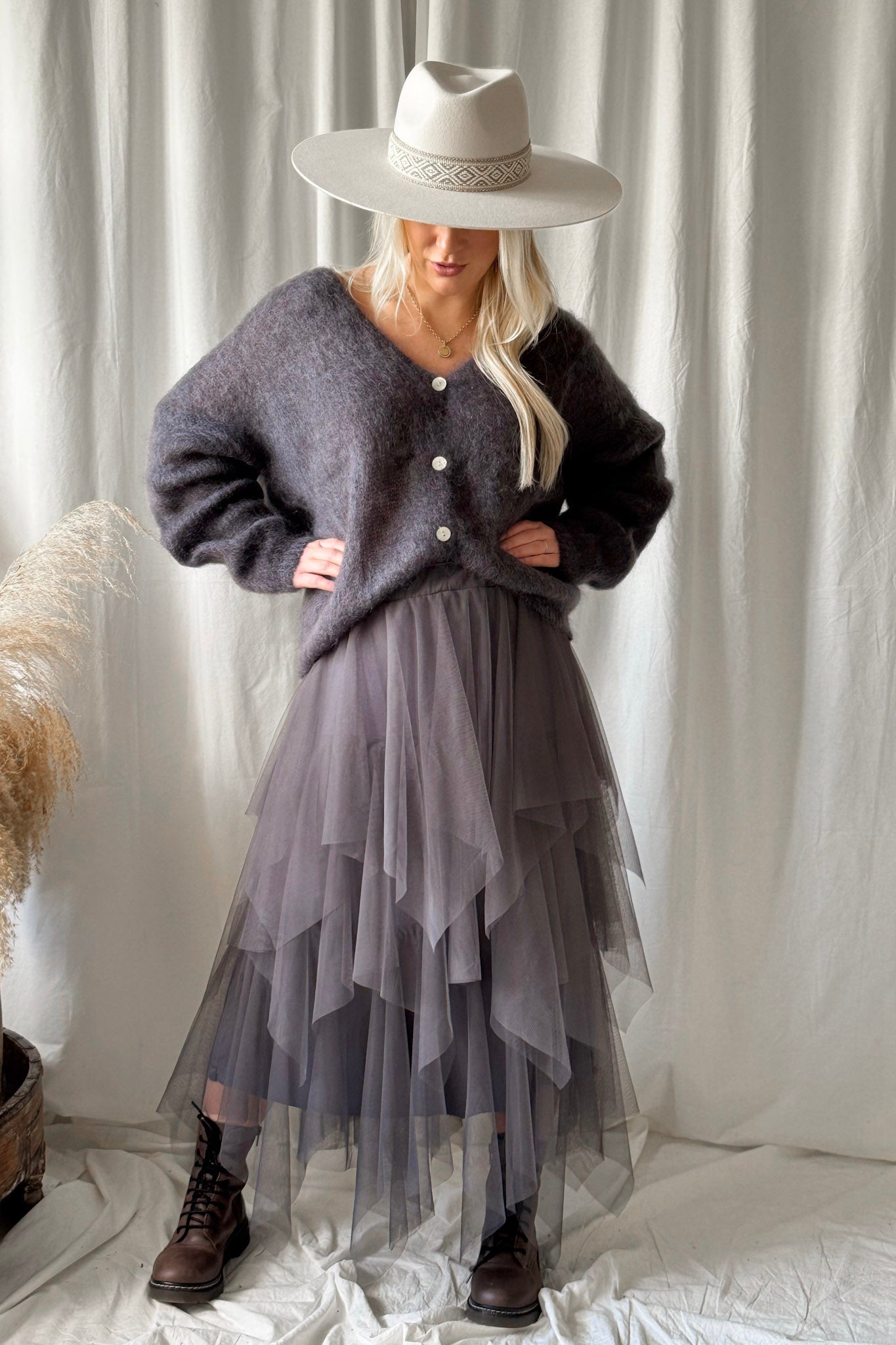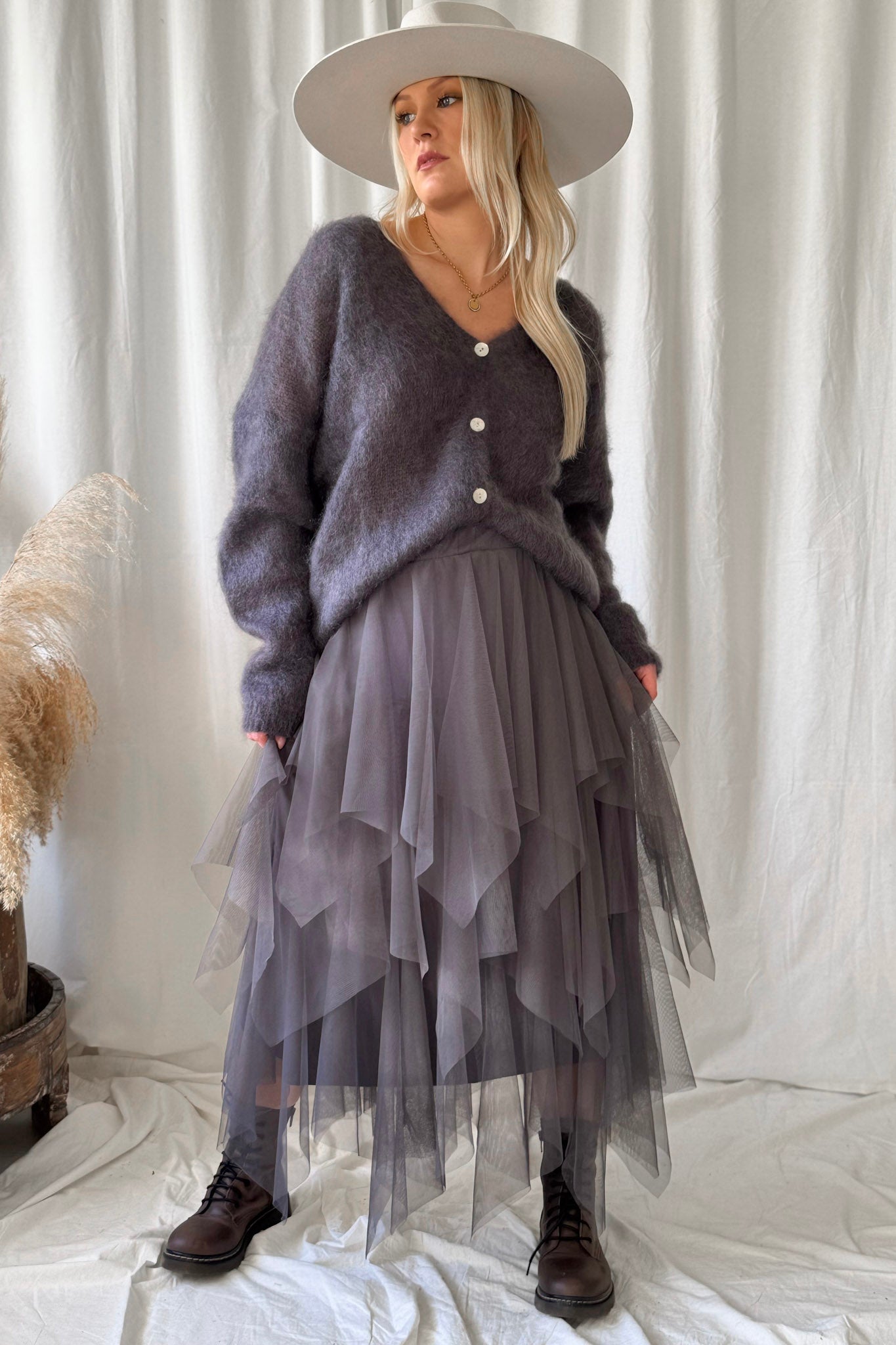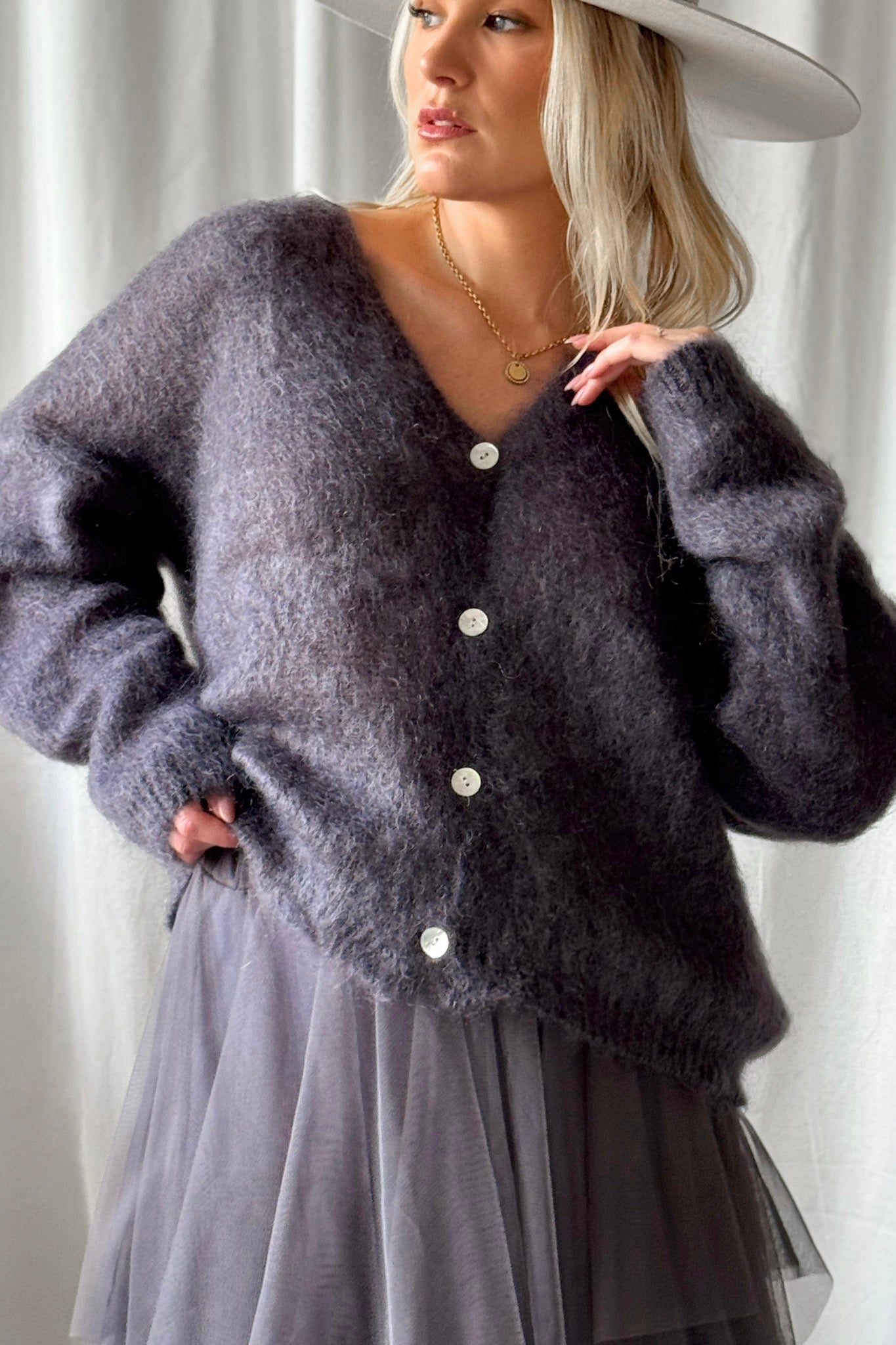 Yleellinen Kid mohairneuletakki, jossa helmiäisnapit v-pääntiellä. Klassinen malli, joka näyttää ihanalta päällä.