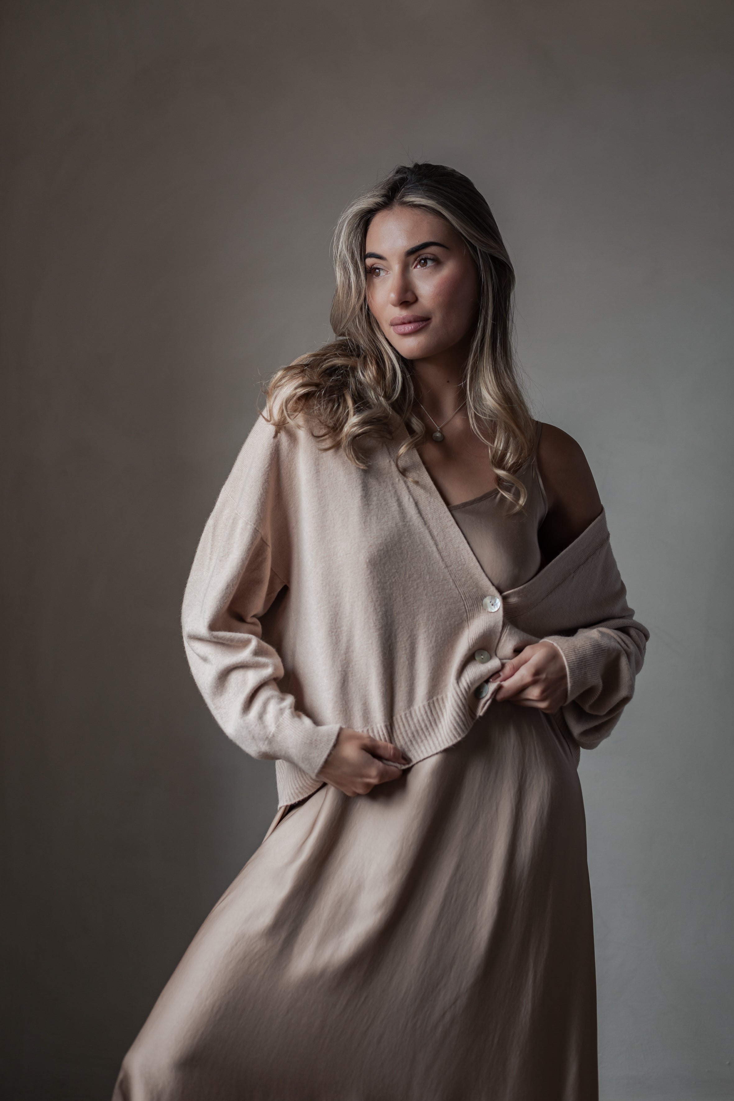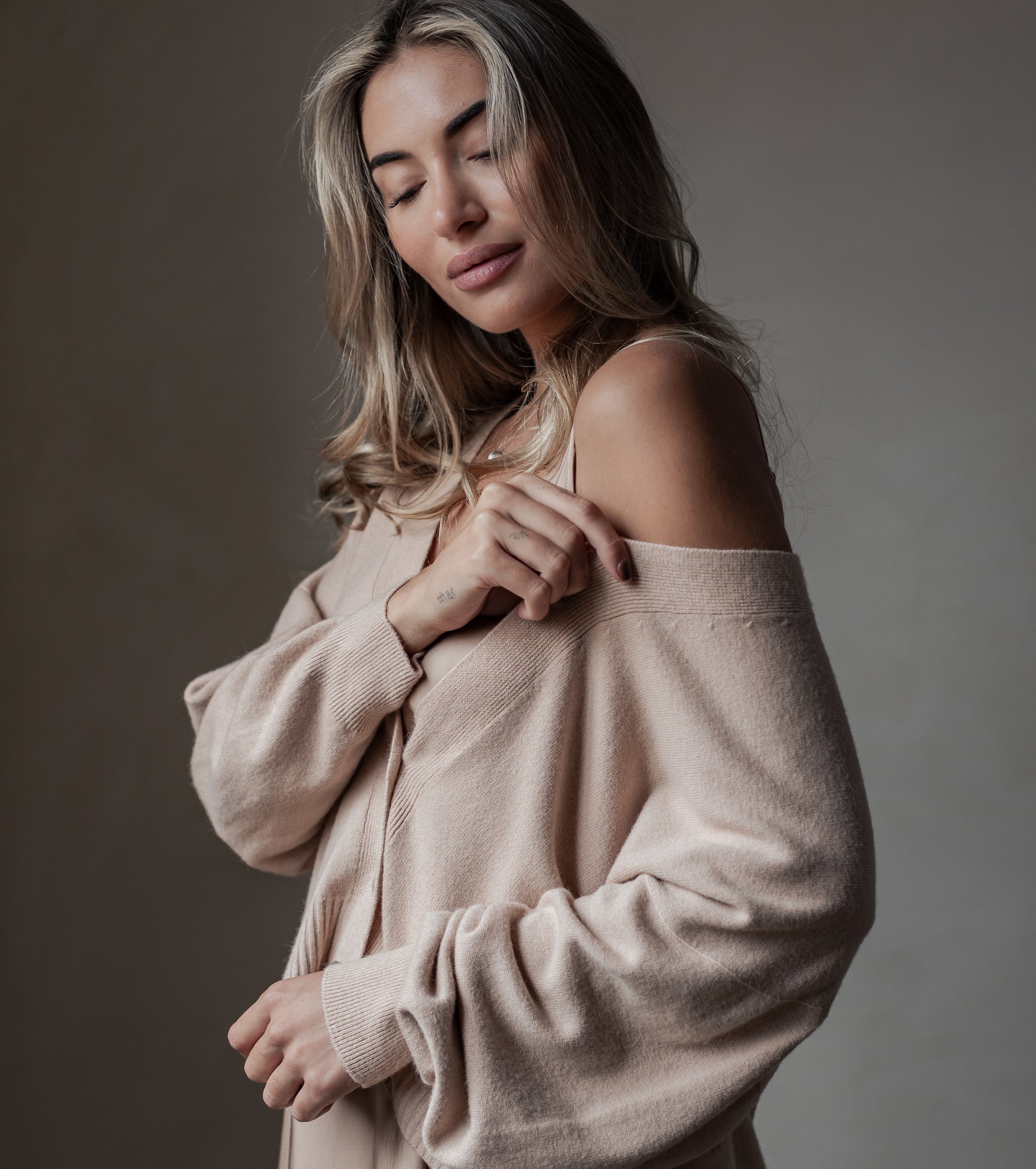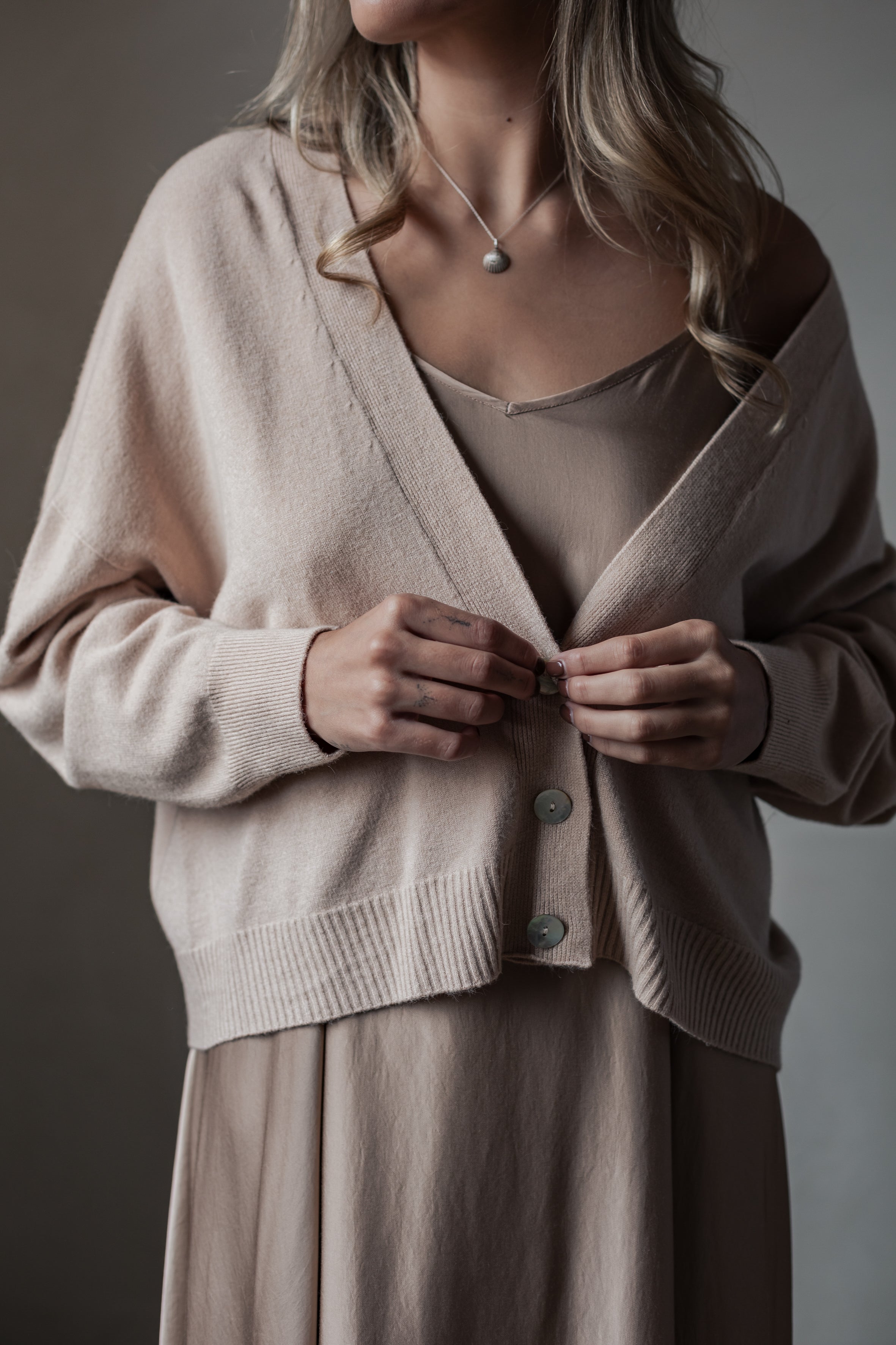 Huikean ylellinen, joustava lyhyemmän mallinen neuletakki, jossa kaunis napitus edessä. Hihoissa ja helmassa kevyet resorit. Koko hienouden kruunaa erityinen viskoosisekoite-neuloksen materiaali, joka tuntuu iholla pehmeältä ja kevyeltä.