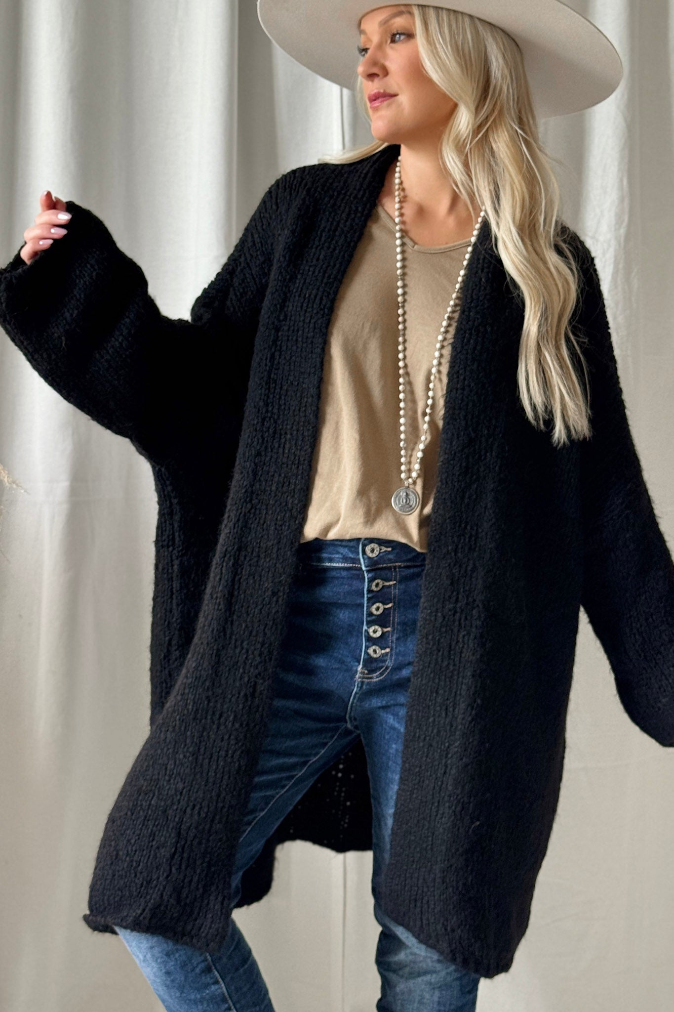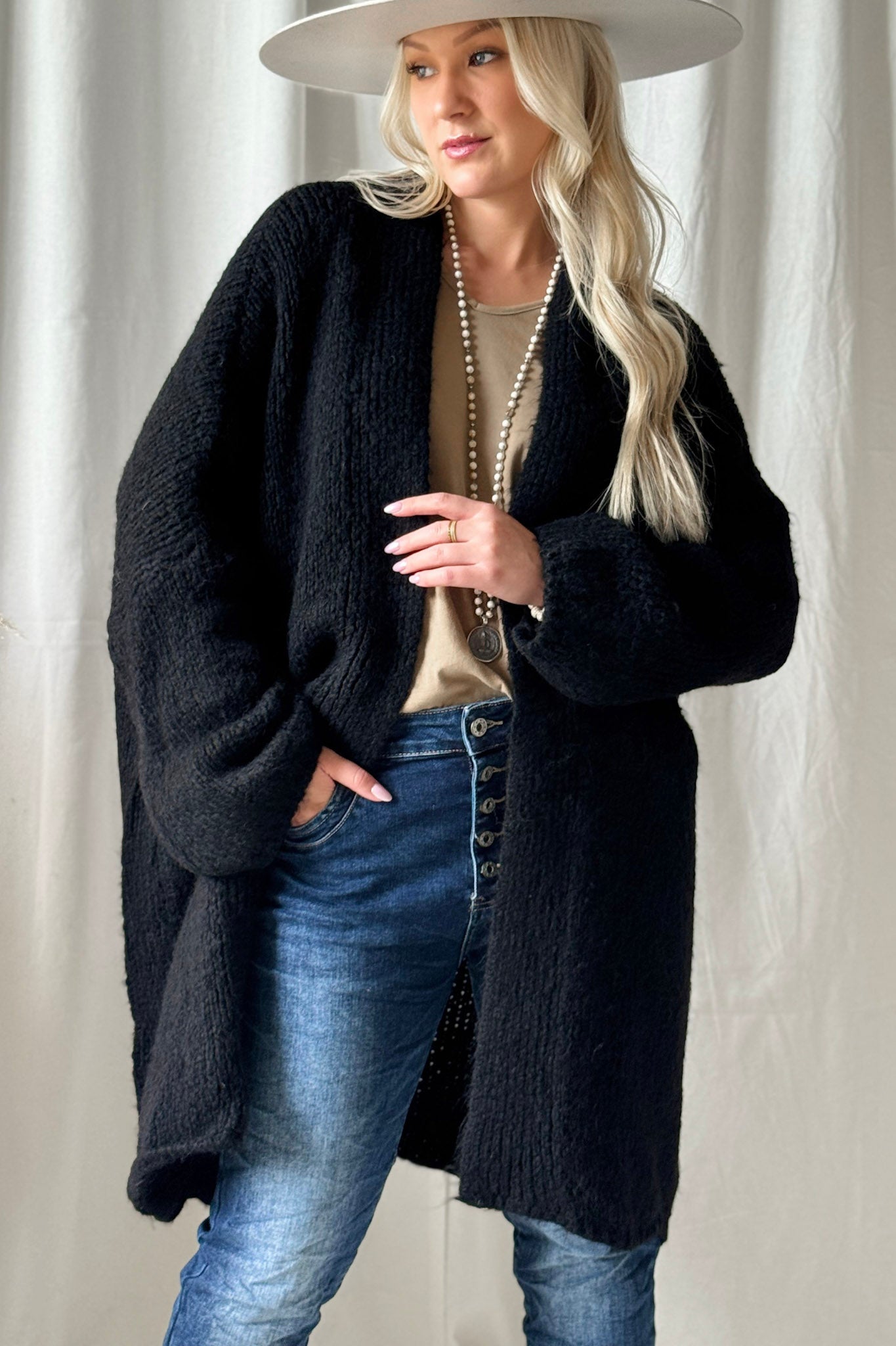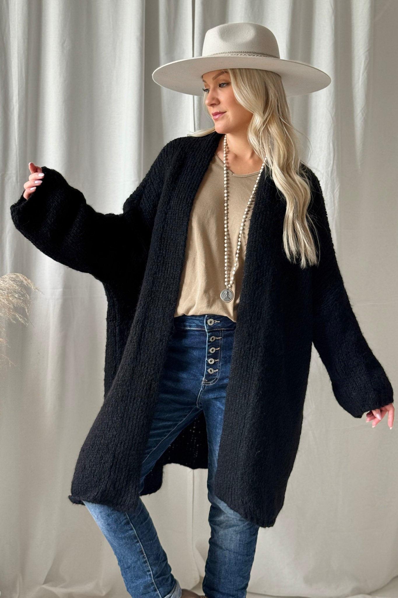 Bouckle-mallistomme ylellisen pehmeä oversize neuletakki, jossa väljät hihat ja kevyet resorit hihansuissa ja helmassa. Madalletut olkapäät ja pystykaulus jonka voi myös viikata kauniisti. Täydellinen lisä viileämpiin päiviin! Bouckle-neuleet ovat materiaaliltaan helppohoitoisia, eivätkä kutita ihoa.