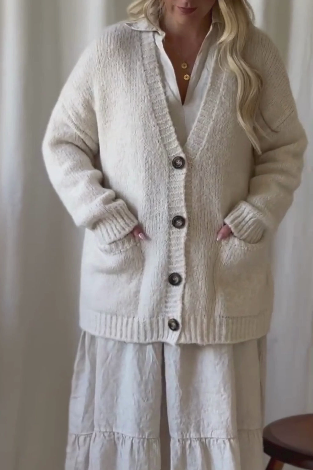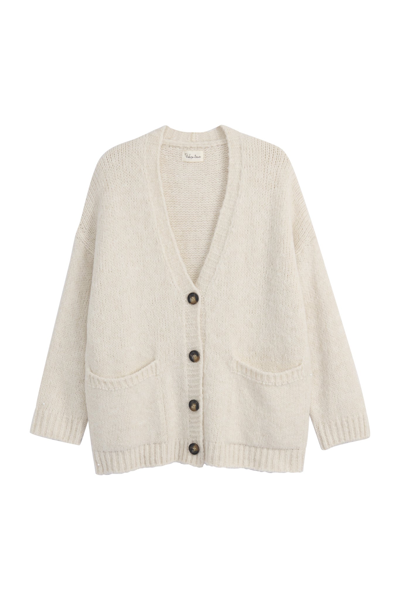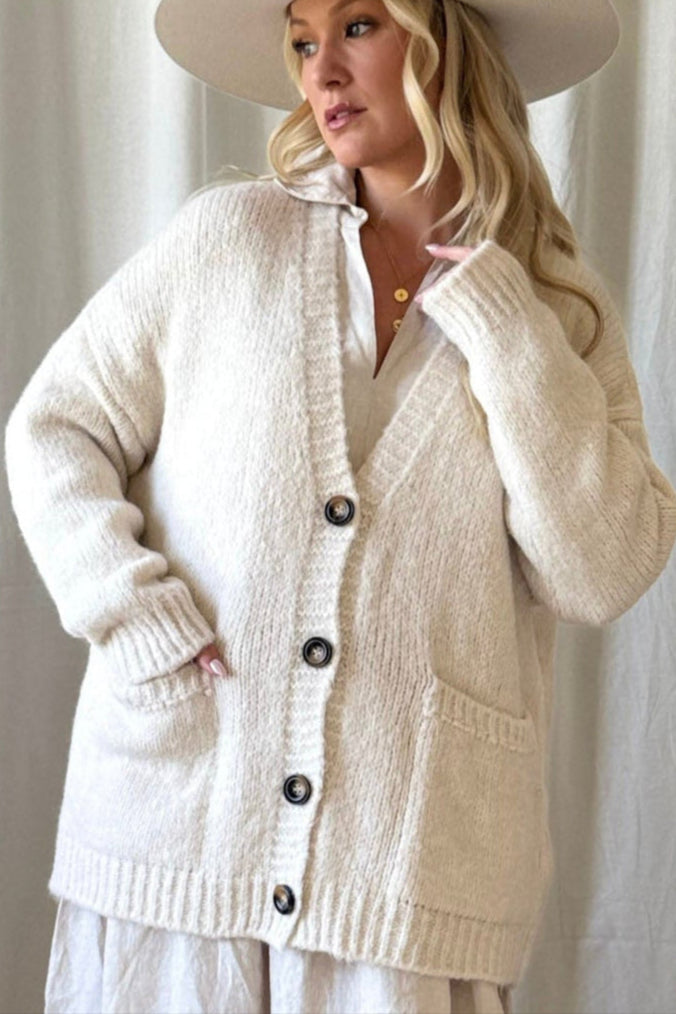 Pehmeä ja ihanan muhkea neuletakki jokapäiväiseen käyttöön. Edessä on kauniit suuret napit ja kätevät taskut. Hihoissa ja helmassa kevyt resori.