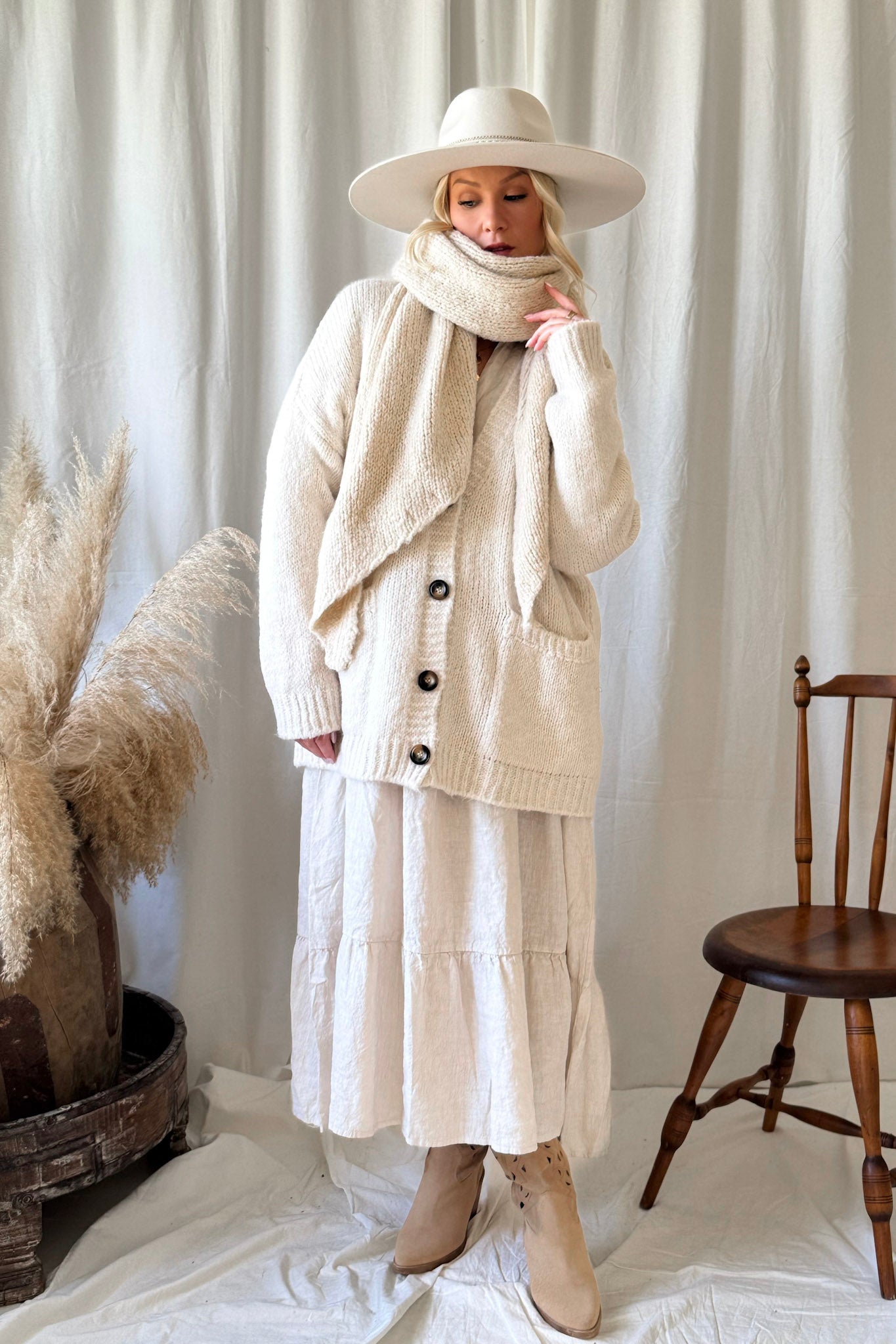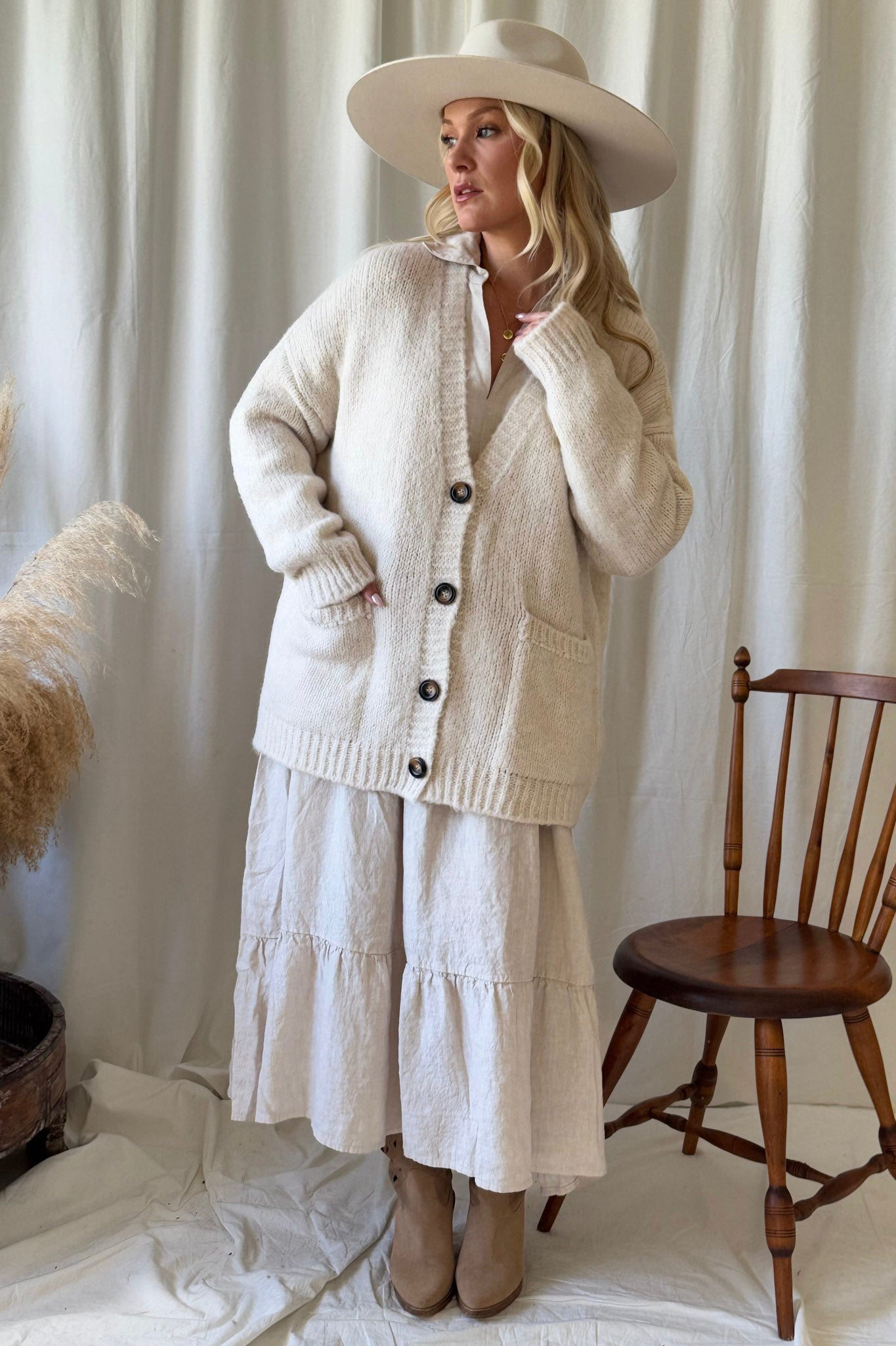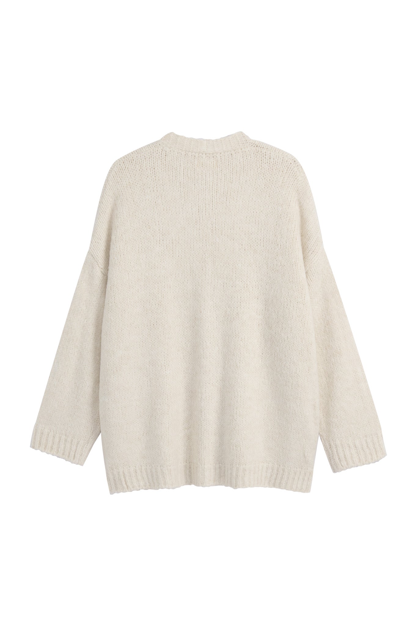 Pehmeä ja ihanan muhkea neuletakki jokapäiväiseen käyttöön. Edessä on kauniit suuret napit ja kätevät taskut. Hihoissa ja helmassa kevyt resori.