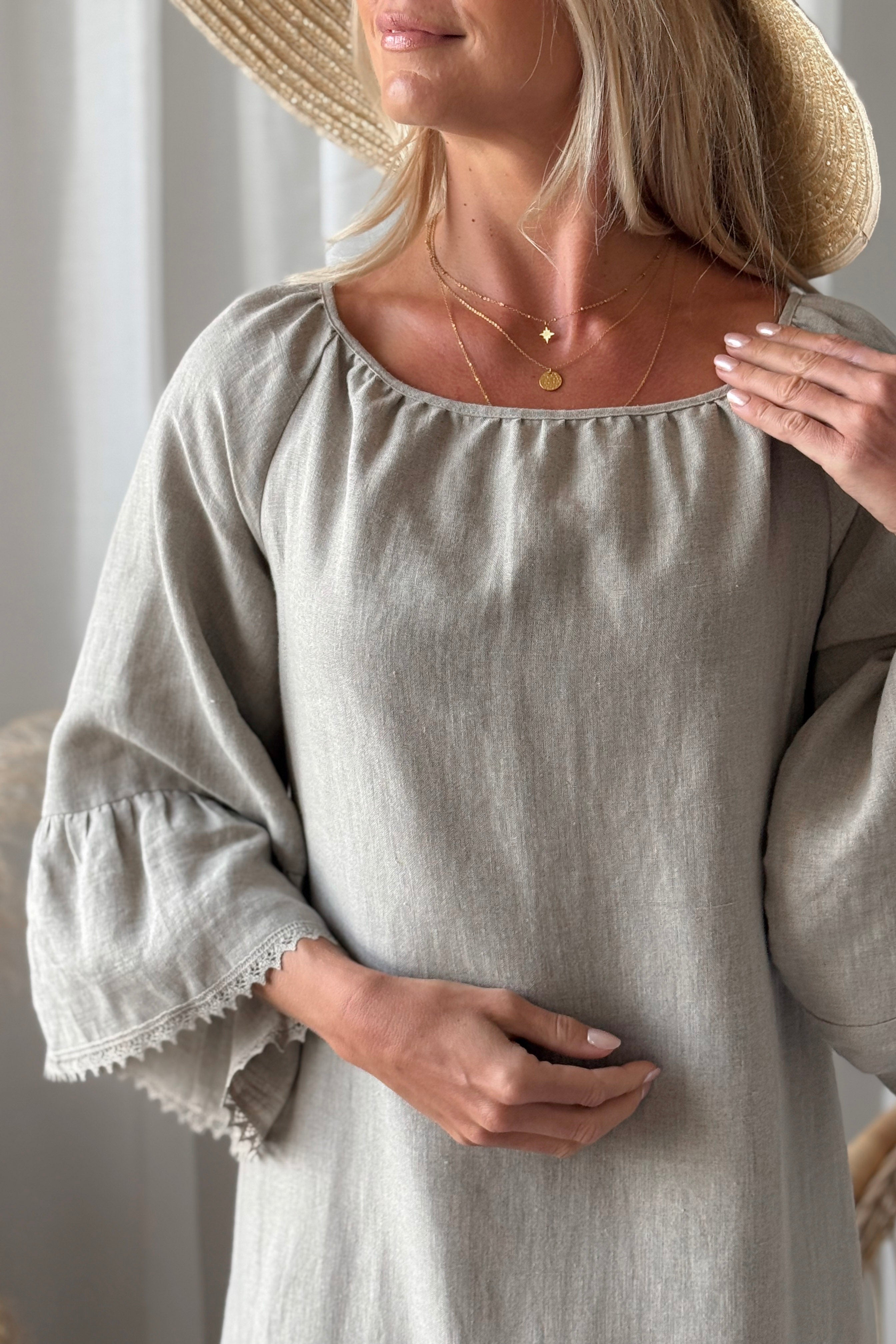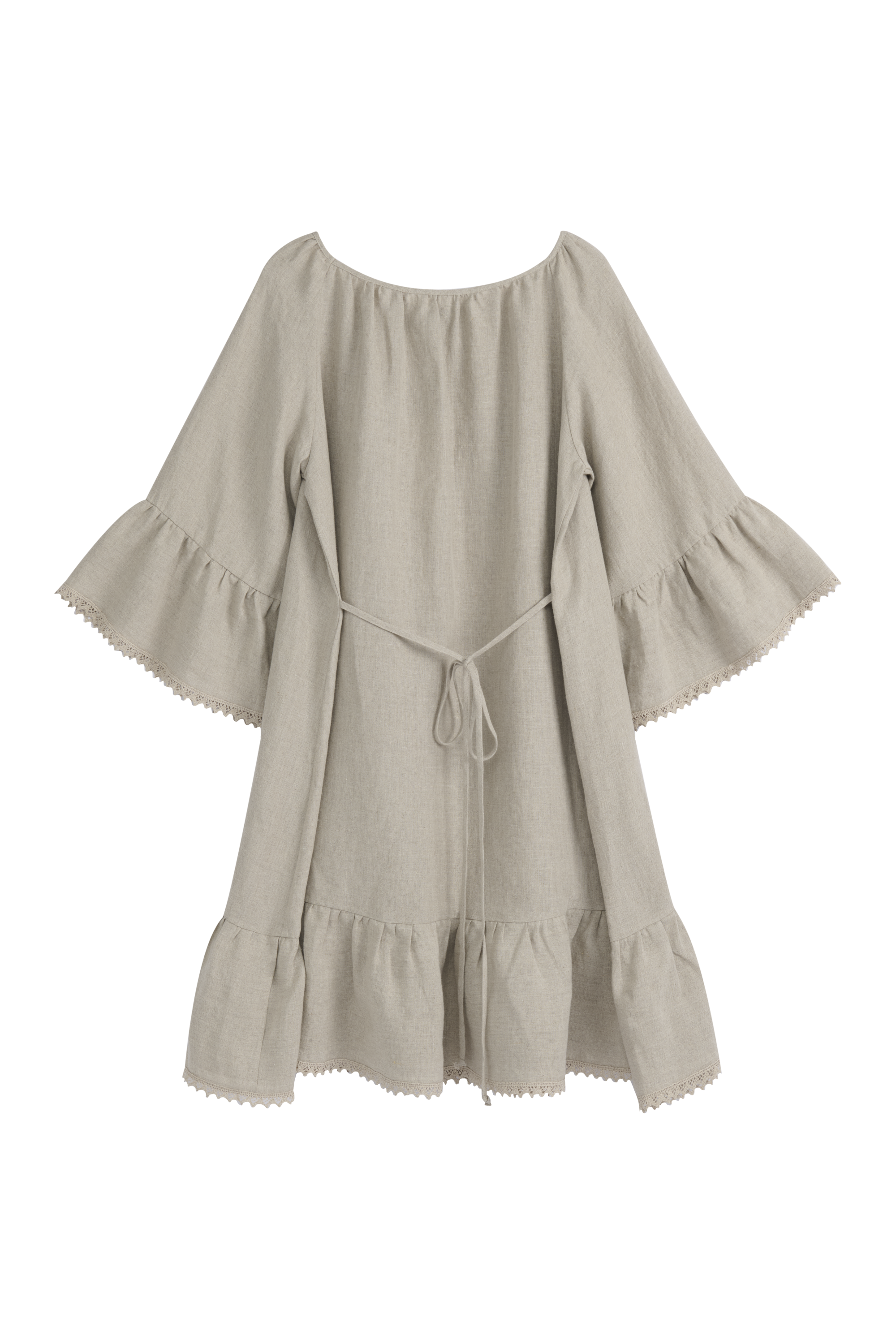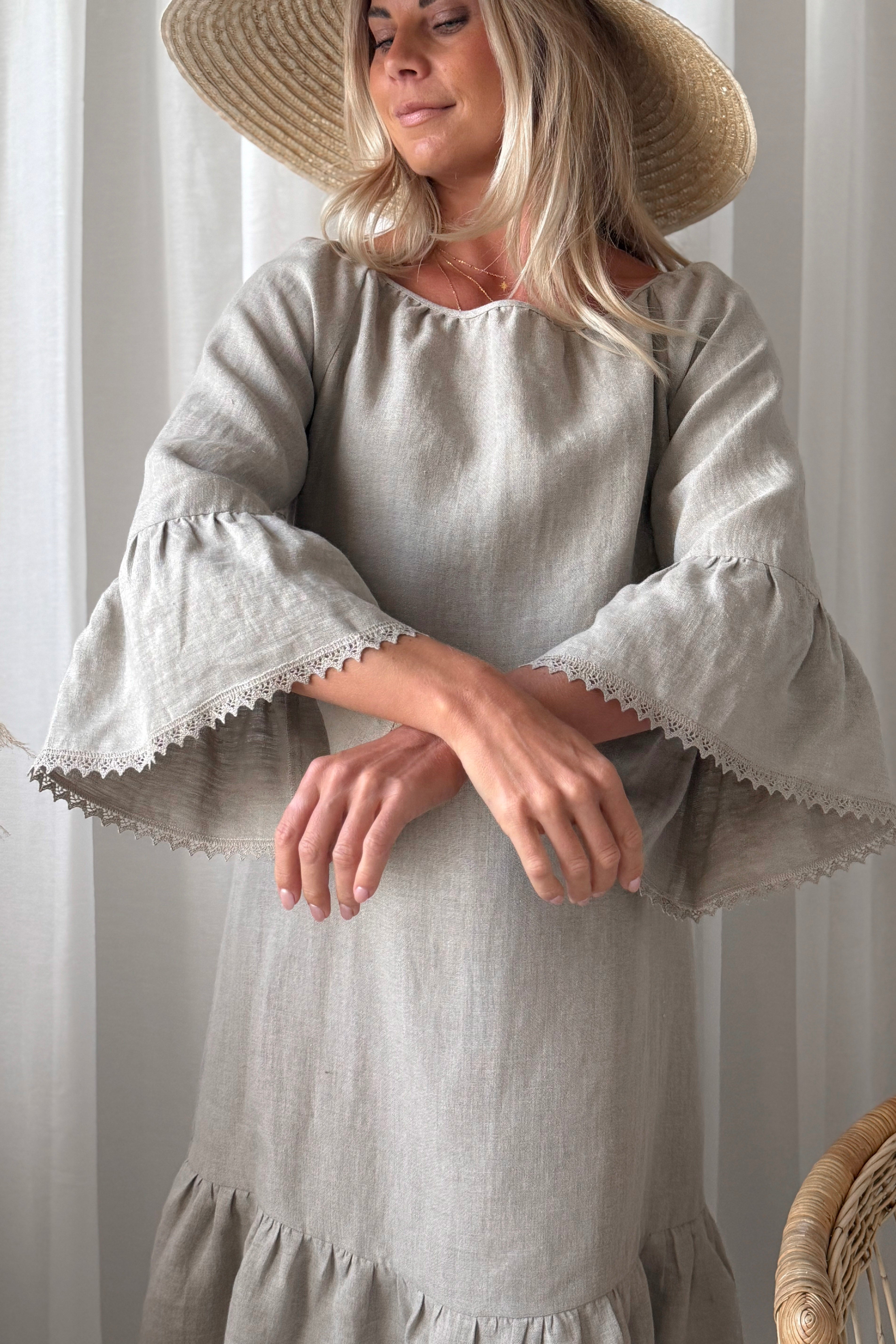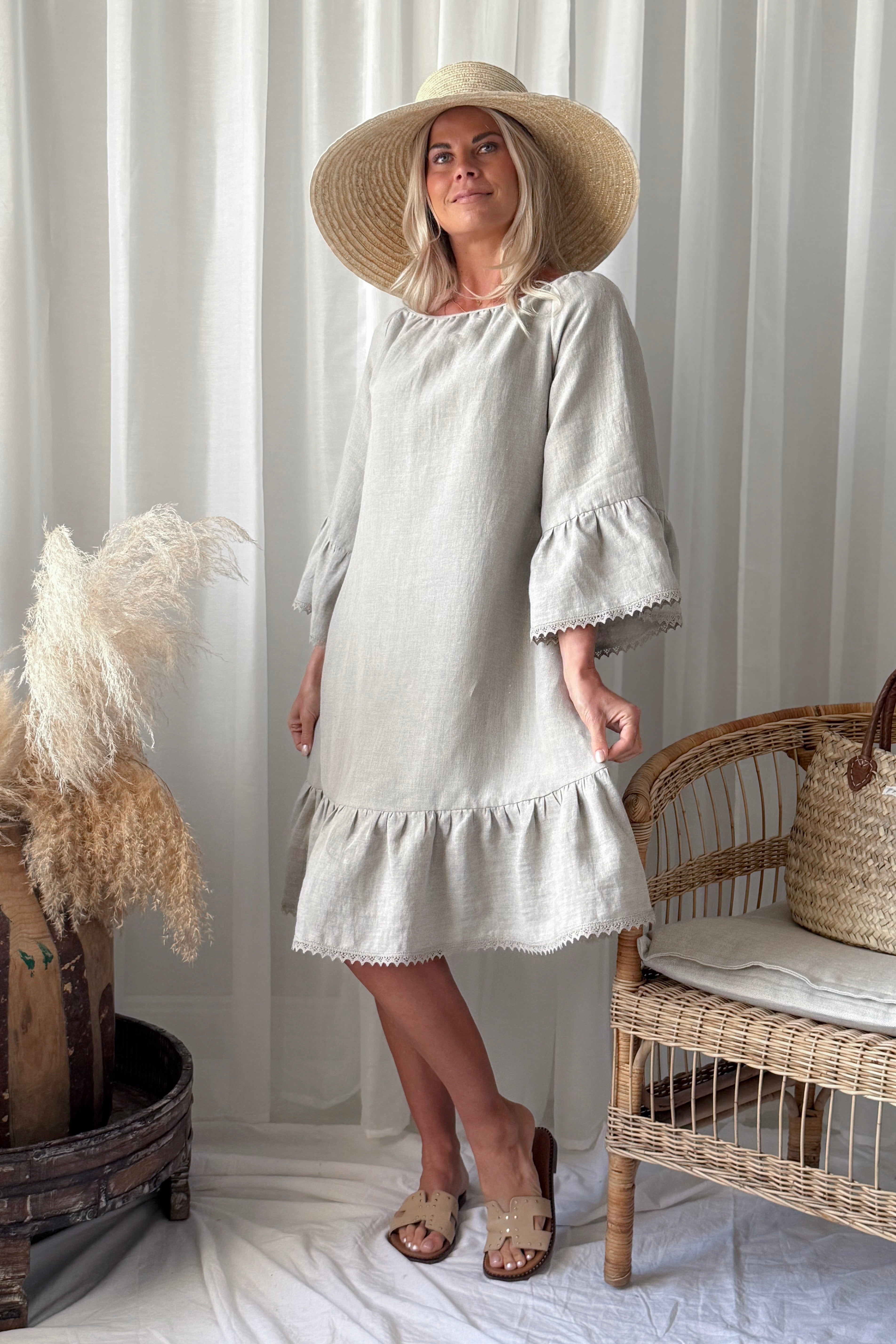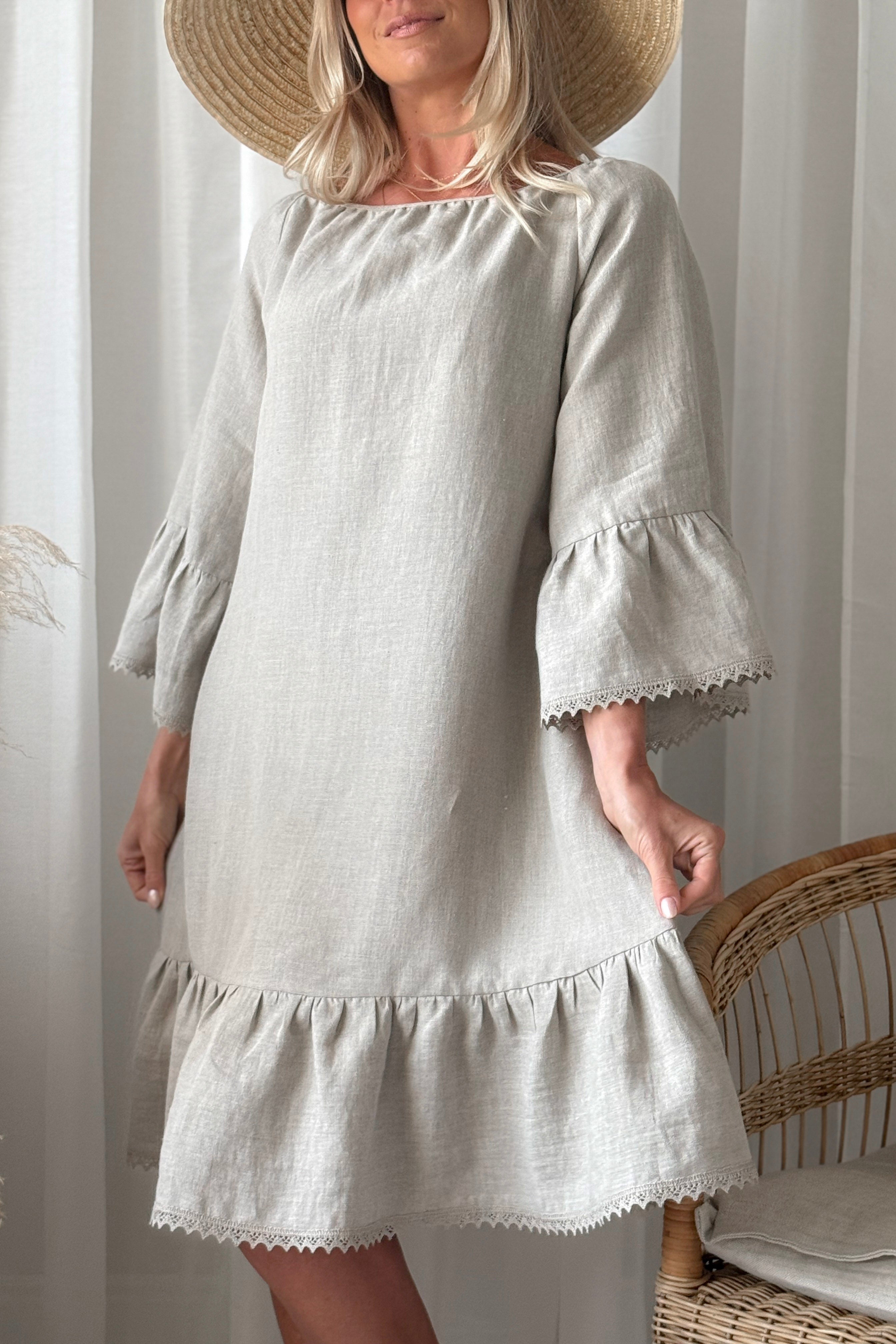 Ihanan kevyt ja naisellinen A-linjainen pellavamekko, jossa vyö korostaa vyötäröä. Levenevät 3/4-pituiset hihat, suloiset frillat ja hienovaraiset pitsiyksityiskohdat luovat herkän ja romanttisen ilmeen. Mukava ja imarteleva malli, joka sopii monenlaisille vartalotyypeille.