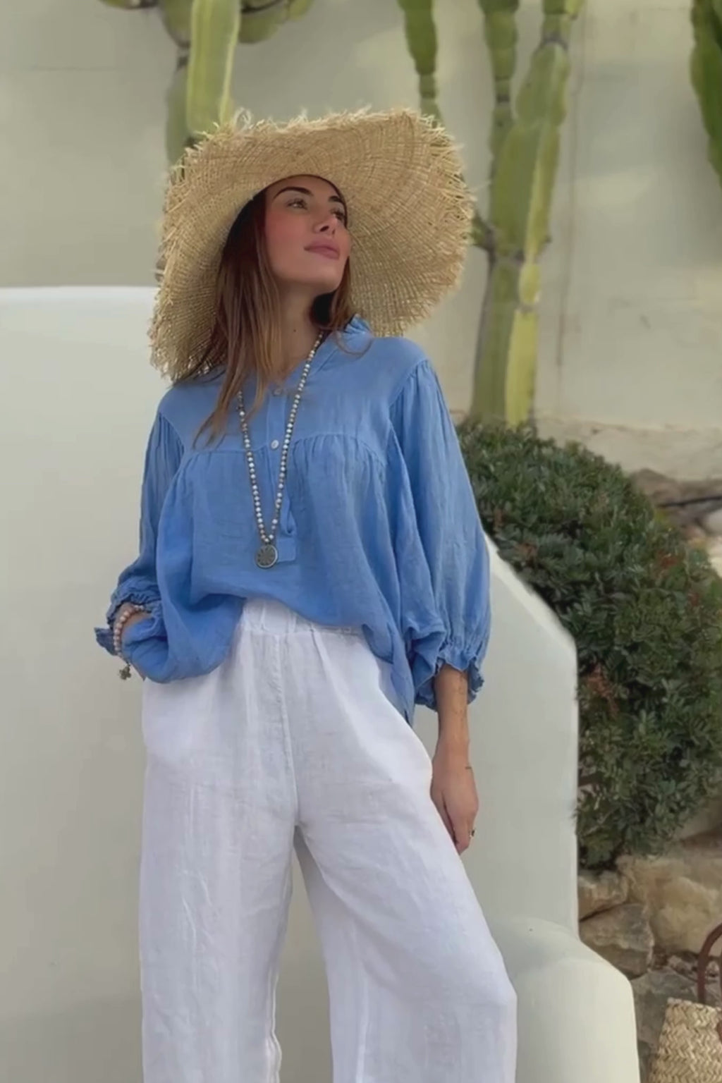 Rento ja kevyt pellavapaita leveillä hihoilla, jotka päättyvä hihansuihin resorilla. Paidassa napitus ja kaunis vaakaleikkaus rintamuksen kohdalla. Hihojen leikkaus antaa väljyyttä. Hihan resori on napakka. Kangas on kevyttä harsopellavaa, ja saumat ovat herkkiä venytykselle.