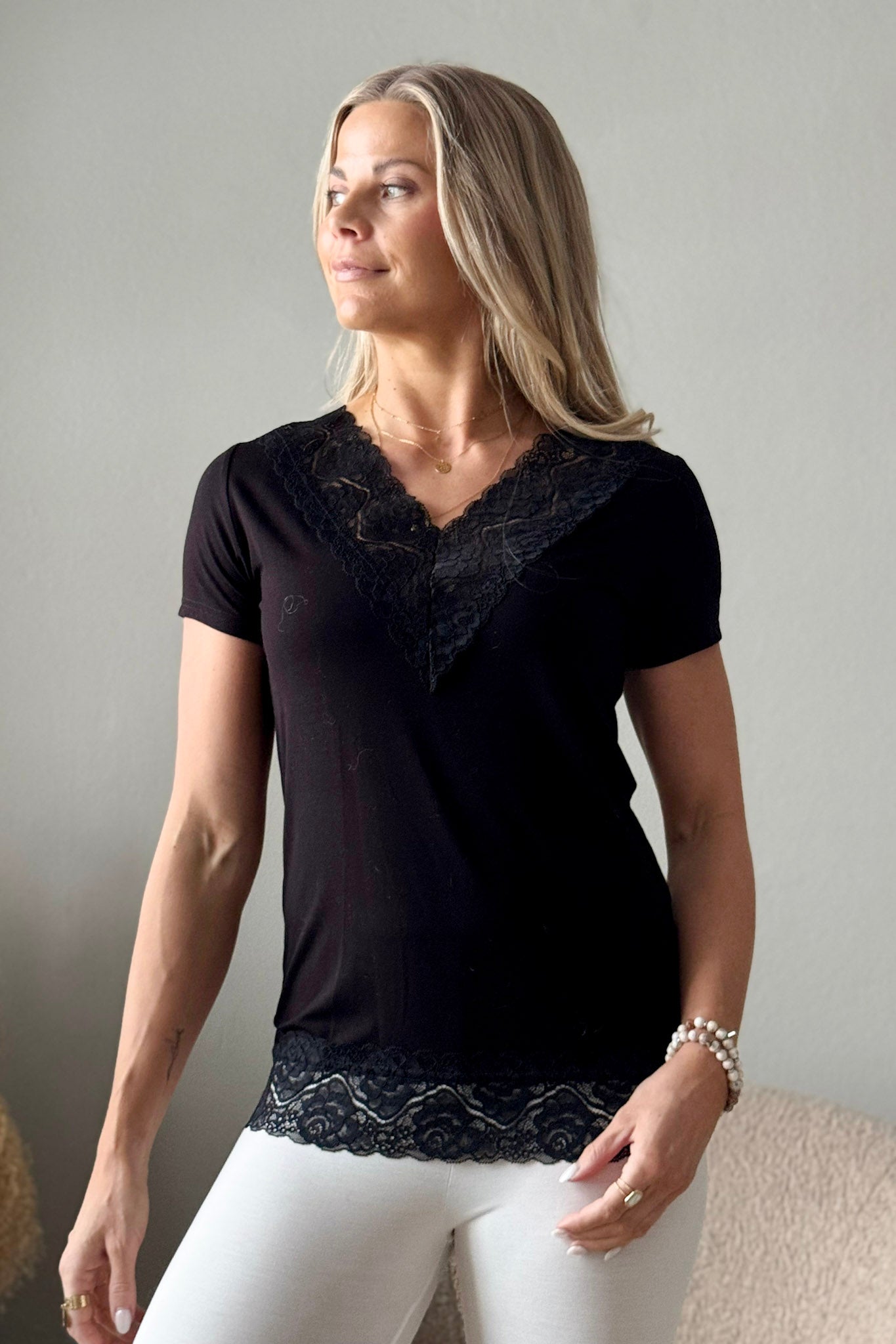 Bamboo Lace -malliston V-aukkoinen t-paita, jossa kauniit pitsiyksityiskohdat viimeistelevät pääntien ja helman. Pehmeä bambootrikoo tuntuu iholla silkinpehmeältä, on ylellisen mukava ja hengittävä käyttää. Joustavat ja laadukkaat pitsit tuovat t-paitaan hienostunutta ilmettä ja kaunista kiiltoa.