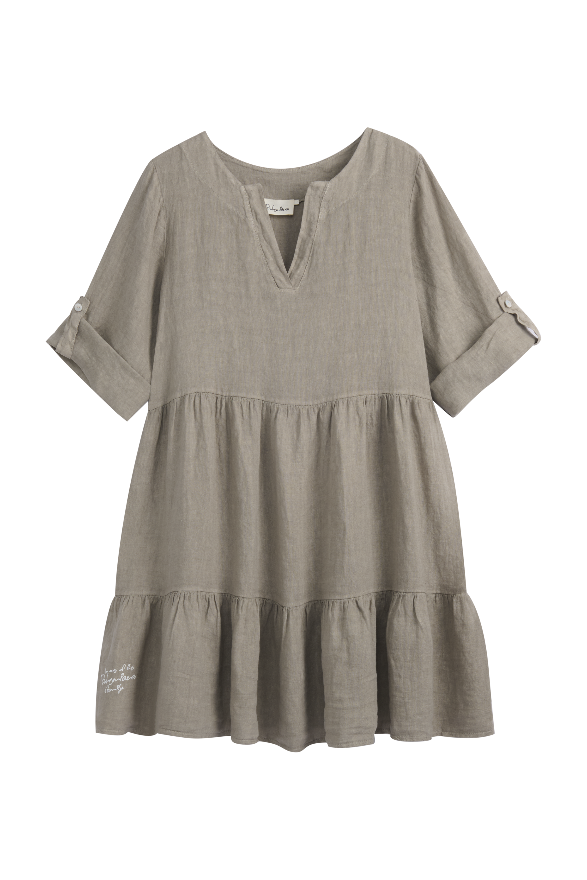 Rennon romanttinen, polvipituinen pellavamekko, jossa frillat helmassa, pääntie v-aukolla ja napeilla käärittävät hihat.