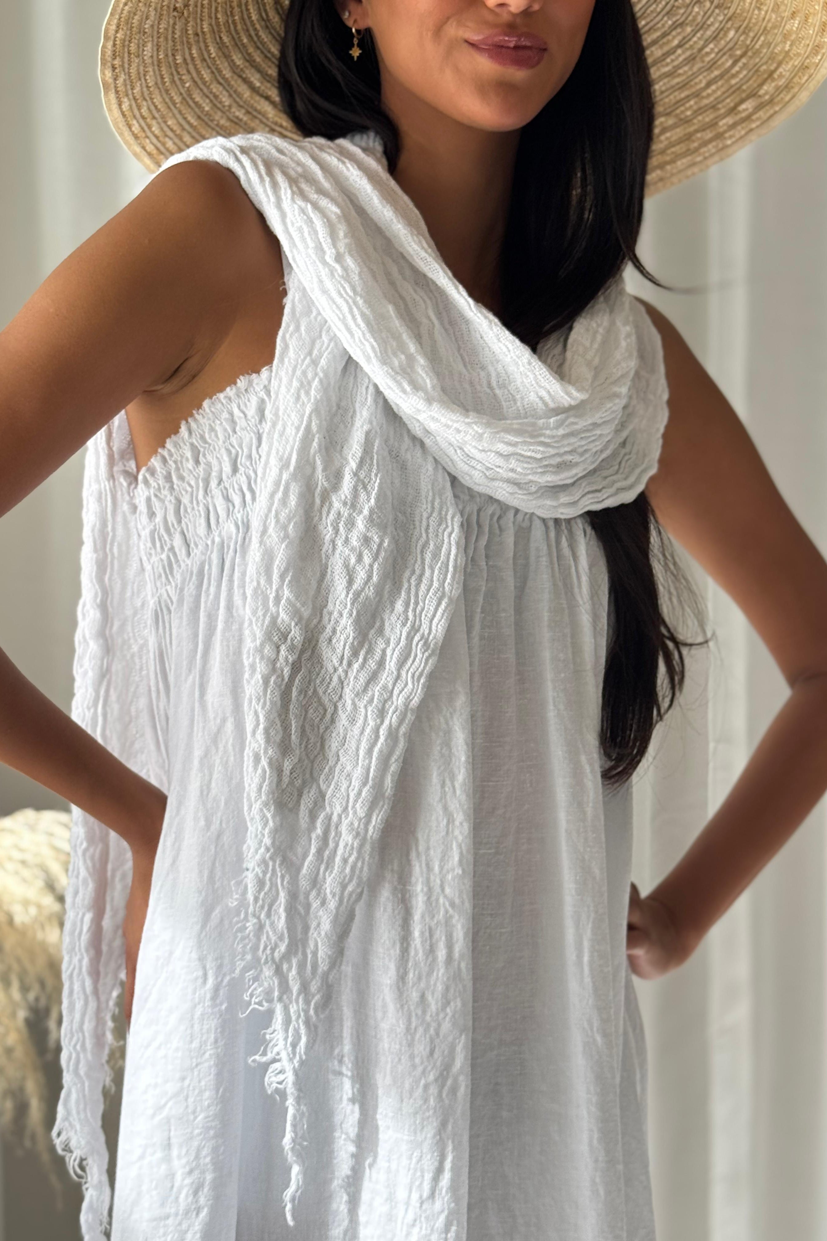 Pellavahuivi, jossa mieletön harsomainen pesu ja käsittely. Kevyt ja ihanan rouhea 100% pellavaa ja sopii asuun kuin asuun. Pehmeä ja rypytetty kangas tuo rentoa eleganssia, ja sen monikäyttöisyys mahdollistaa niin hartiahuivina pidettynä kuin kaulaan kiedottuna. Täydellinen valinta viileisiin iltoihin tai auringolta suojautumiseen.