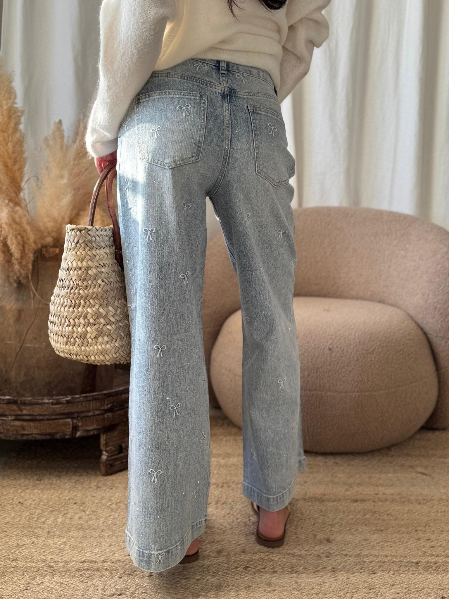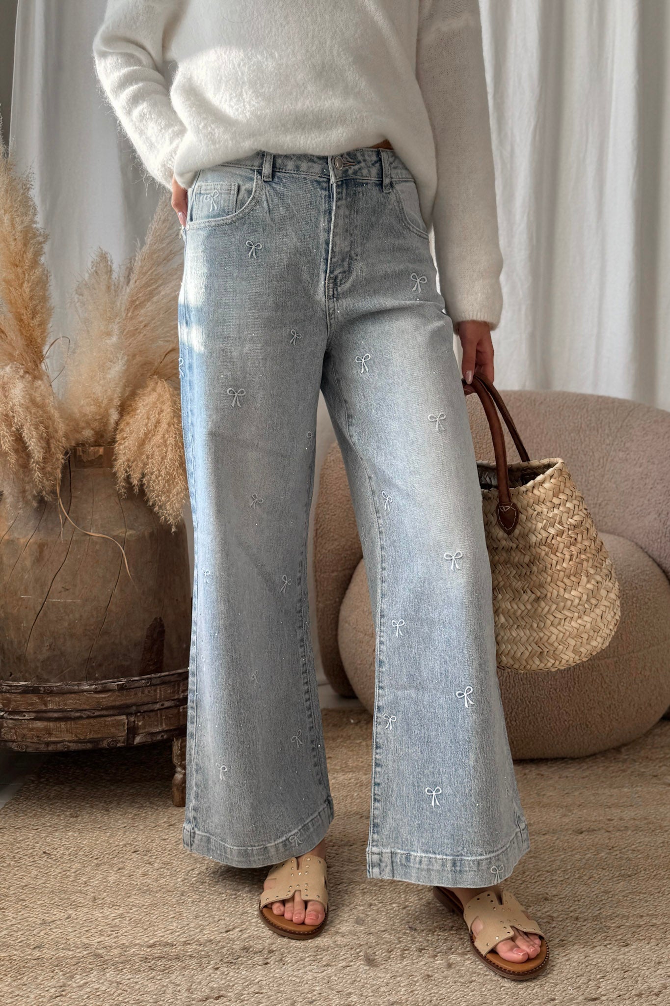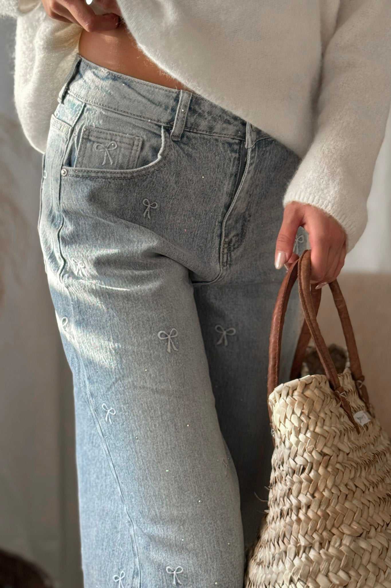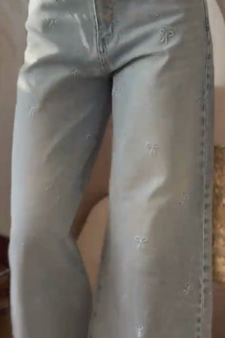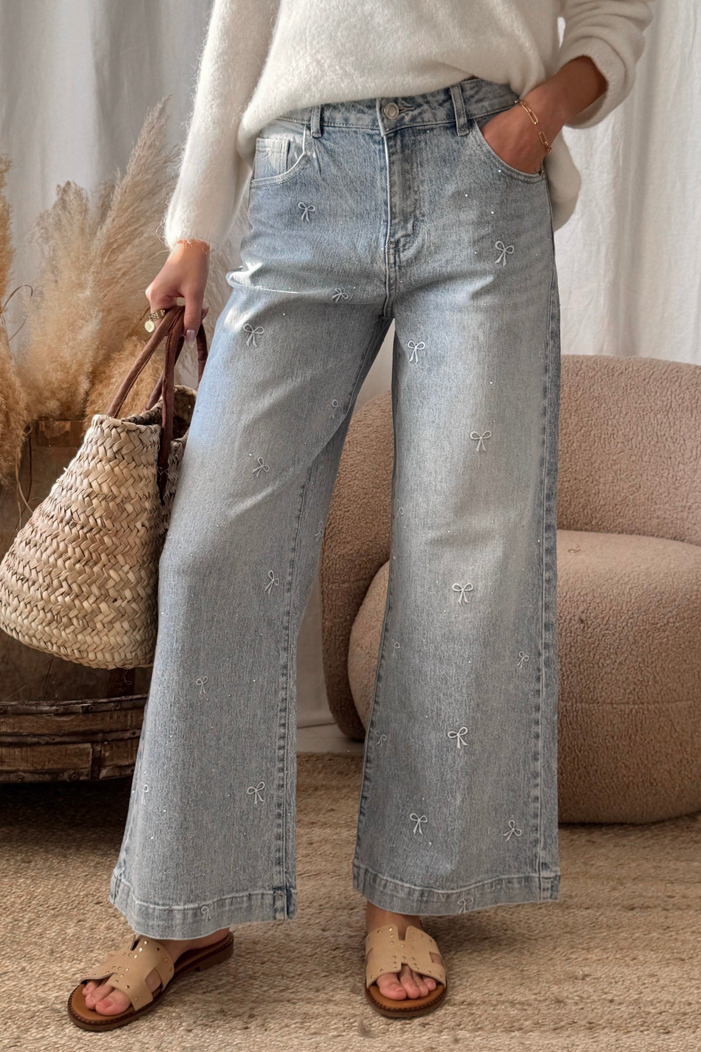 Nämä näyttävät farkut yhdistävät naisellisen ilmeen ja mukavuuden. Farkuissa on kauniita brodeerattuja rusetteja sekä säihkyvää blingiä, jotka tuovat asuun ripauksen glamouria. Malli sopii erityisesti pitkille, ja pehmeä, joustava materiaali takaa miellyttävän istuvuuden koko päiväksi. Käytännölliset taskut edessä ja takana viimeistelevät kokonaisuuden. Täydellinen valinta, kun haluat farkuilta sekä näyttävyyttä että käyttömukavuutta. Farkut pienempää kokomitoitusta.