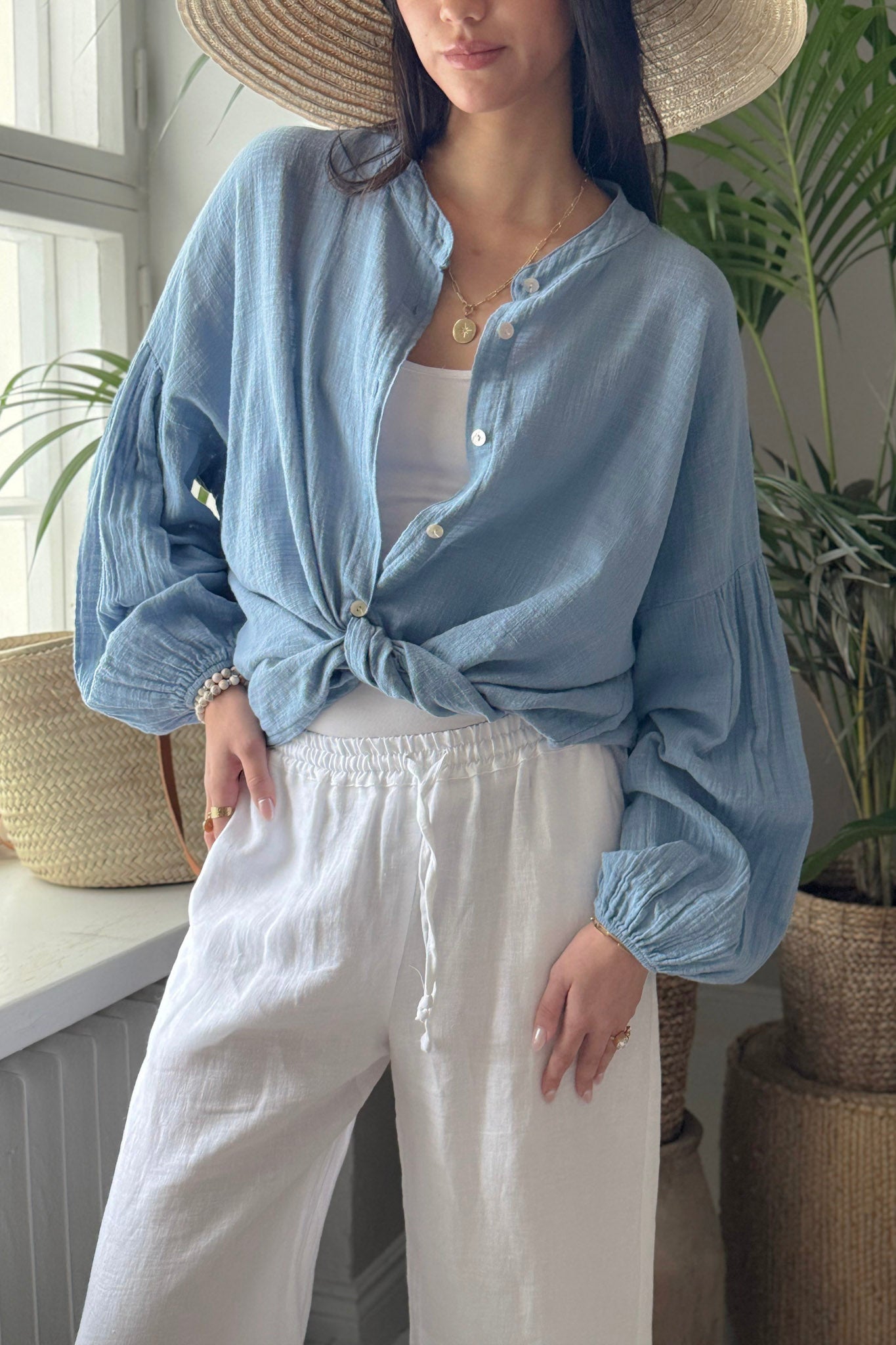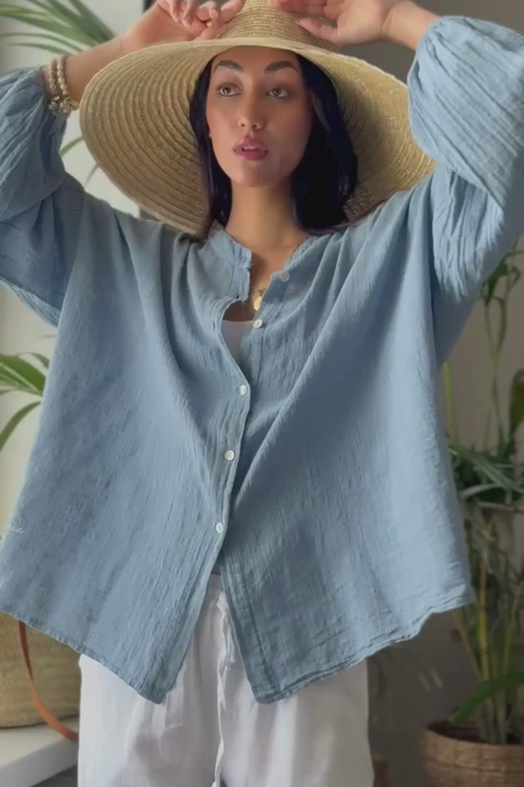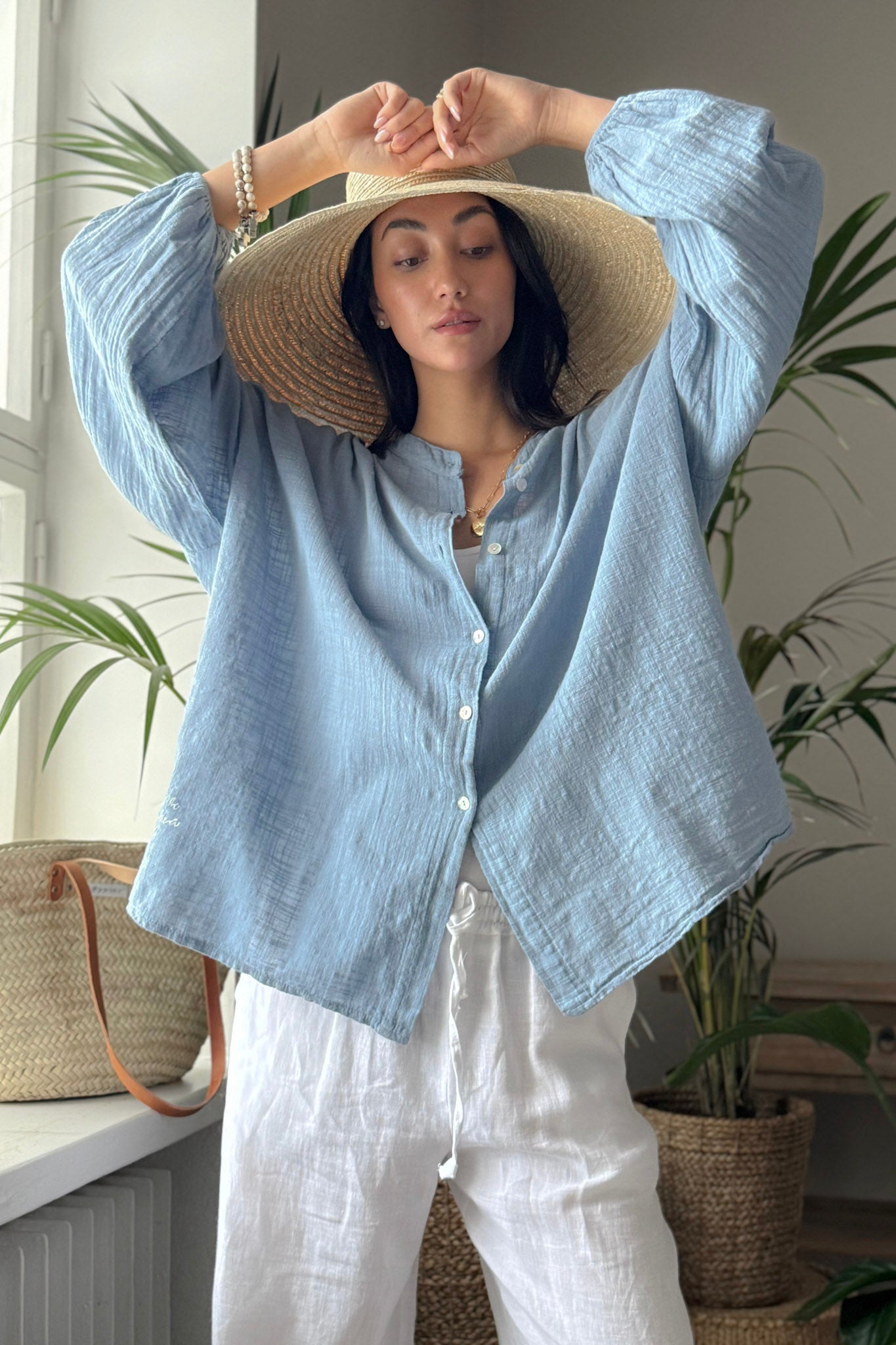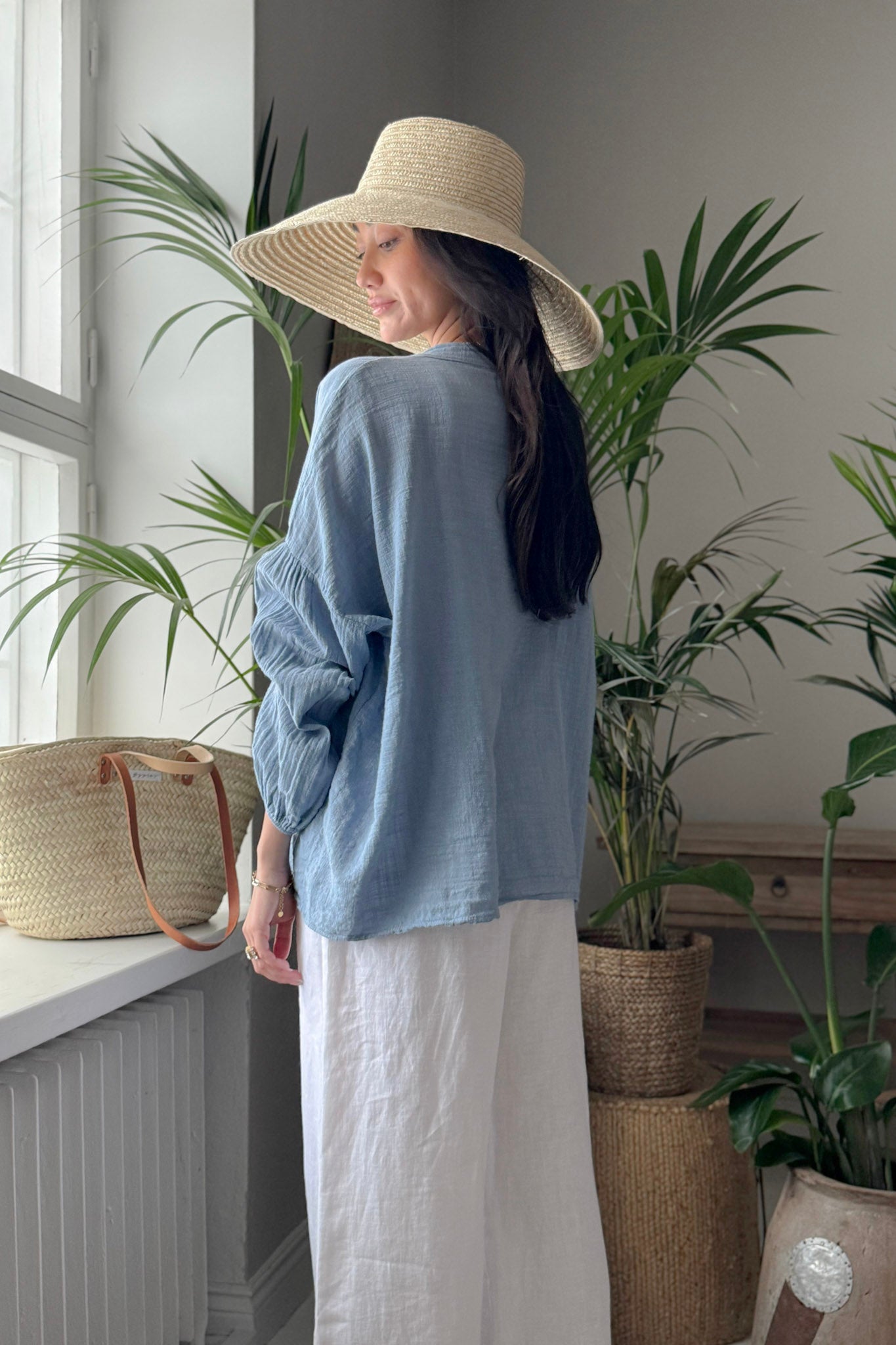 Rento ja ilmava Chalky on ihanan pehmeää harsopuuvillaa. Pyöristetty helma, madalletut olkapäät sekä puhvimaiset hihat tekevät tästä monikäyttöisen luottopaidan. Asusta ihanilla riipuksilla ja kevyillä huiveilla.