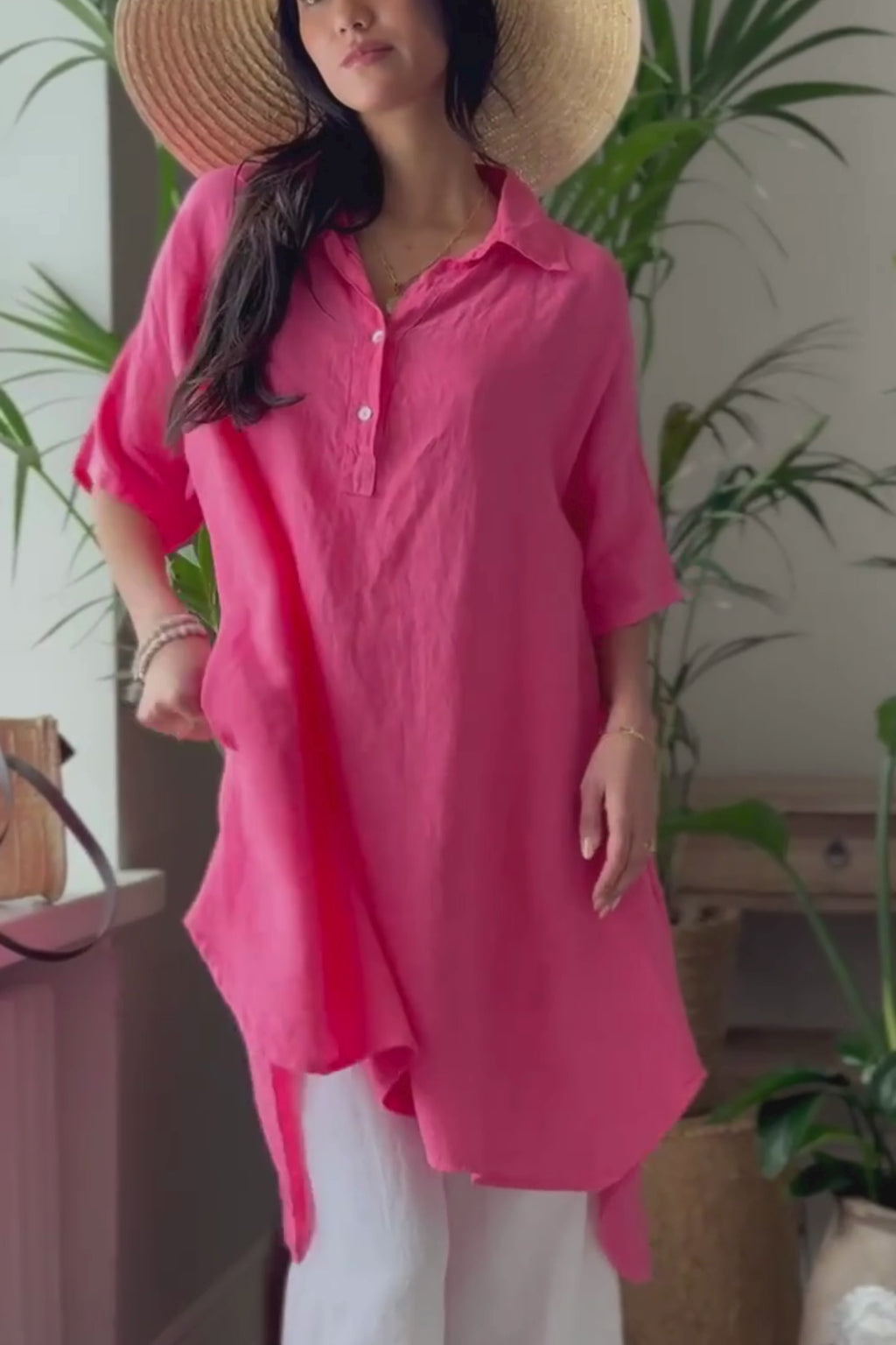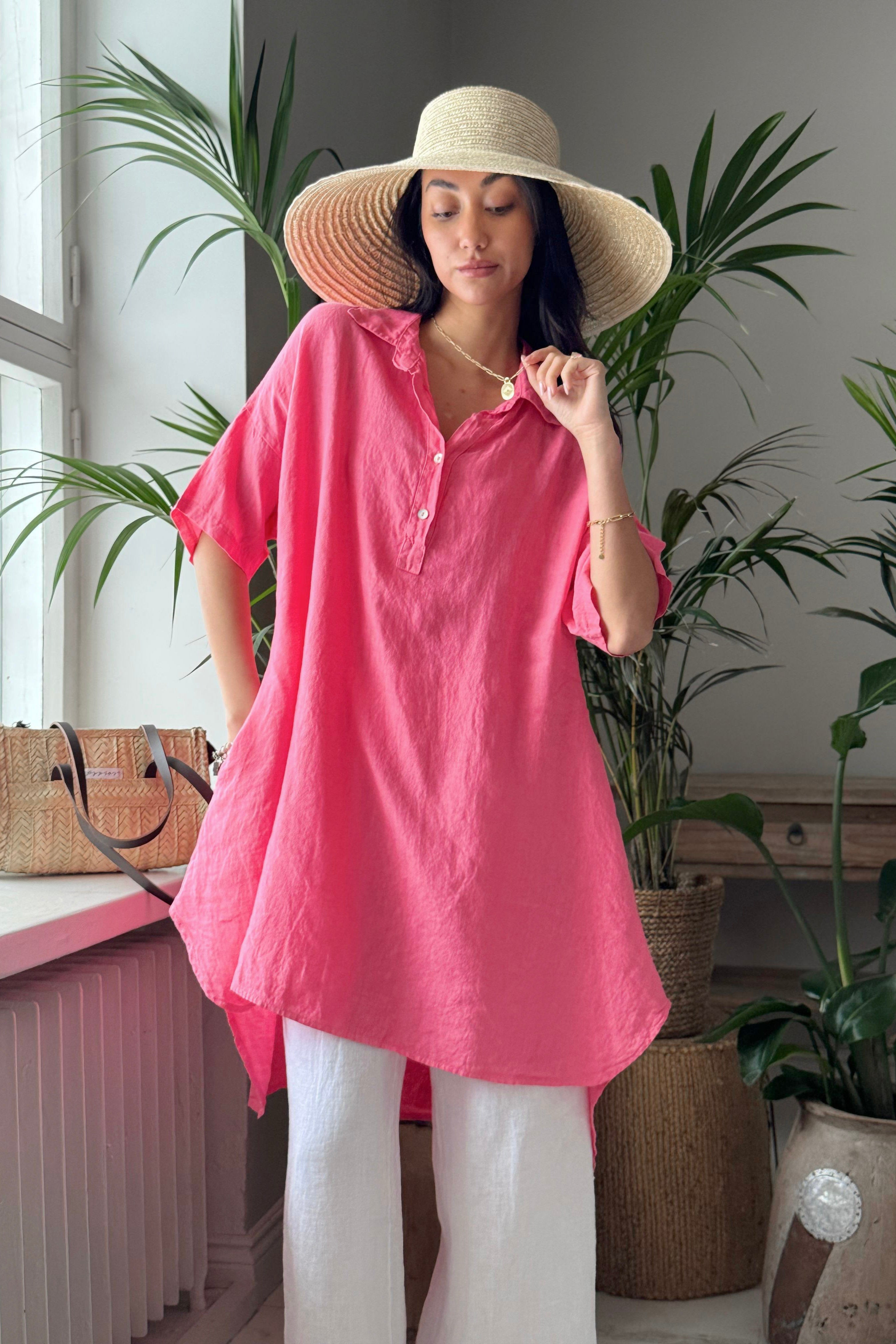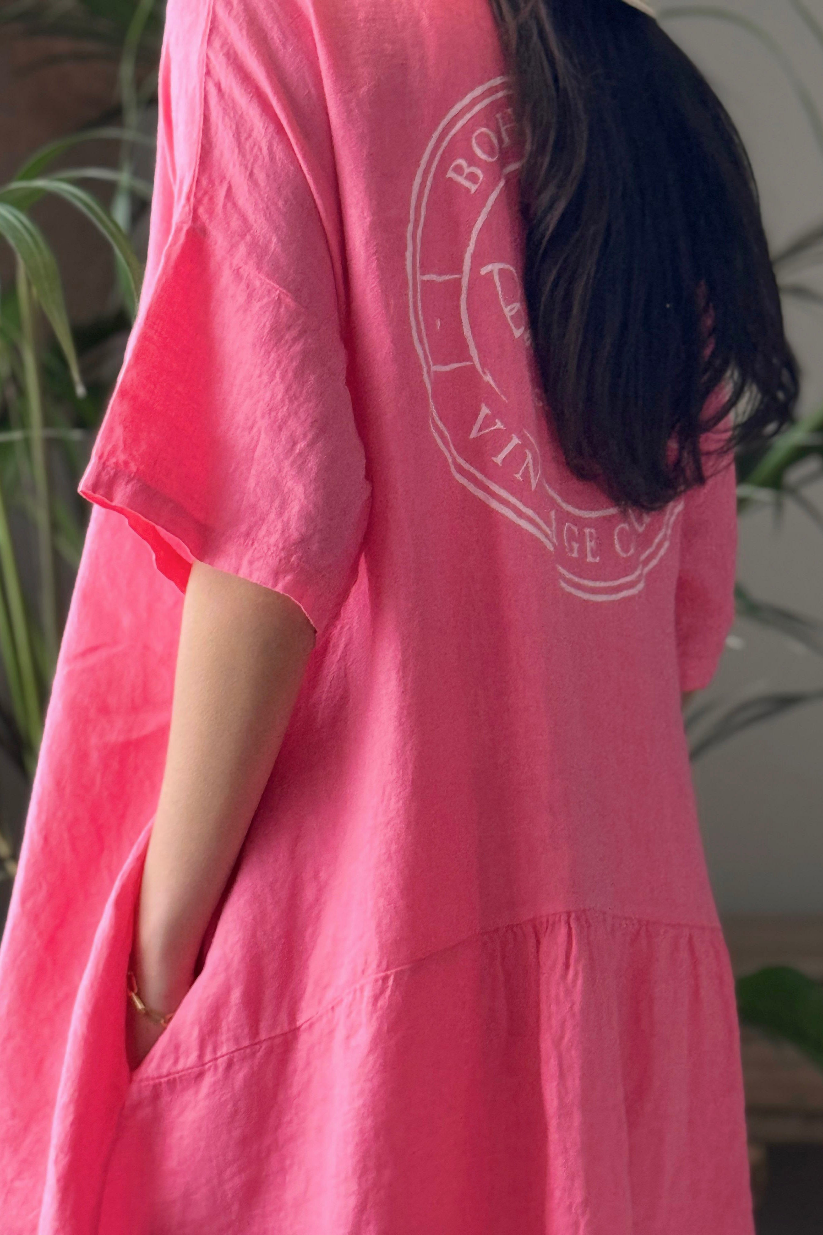 Mukava ja rento tunikamallinen pellavapaita. Yhdistä helposti esimerkiksi pellavahousujen kanssa. Pääntiessä on edessä kaksi nappia. Paidassa on lyhyet hihat madalletuilla olkapäillä ja sivuissa on taskut. Paita on pidempi takaa. Selässä on Bohemianan "Vintage Club" -painatus sekä kaunis vaakaleikkaus.