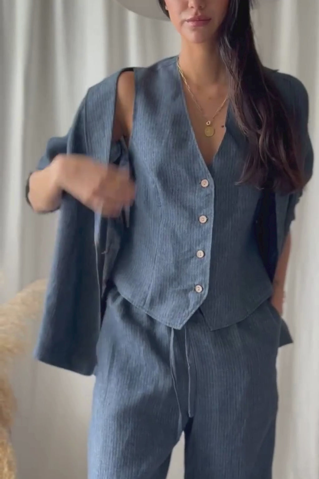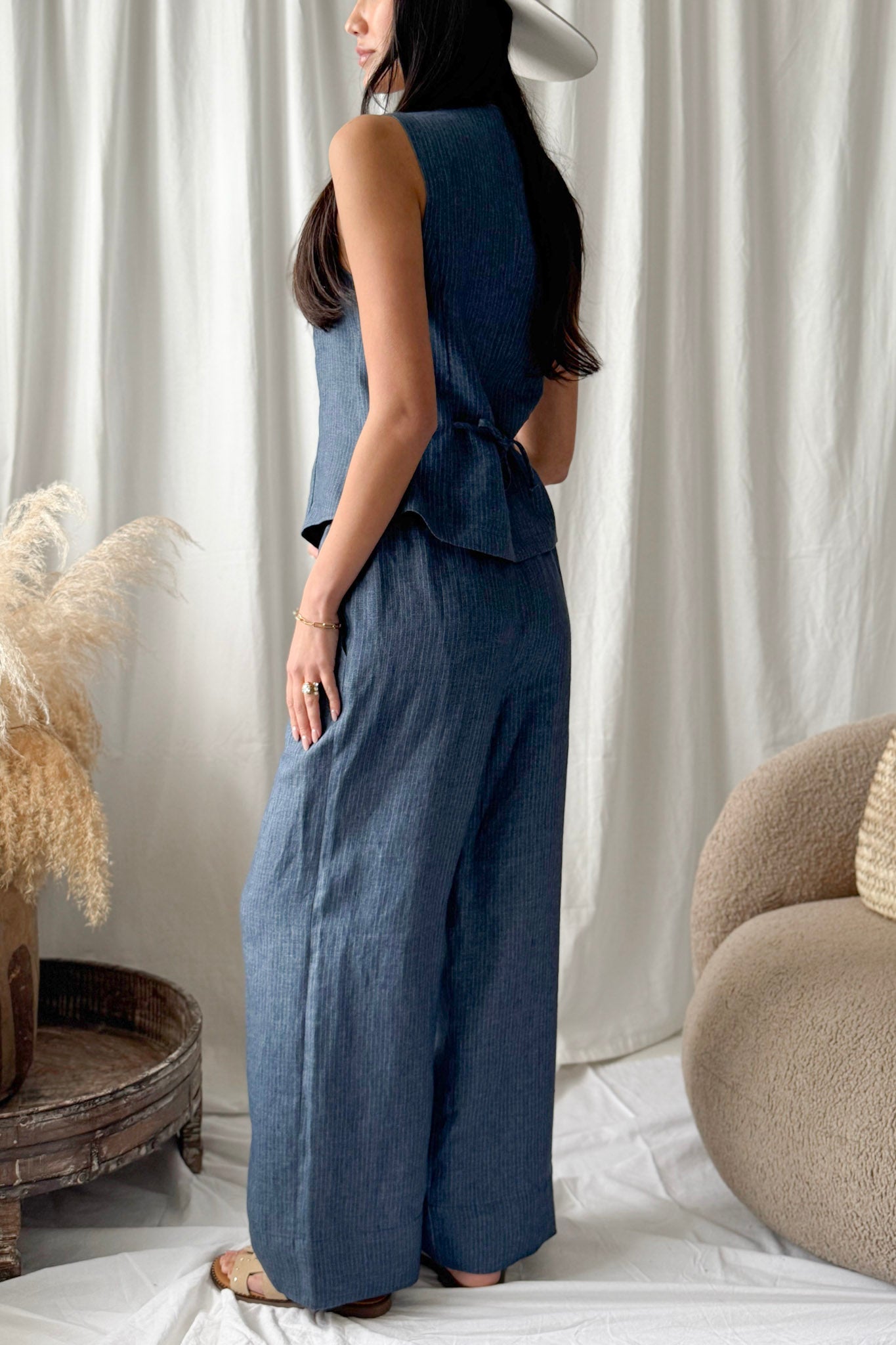 Ajaton ja upea naisellinen pellavaliivi, jossa on ryhdikäs malli ja napitus edessä. Selässä olevat solmittavat säätönauhat mahdollistavat istuvuuden säätämisen, ja sivuilta sisäänotettu leikkaus tuo liiviin trendikkään siluetin.