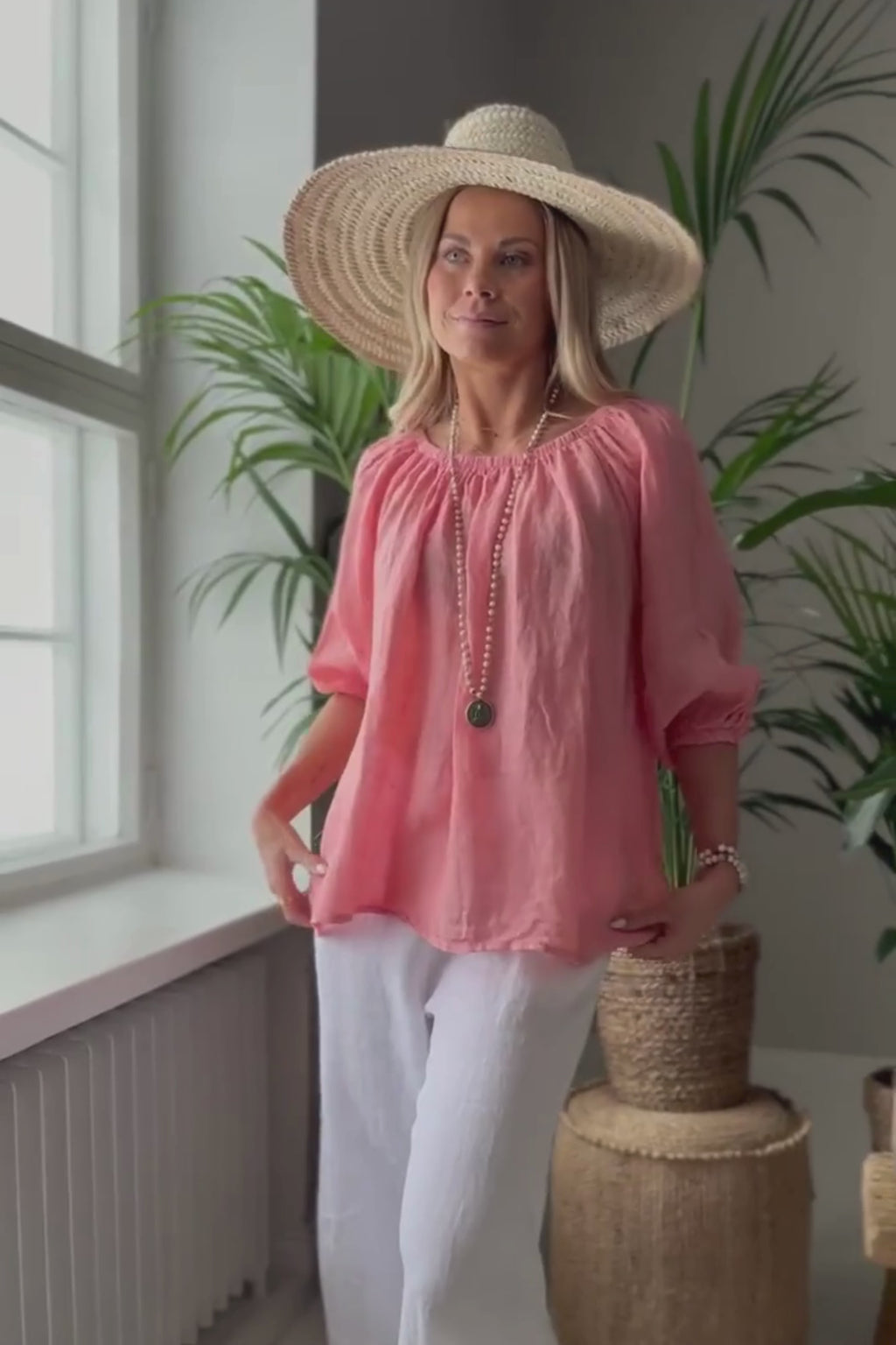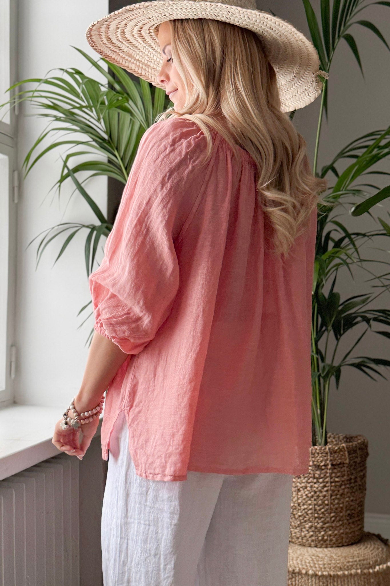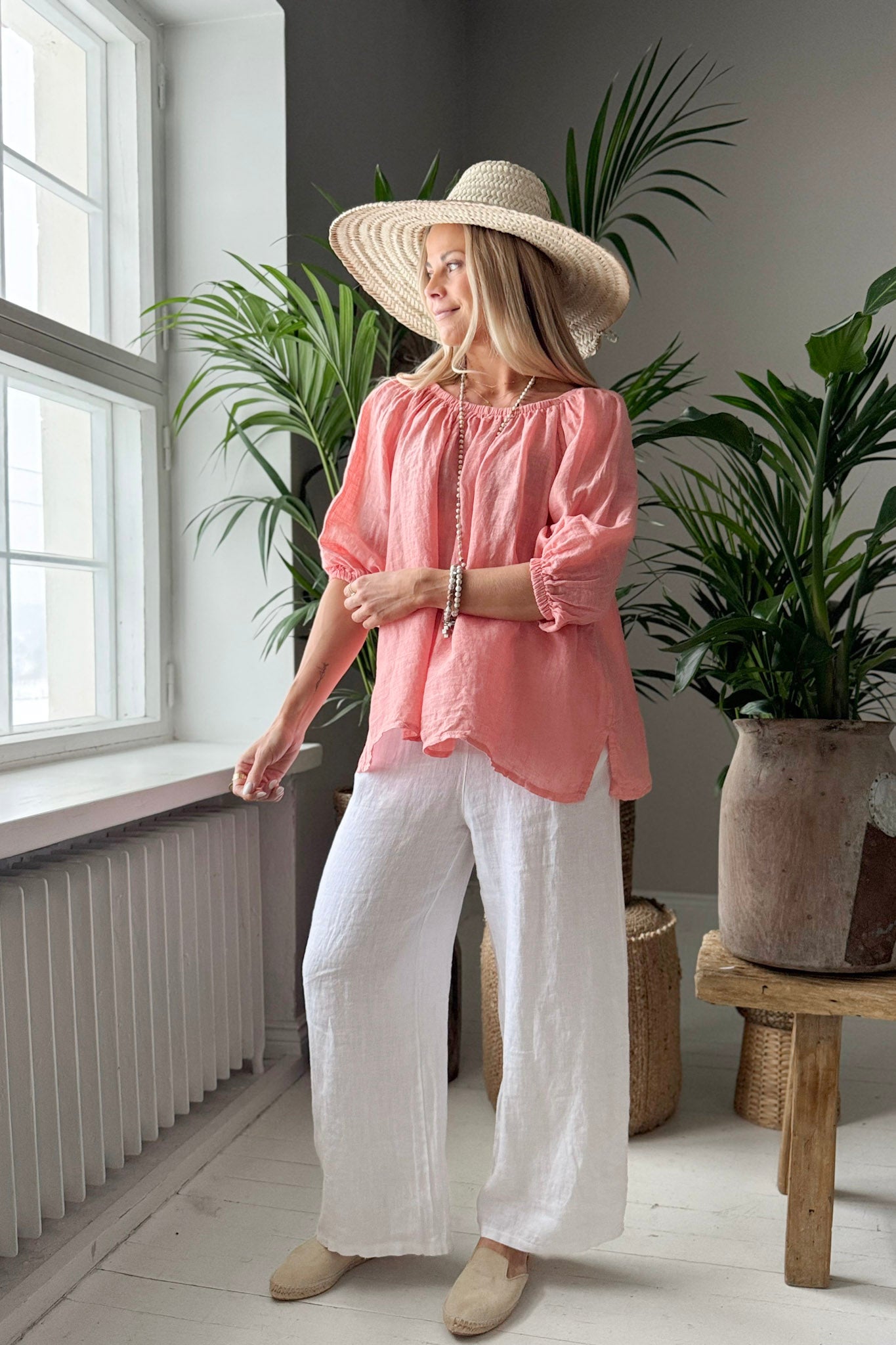 Ihanan kepeä ja romanttinen pellavapaita. Paidan ihanat yksityiskohdat luo resori-pääntie ja sen alla oleva rypytys. Pehmeän resorin ansiosta paitaa voi käyttää myös off-shoulder mallisena. Hihat ovat 3/4-pituiset ja hihansuissa on resorit. Paidan sivuissa on pienet halkiot. Bohemiana Family -painatus helmassa.