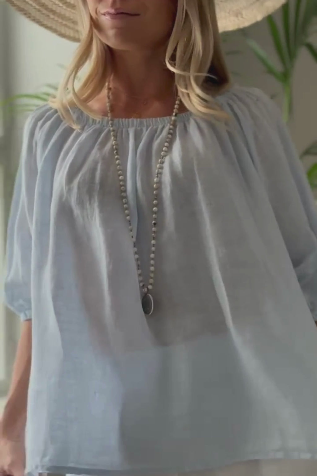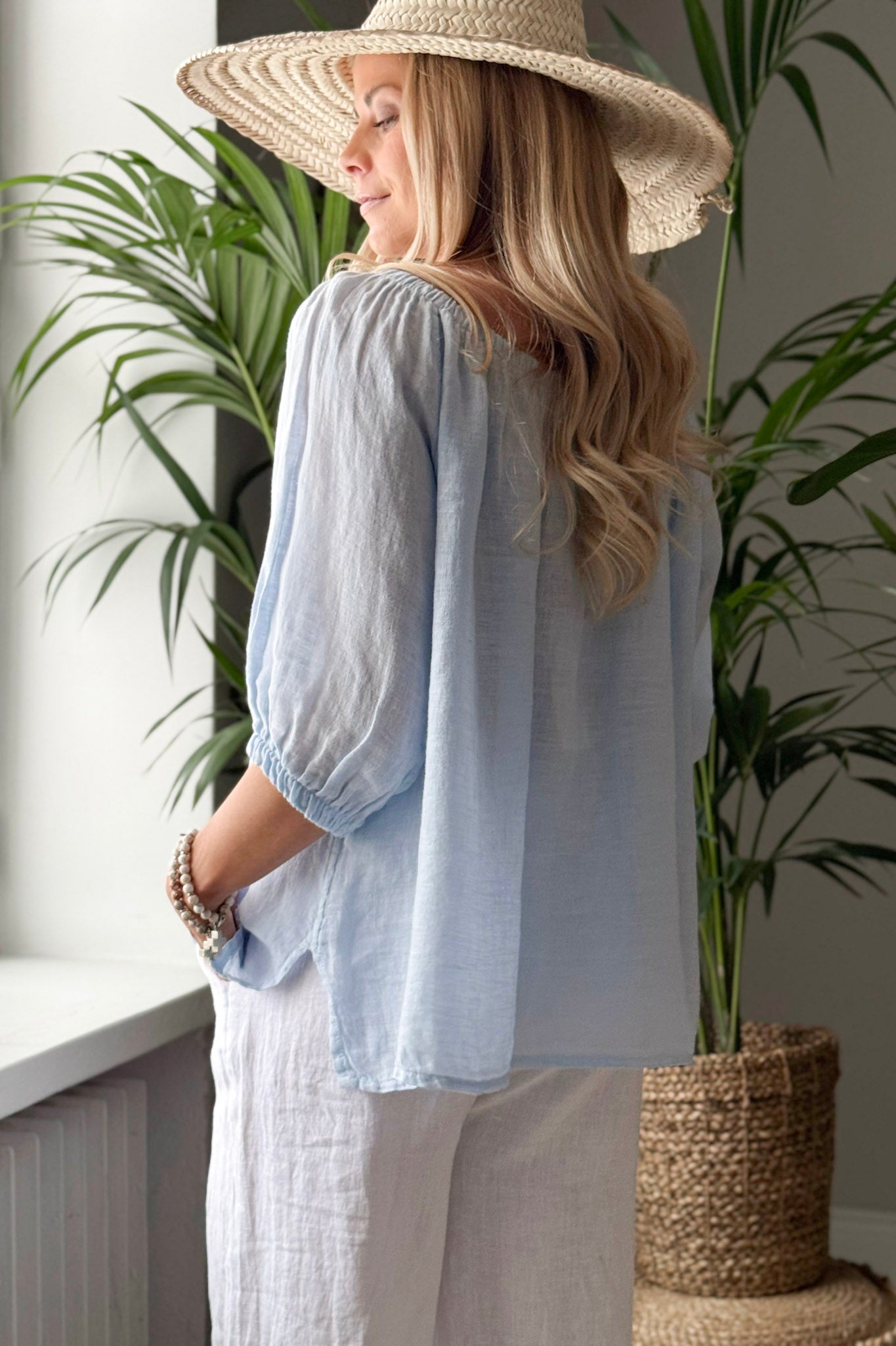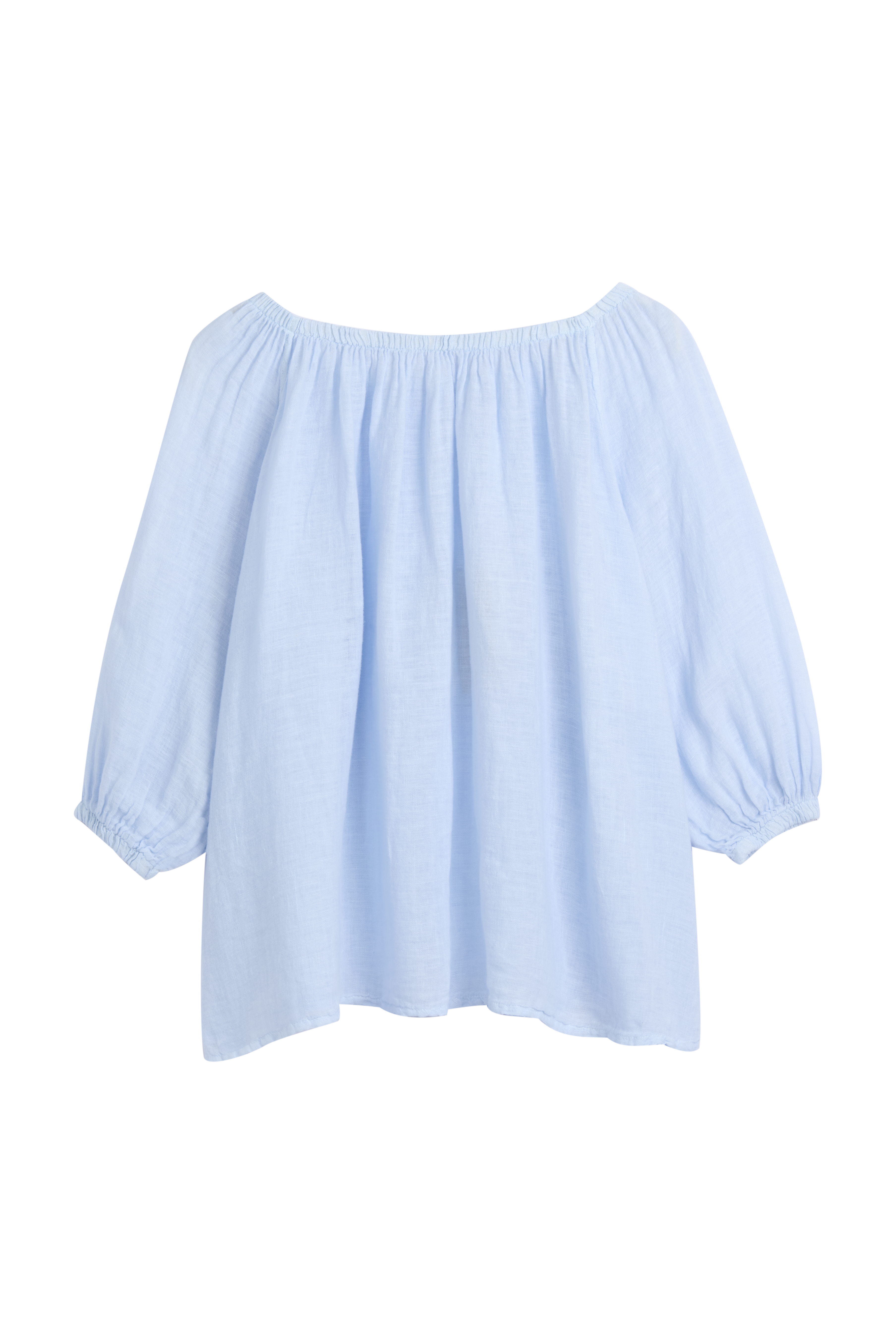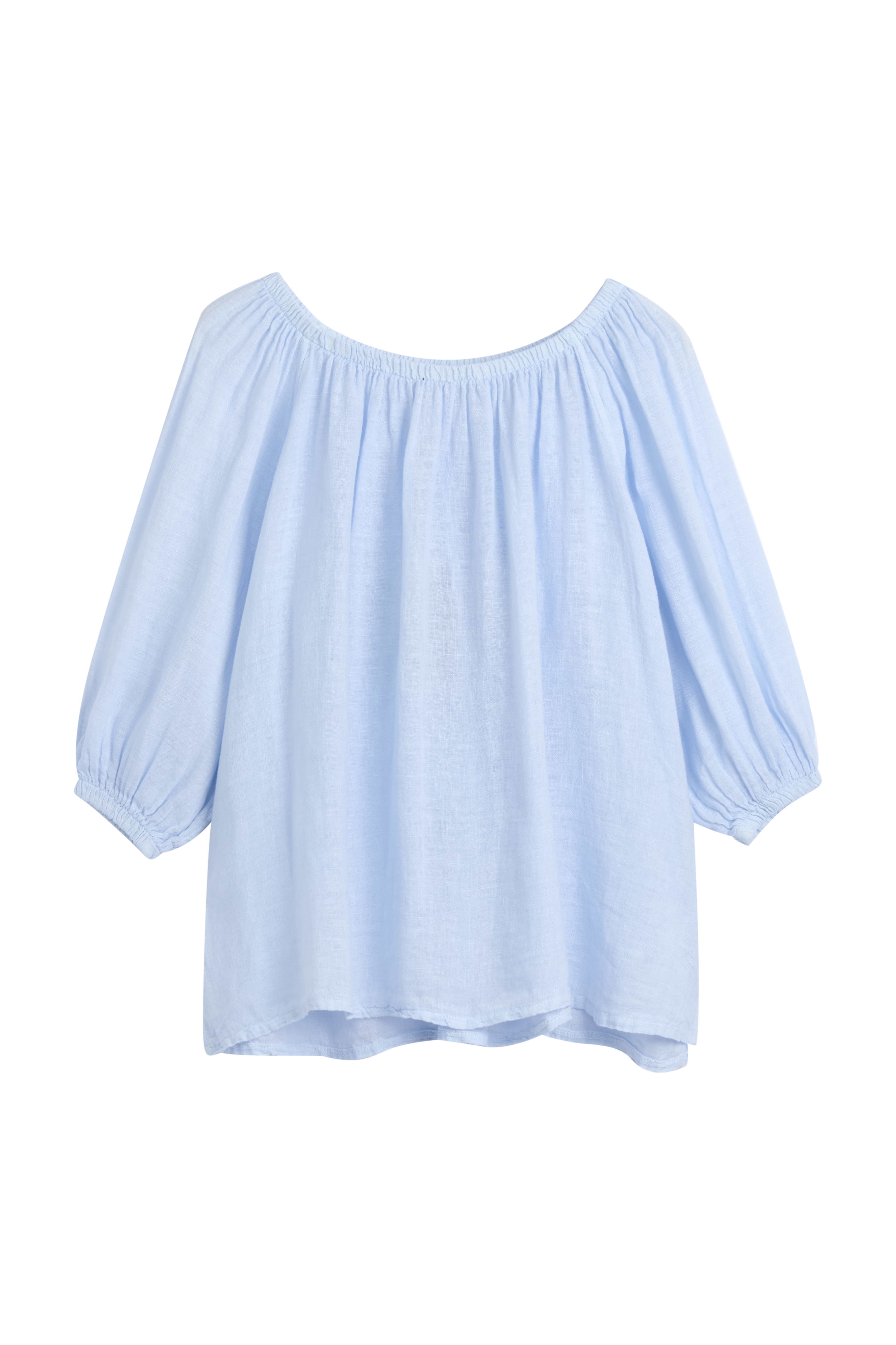 Ihanan kepeä ja romanttinen pellavapaita. Paidan ihanat yksityiskohdat luo resori-pääntie ja sen alla oleva rypytys. Pehmeän resorin ansiosta paitaa voi käyttää myös off-shoulder mallisena. Hihat ovat 3/4-pituiset ja hihansuissa on resorit. Paidan sivuissa on pienet halkiot. Bohemiana Family -painatus helmassa.