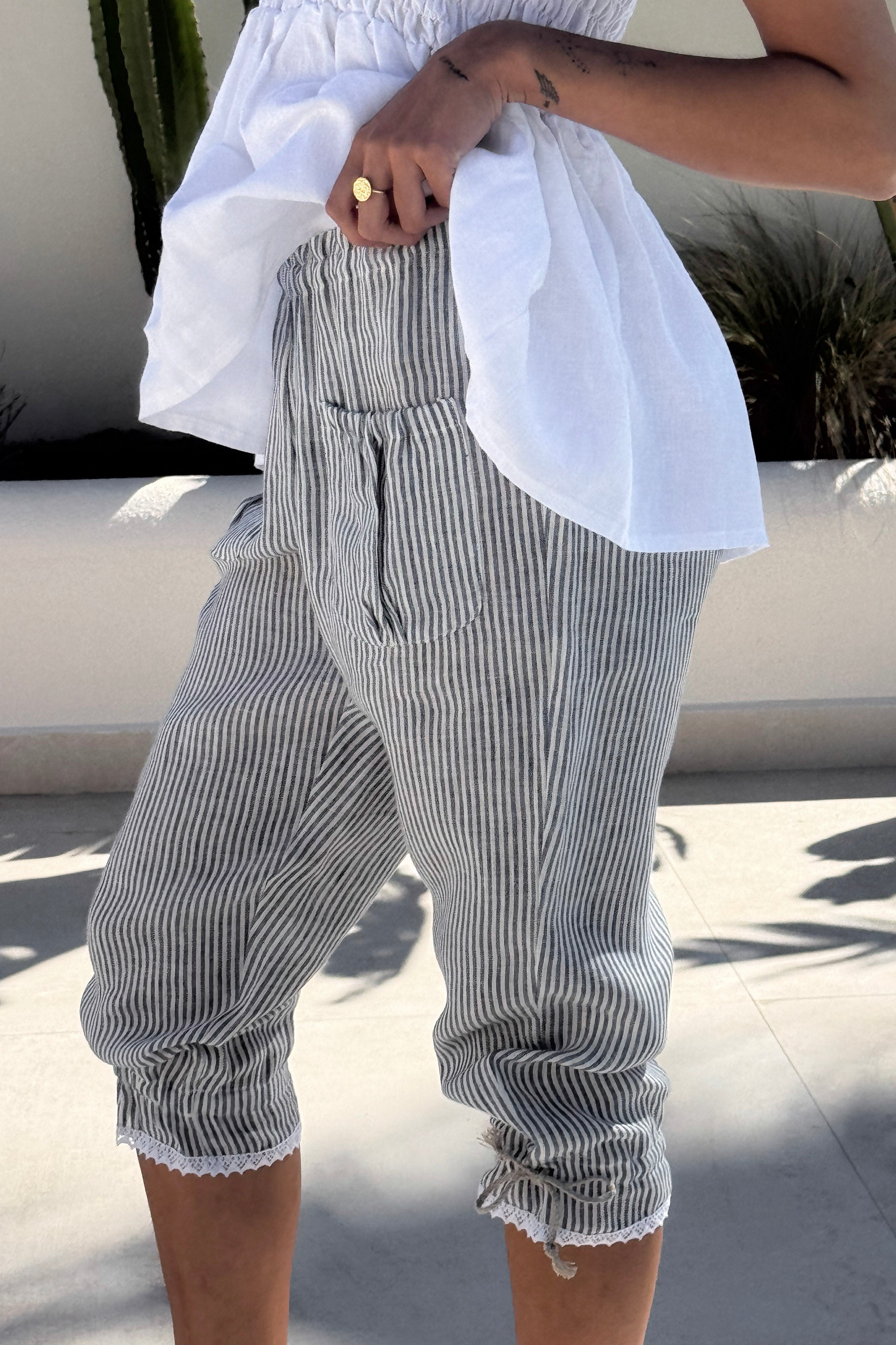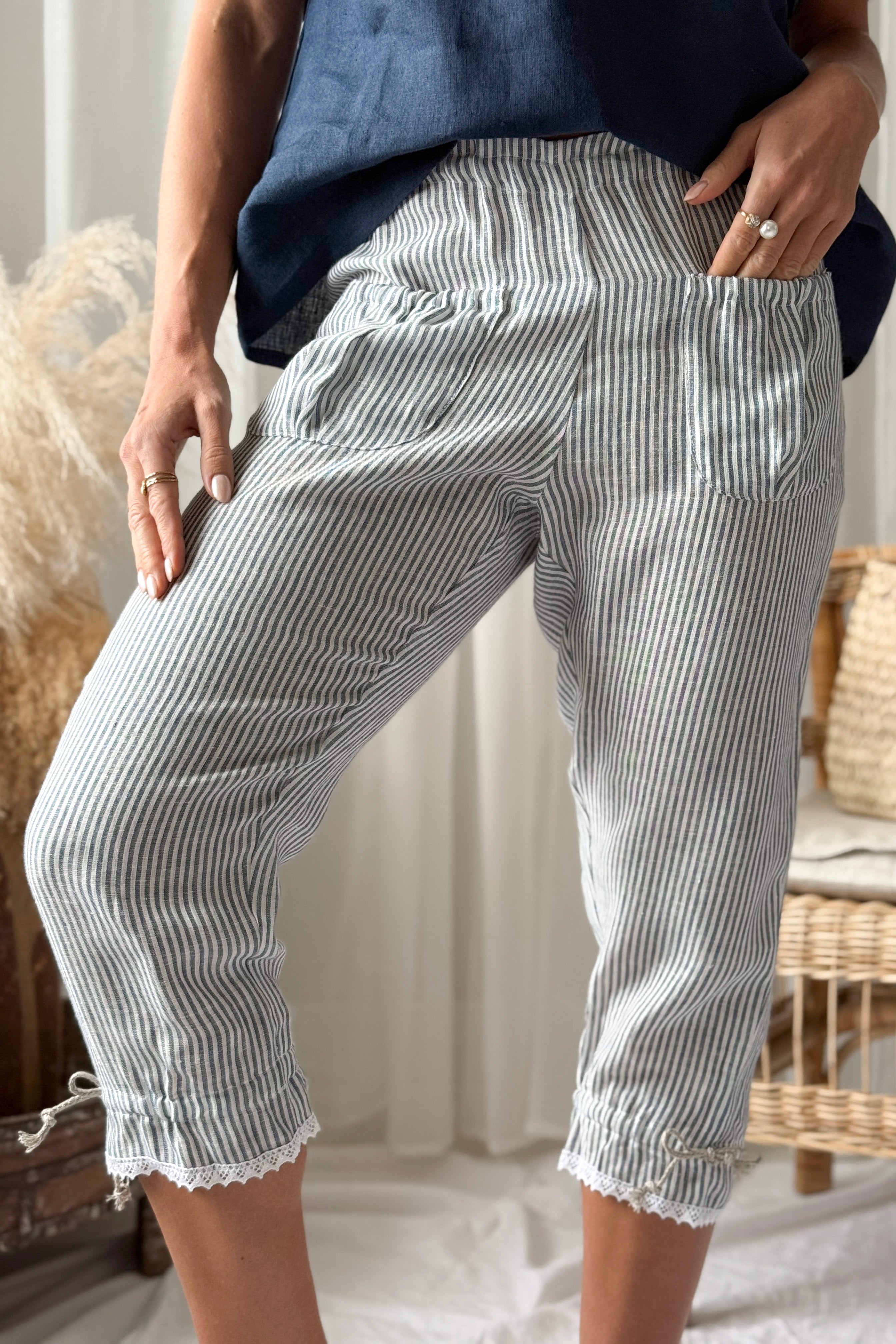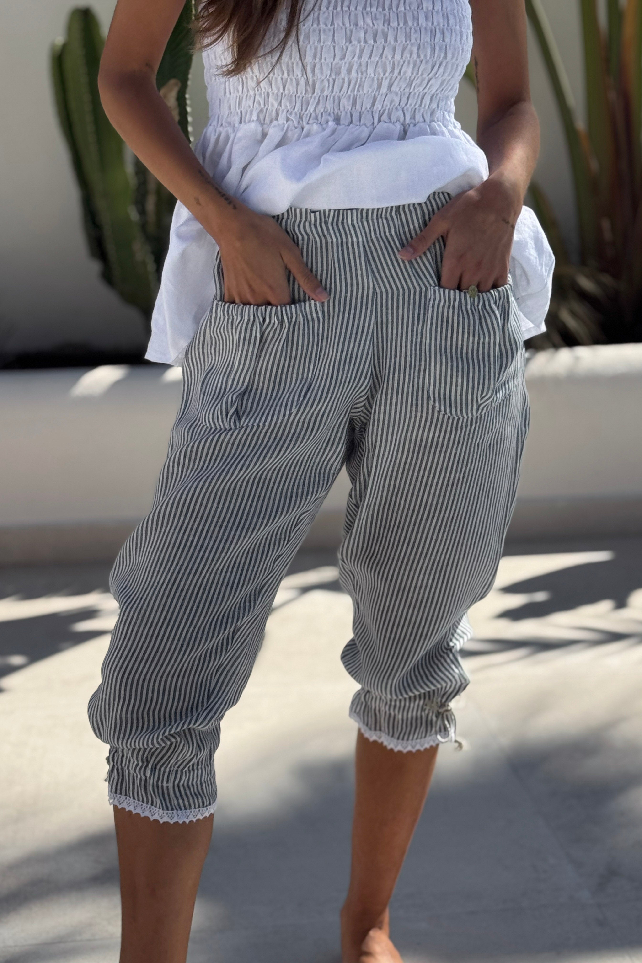 Kevyet ja ilmavat housut, joissa on käytännölliset etutaskut ja hieman pussimainen leikkaus ja kiristys lahkeissa. Lahkeissa olevat kauniit pitsiset yksityiskohdat viimeistelevät housujen elegantin ja rennon ilmeen, tehden niistä täydellisen valinnan kesäpäiviin.