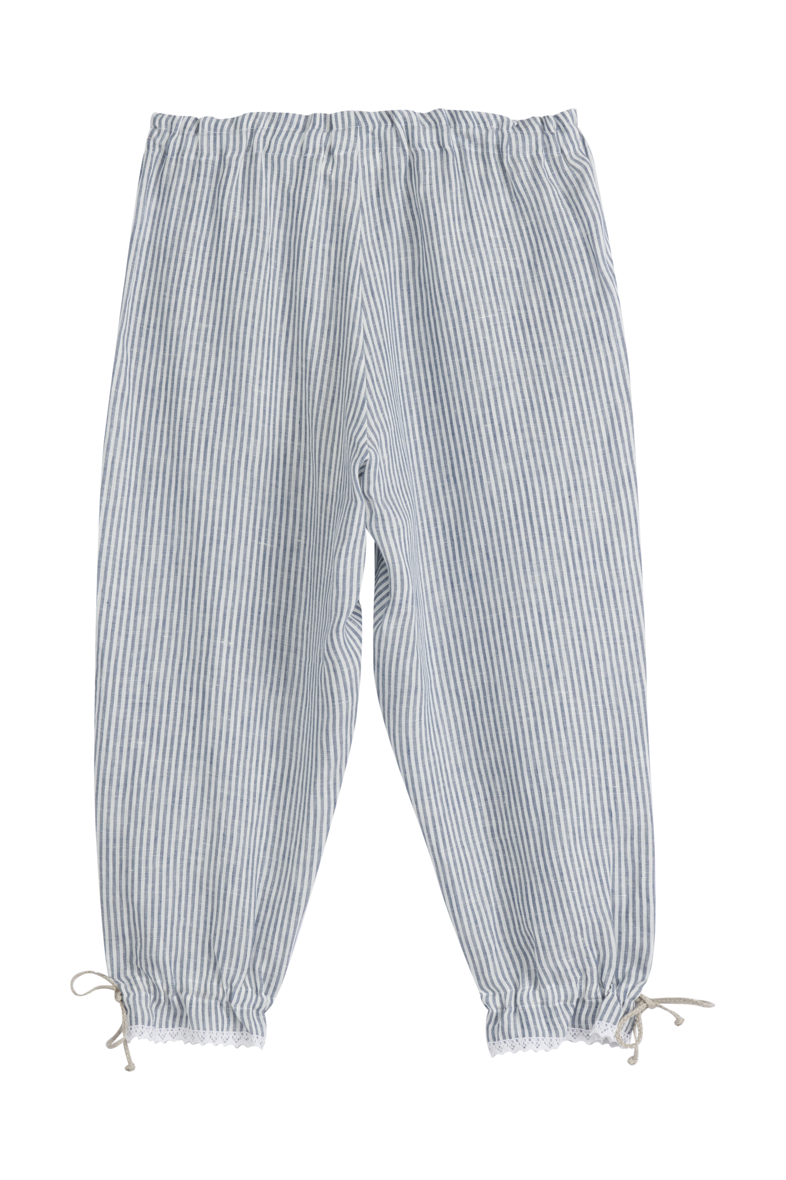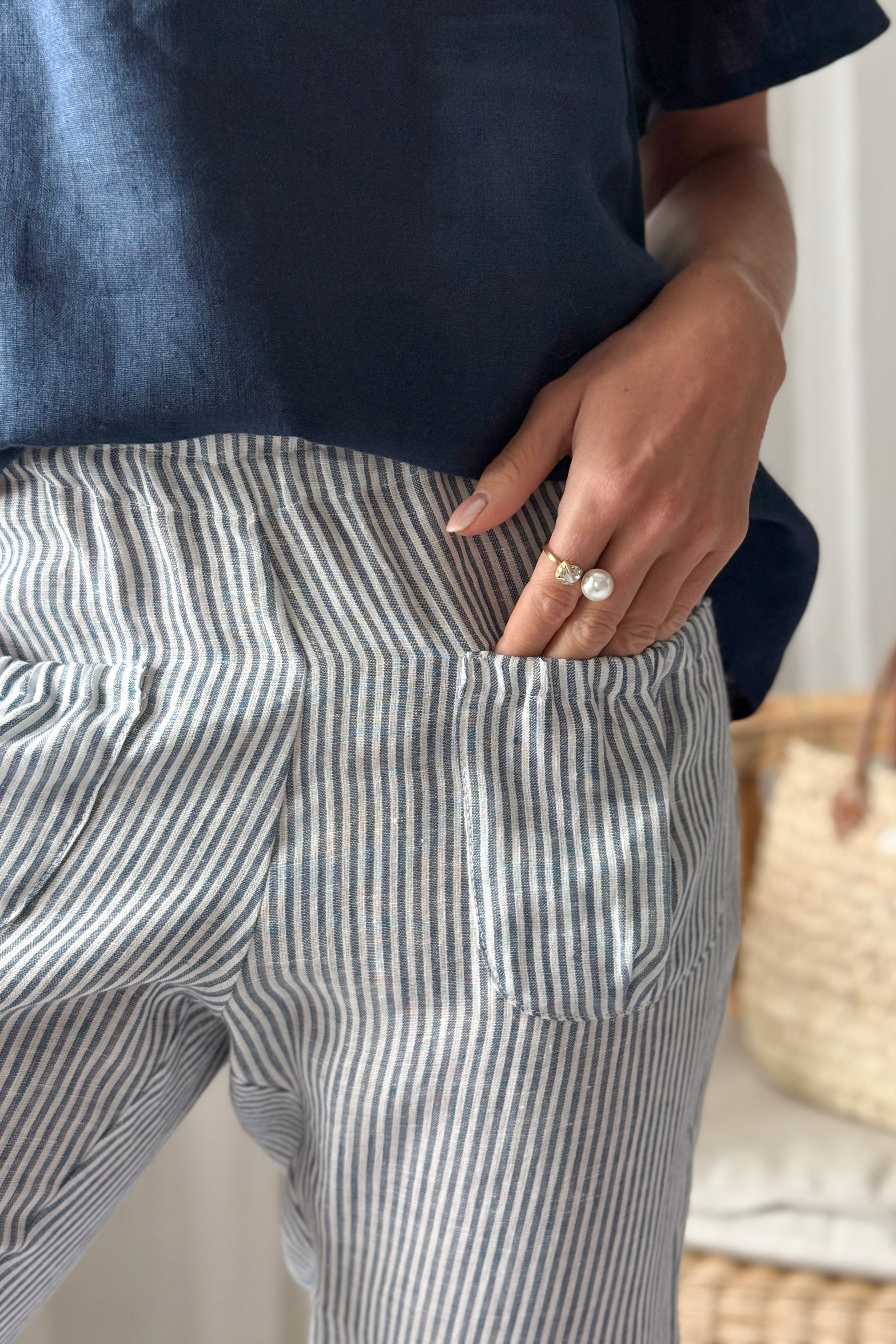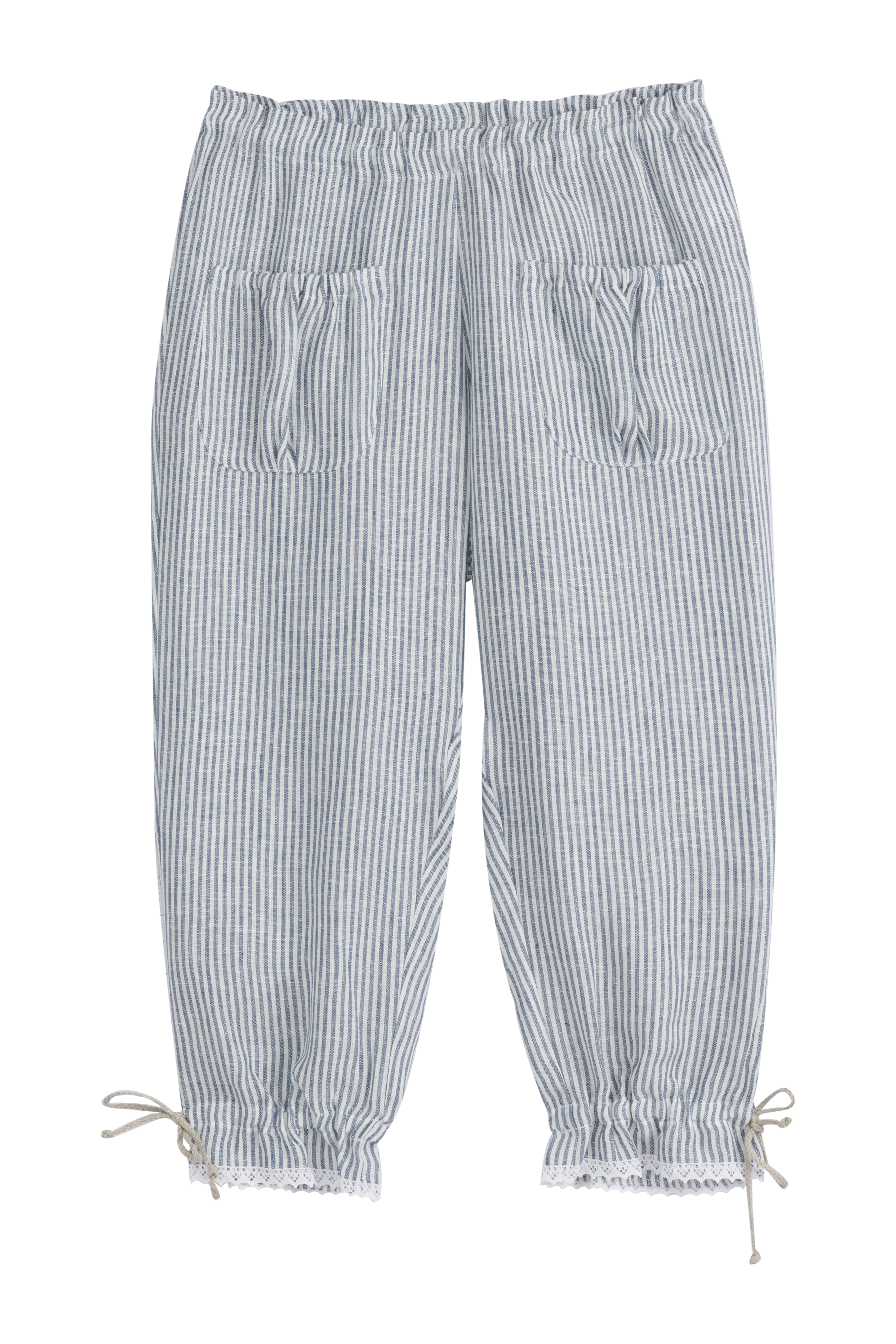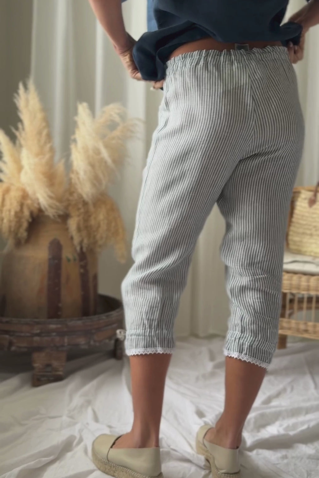 Kevyet ja ilmavat housut, joissa on käytännölliset etutaskut ja hieman pussimainen leikkaus ja kiristys lahkeissa. Lahkeissa olevat kauniit pitsiset yksityiskohdat viimeistelevät housujen elegantin ja rennon ilmeen, tehden niistä täydellisen valinnan kesäpäiviin.