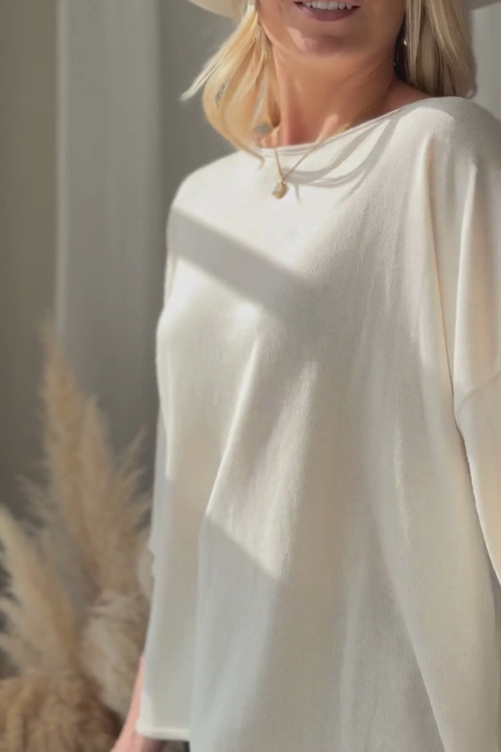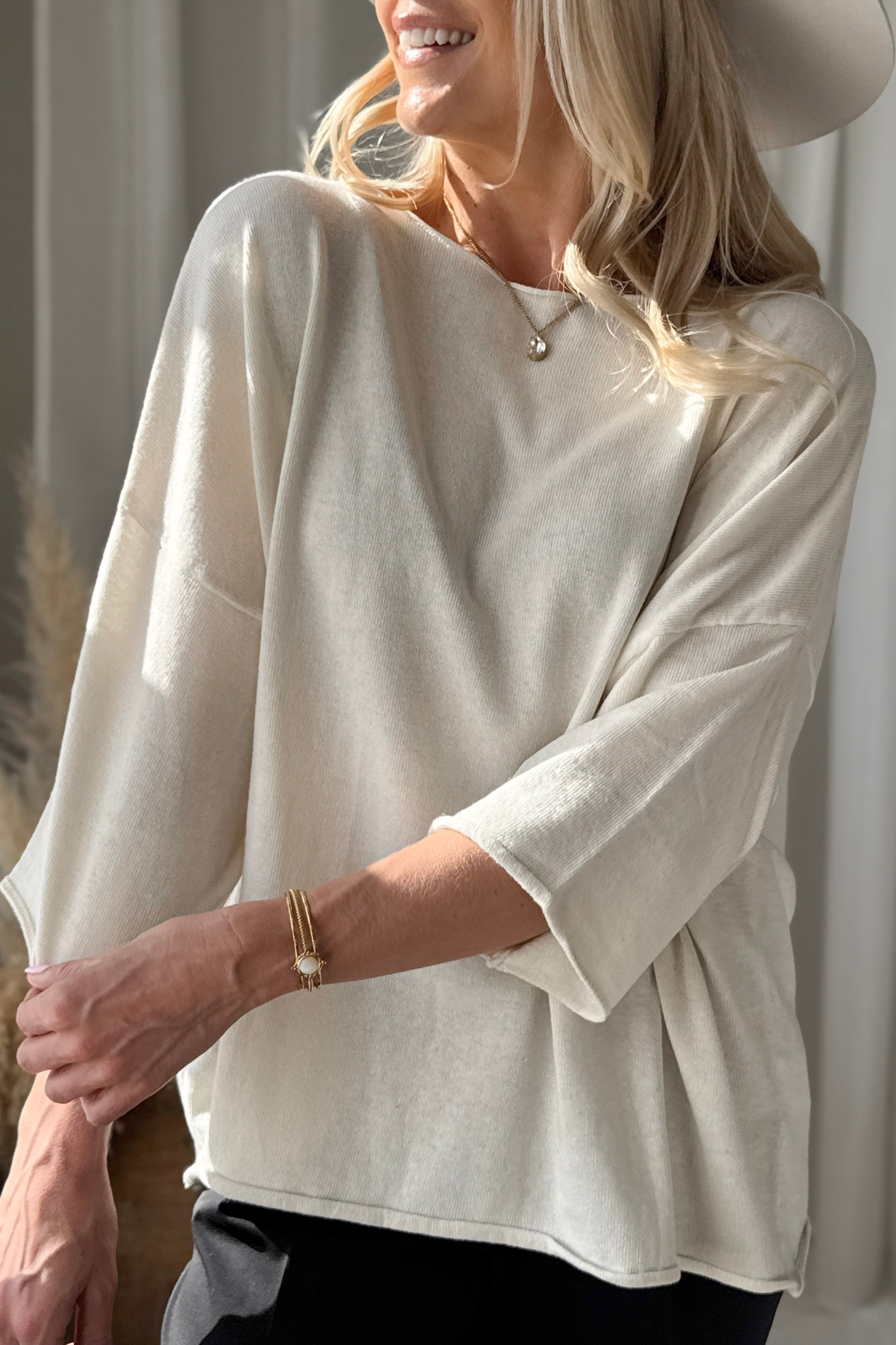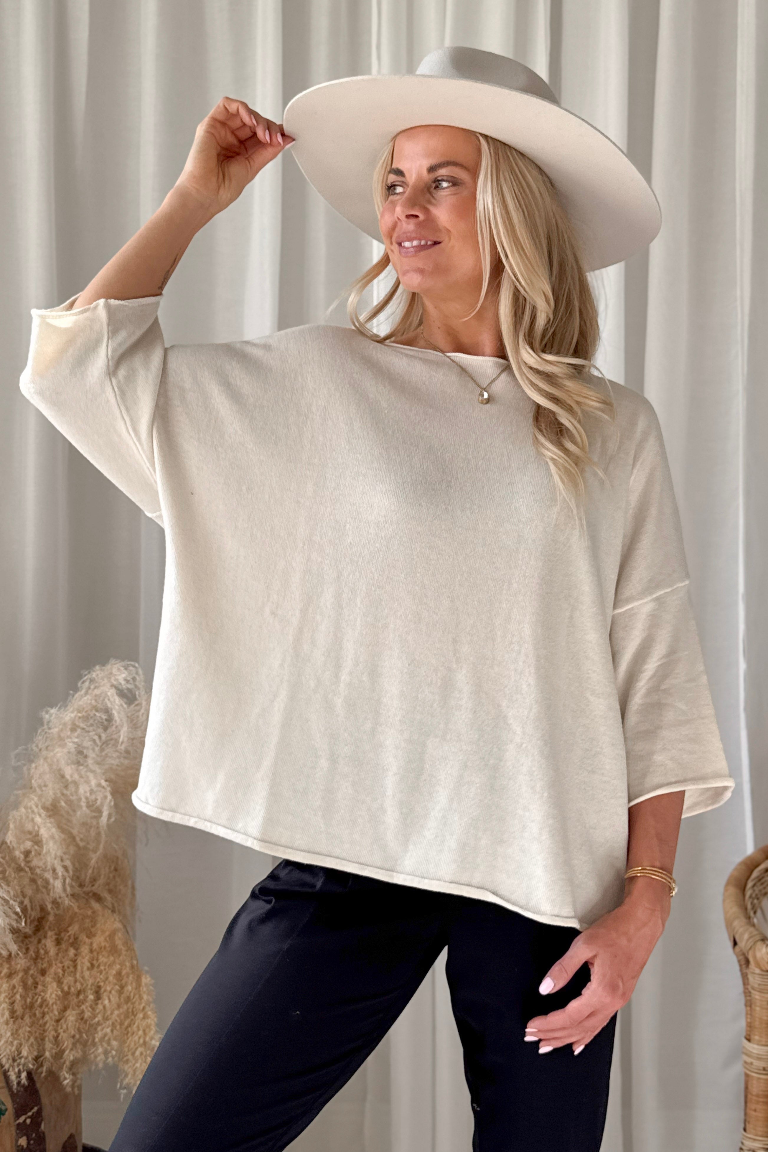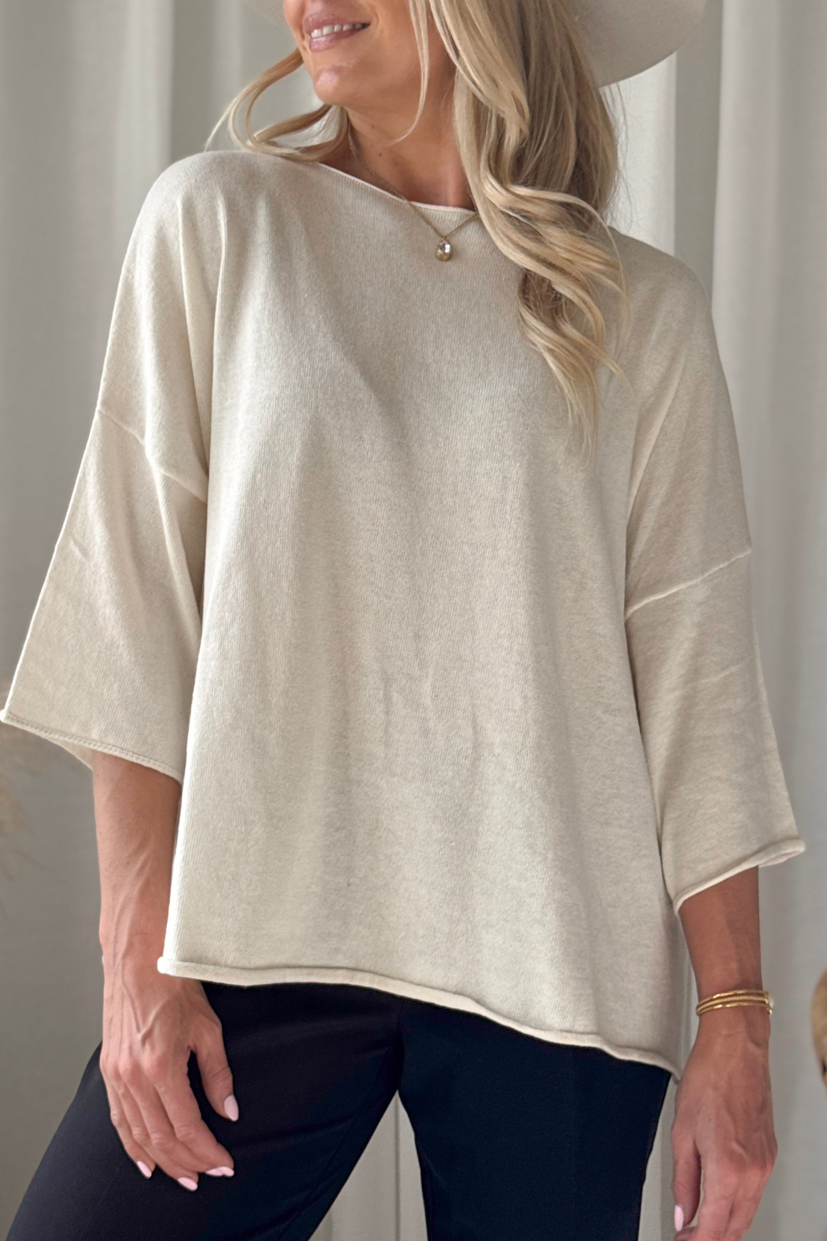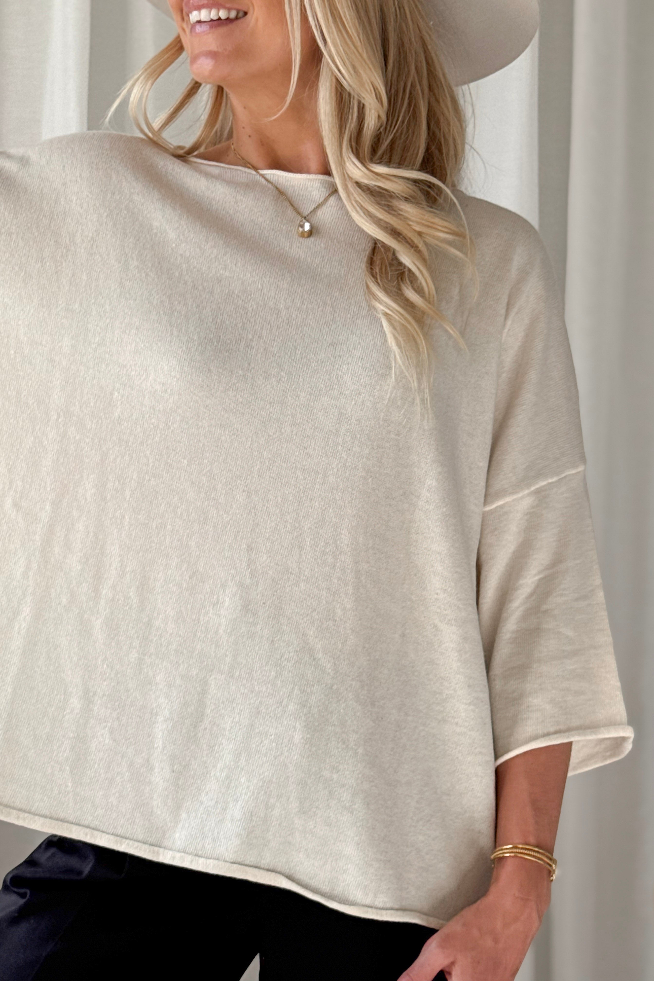 Kevyt ja erittäin monikäyttöinen neule, joka toimii ympäri vuoden. Neuleessa on rennosti madallettu olkapäälinja, venepääntie sekä 3/4-pituiset hihat.