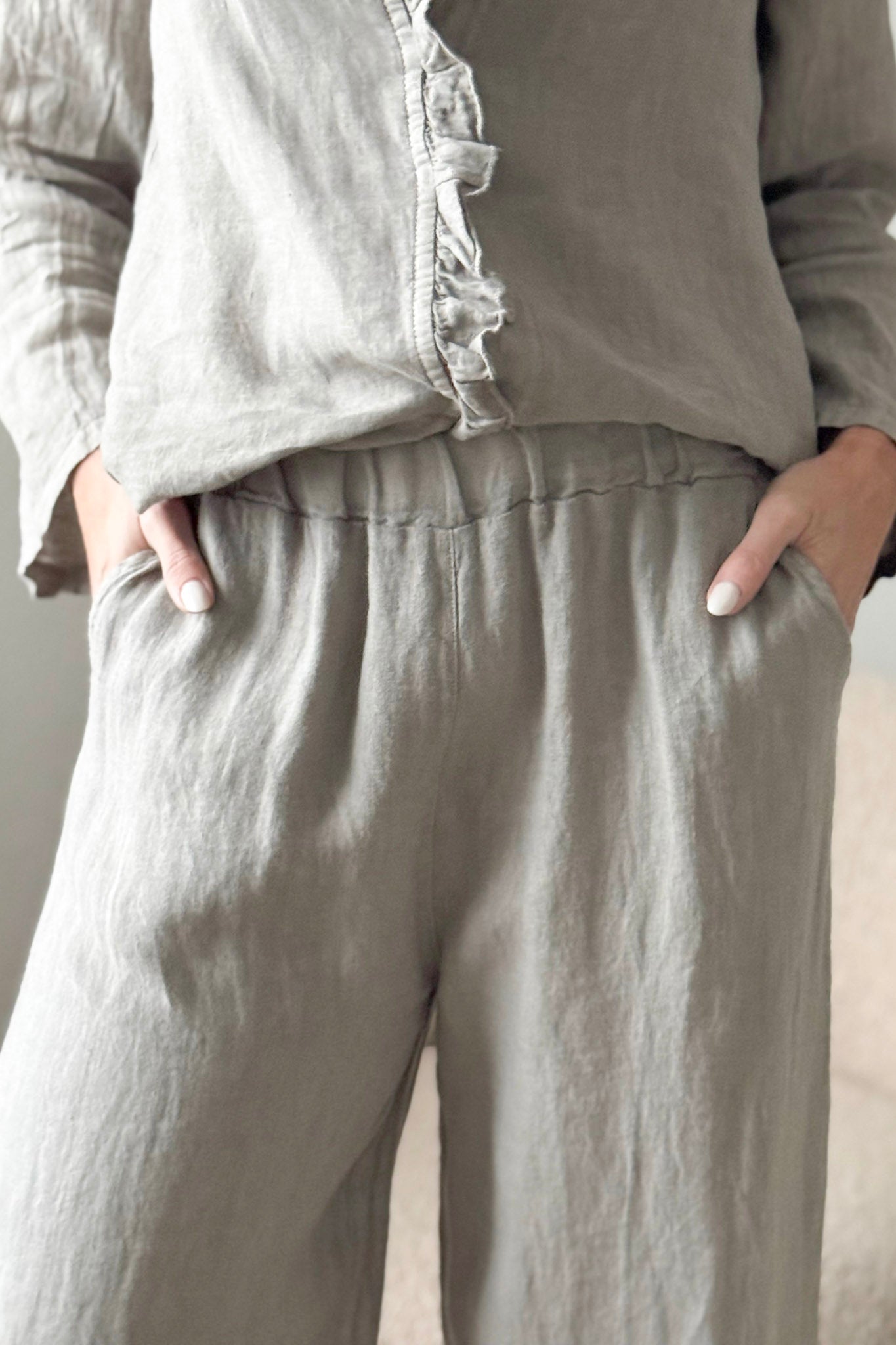 Konepesu 30 asteessa, ei rumpukuivausta. Pesu samanväristen kanssa. Pellava voi kutistua pesussa 2-4%, mutta muovautuu vartaloosi käytössä.
