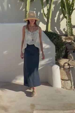 Naisellinen midi-mittainen pellavahame on ajattoman yksinkertainen ja monikäyttöinen valinta niin arkeen kuin juhlavampiinkin hetkiin. Kapea A-linjainen siluetti laskeutuu kauniisti ja tekee hameesta helpon yhdistää erilaisten yläosien kanssa. Vyötäröllä joustava kuminauha. Tuotteen väri on todellisuudessa hieman tummempi kuin kuvissa.