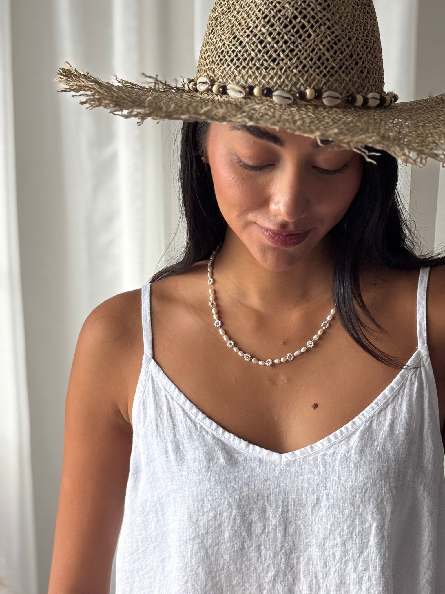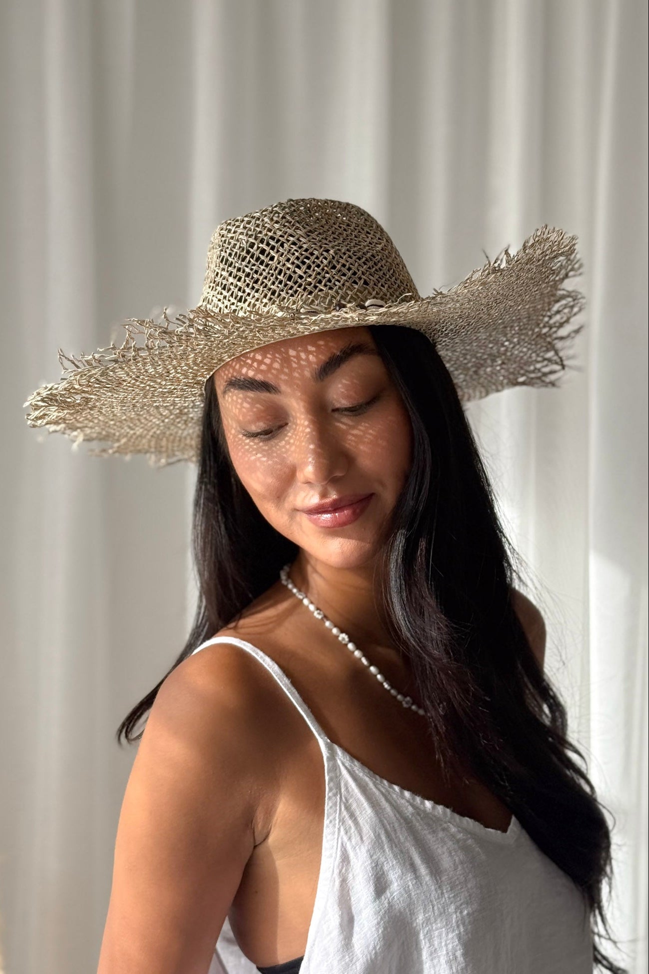 Hauska ja rennon tyylikäs väljäästi punottu lierihattu BYPIAS-hattumallistosta simpukka- ja helmikoristeilla. Hatun hapsotetut reunat tuovat ilmeeseen boheemia keveyttä, ja sisäpuolella oleva hikinauha lisää käyttömukavuutta.