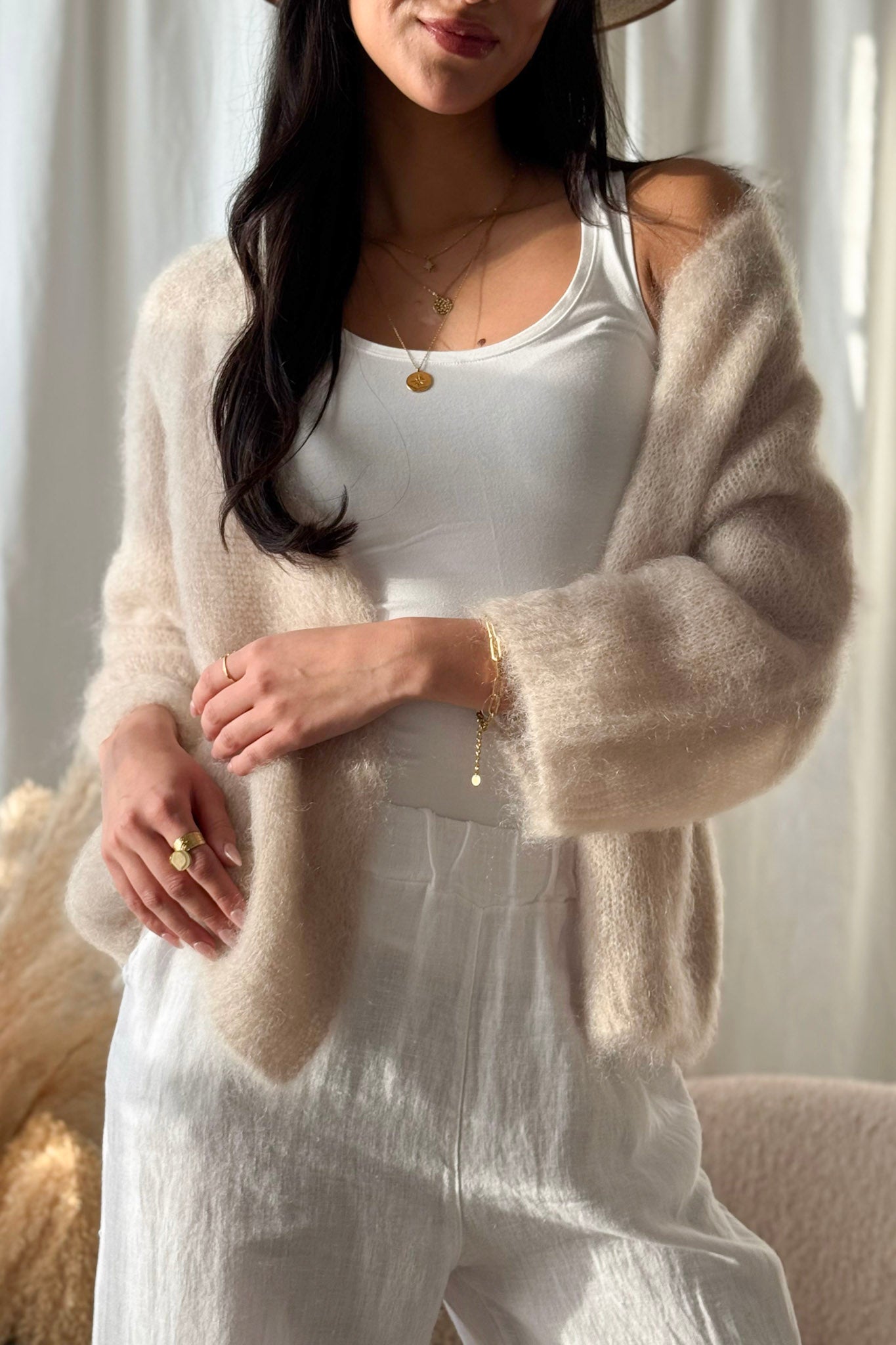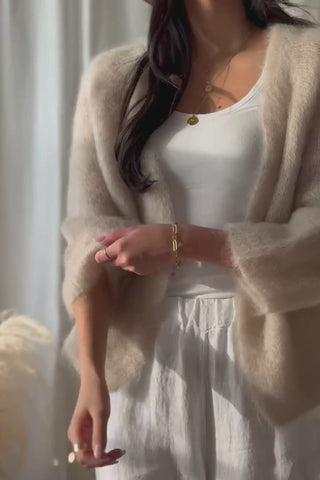 Ihanan muhkea ja pehmoinen kid mohair -neuletakki, jossa kaunis V-kaula-aukko ja 3/4 hihanpituus. Raglahihainen malli ilman nappeja. Kid mohairin ylellinen, henkäyksen kepeä ja harva neulos on kuin käsinpuikoilla kudottu ihanuus. Lyhyt, boximainen ja reilu malli.