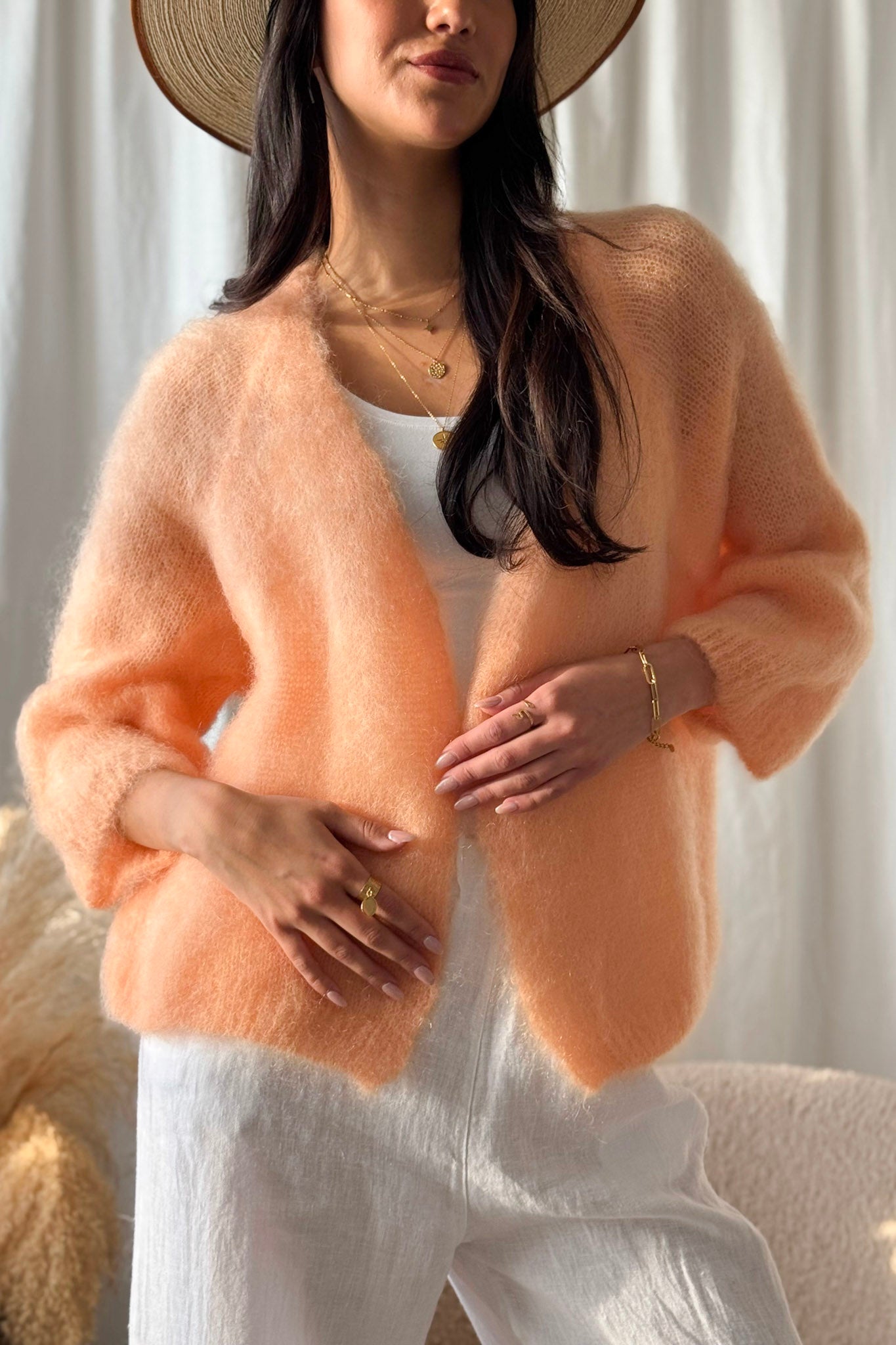 Ihanan muhkea ja pehmoinen kid mohair -neuletakki, jossa kaunis V-kaula-aukko ja 3/4 hihanpituus. Raglahihainen malli ilman nappeja. Kid mohairin ylellinen, henkäyksen kepeä ja harva neulos on kuin käsinpuikoilla kudottu ihanuus. Lyhyt, boximainen ja reilu malli.
