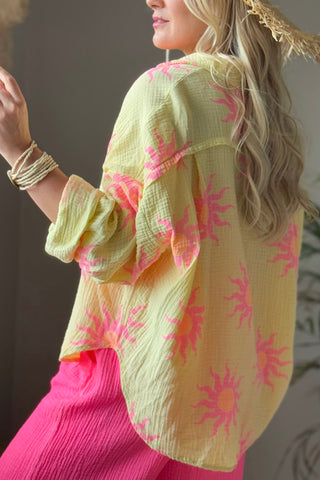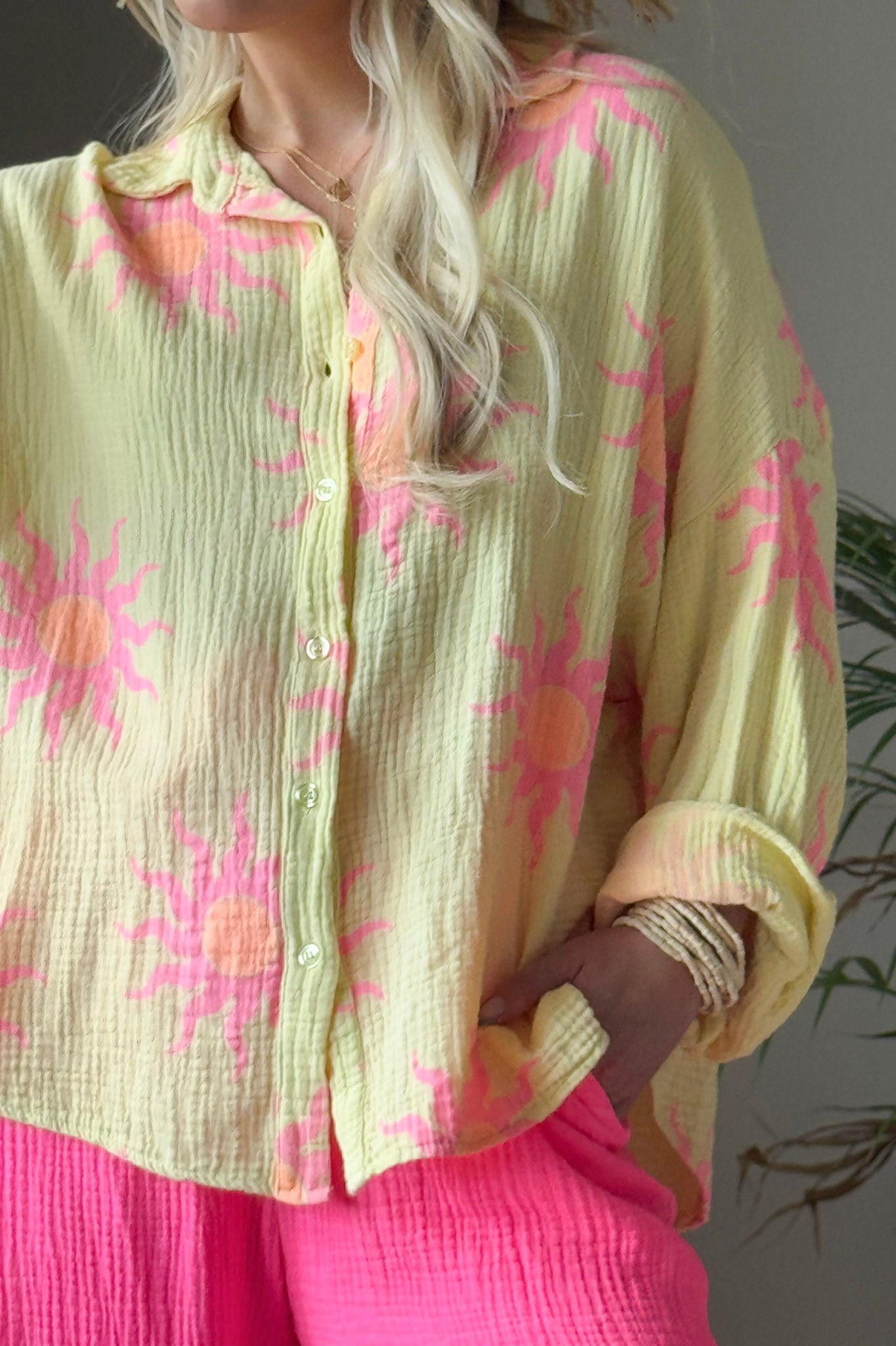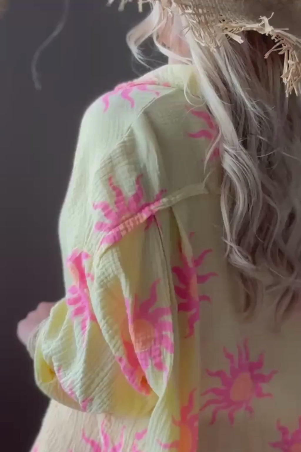 Rento puuvillapaita Hanko Beach Pop-up valikoimasta. Paitaa koristaa ihana aurinko kuvio. Vohvelikuosinen puuvillakangas on kevyt ja pehmeä päällä. Paidassa on klassinen kaulus ja napitus. Pitkät hihat ja madalletut olkapäät, hihansuusa on nappikiinnitys.