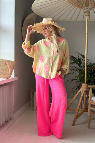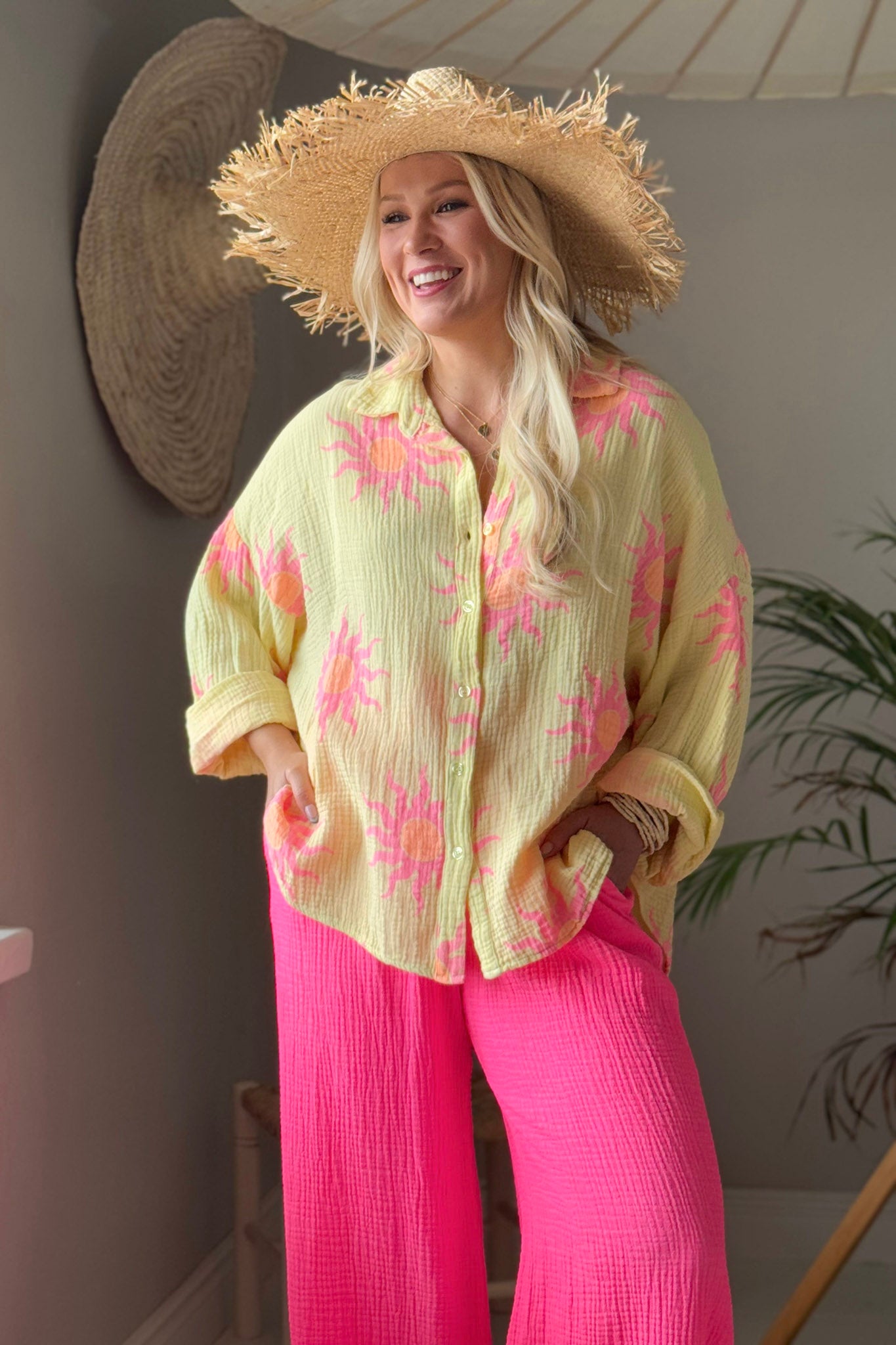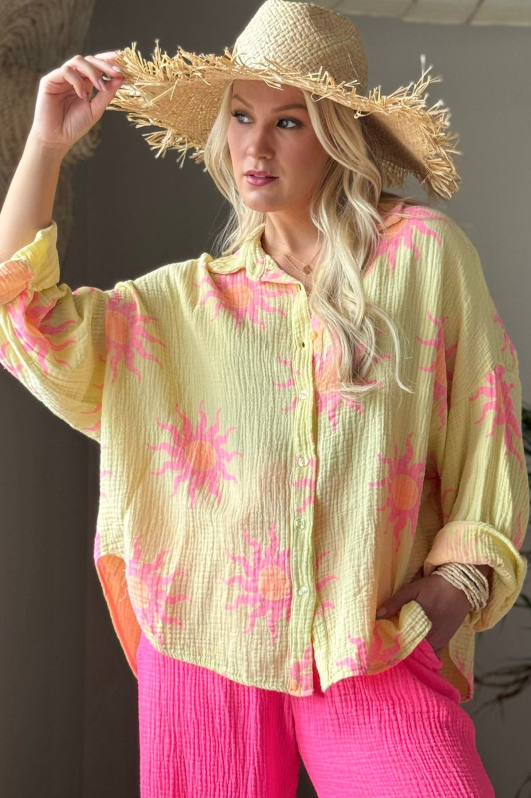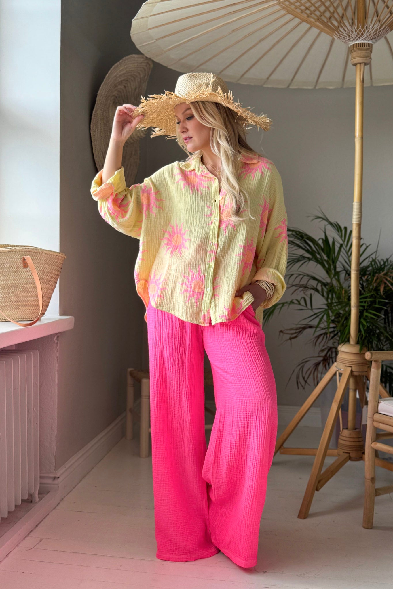 Rento puuvillapaita Hanko Beach Pop-up valikoimasta. Paitaa koristaa ihana aurinko kuvio. Vohvelikuosinen puuvillakangas on kevyt ja pehmeä päällä. Paidassa on klassinen kaulus ja napitus. Pitkät hihat ja madalletut olkapäät, hihansuusa on nappikiinnitys.