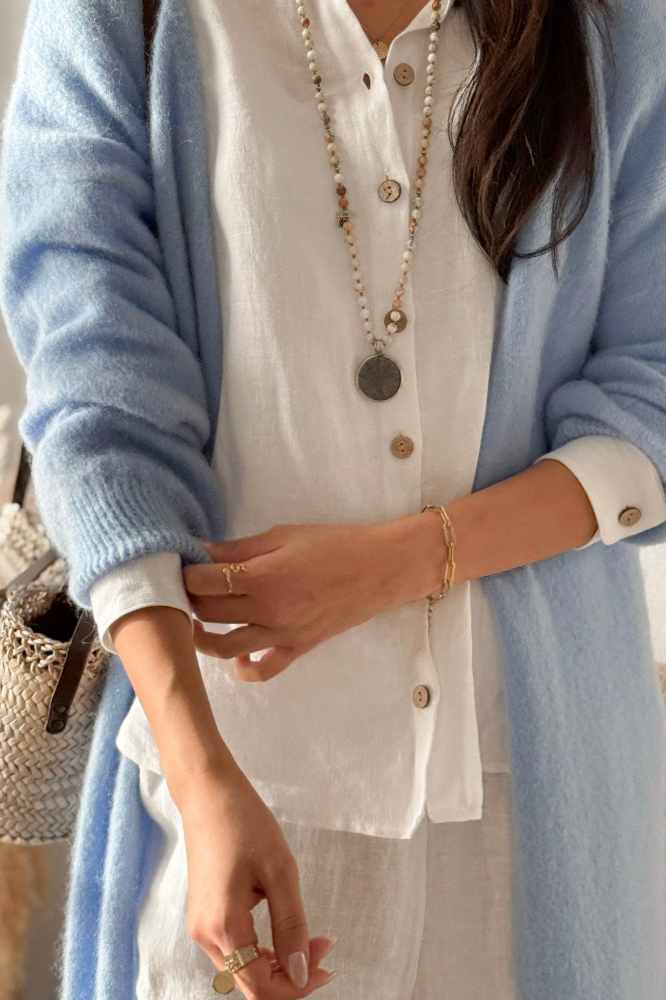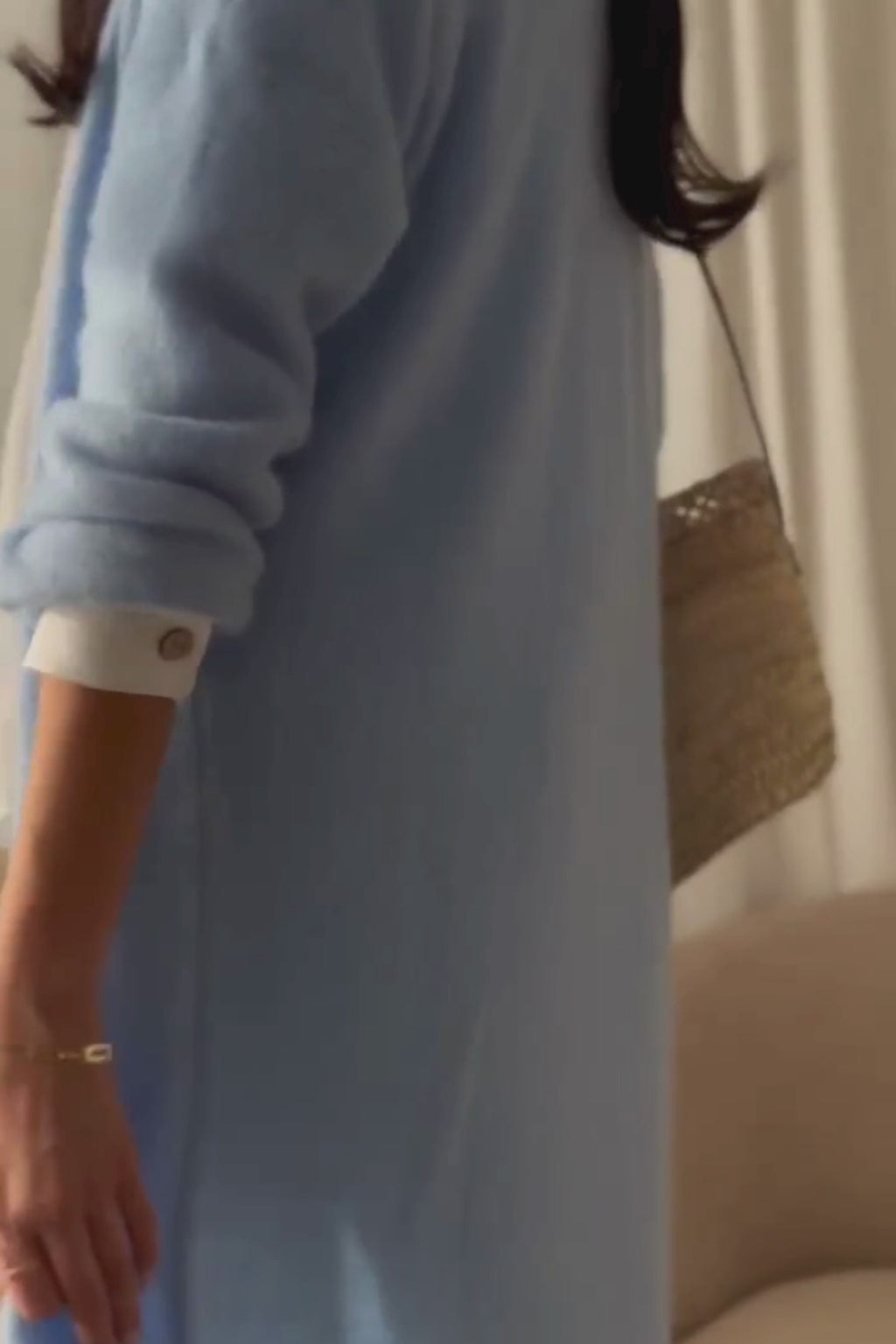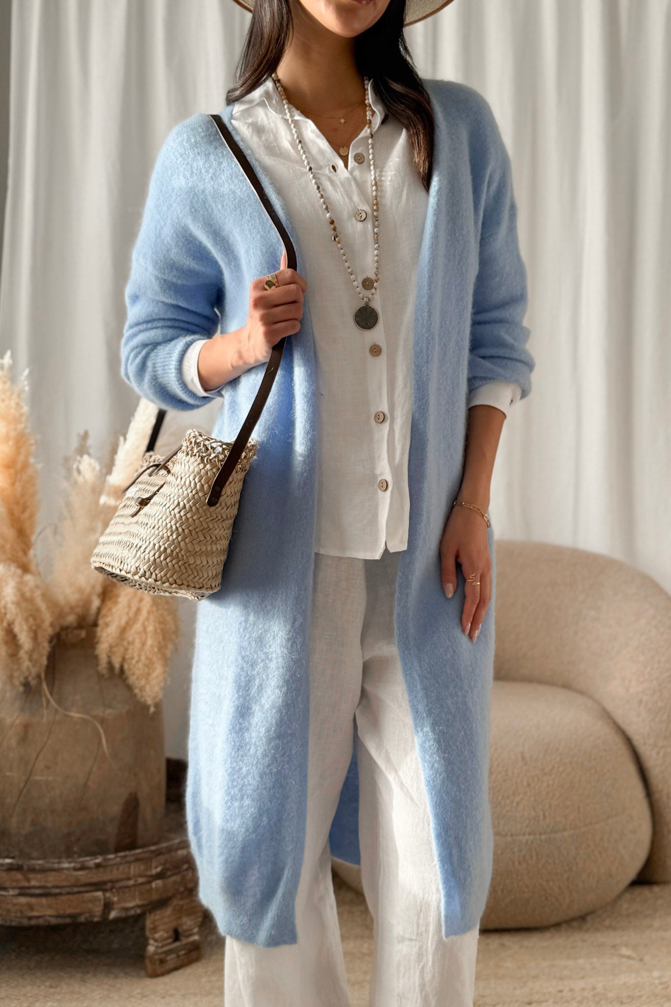 Ylellisen pehmeä pitkä super kid mohair -neuletakki, joka hurmaa keveydellään ja pehmeydellään. Klassinen malli ilman kiinnitystä, viimeistelty hillityillä resoreilla helmassa ja hihansuissa.