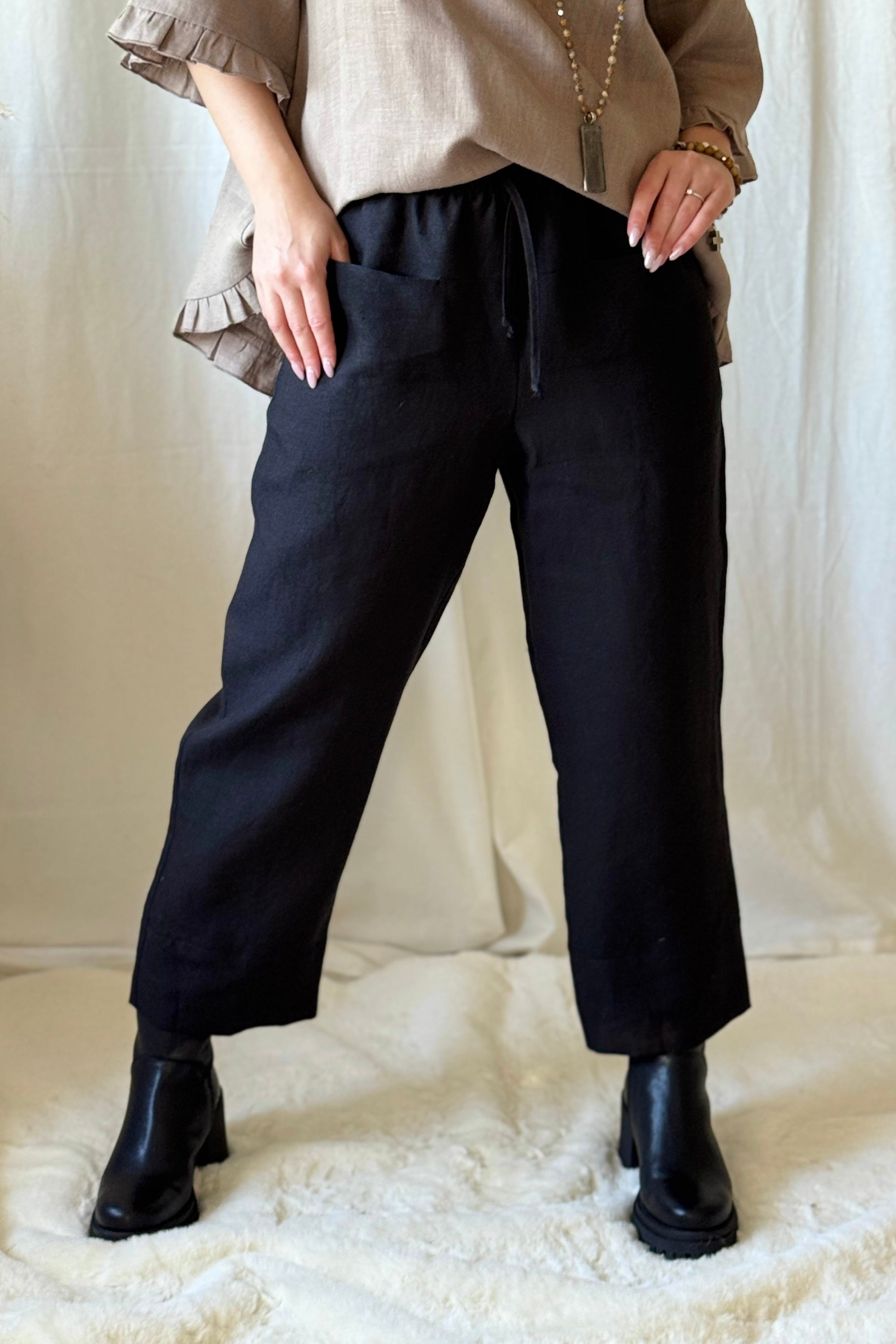 Klassiset pellavahousut leveillä lahkeilla. Housuissa on taskut edessä ja joustava resorivyötärö, jonka saa solmittua nyörillä. Valmistettu hengittävästä ja kestävästä pellavasta.
