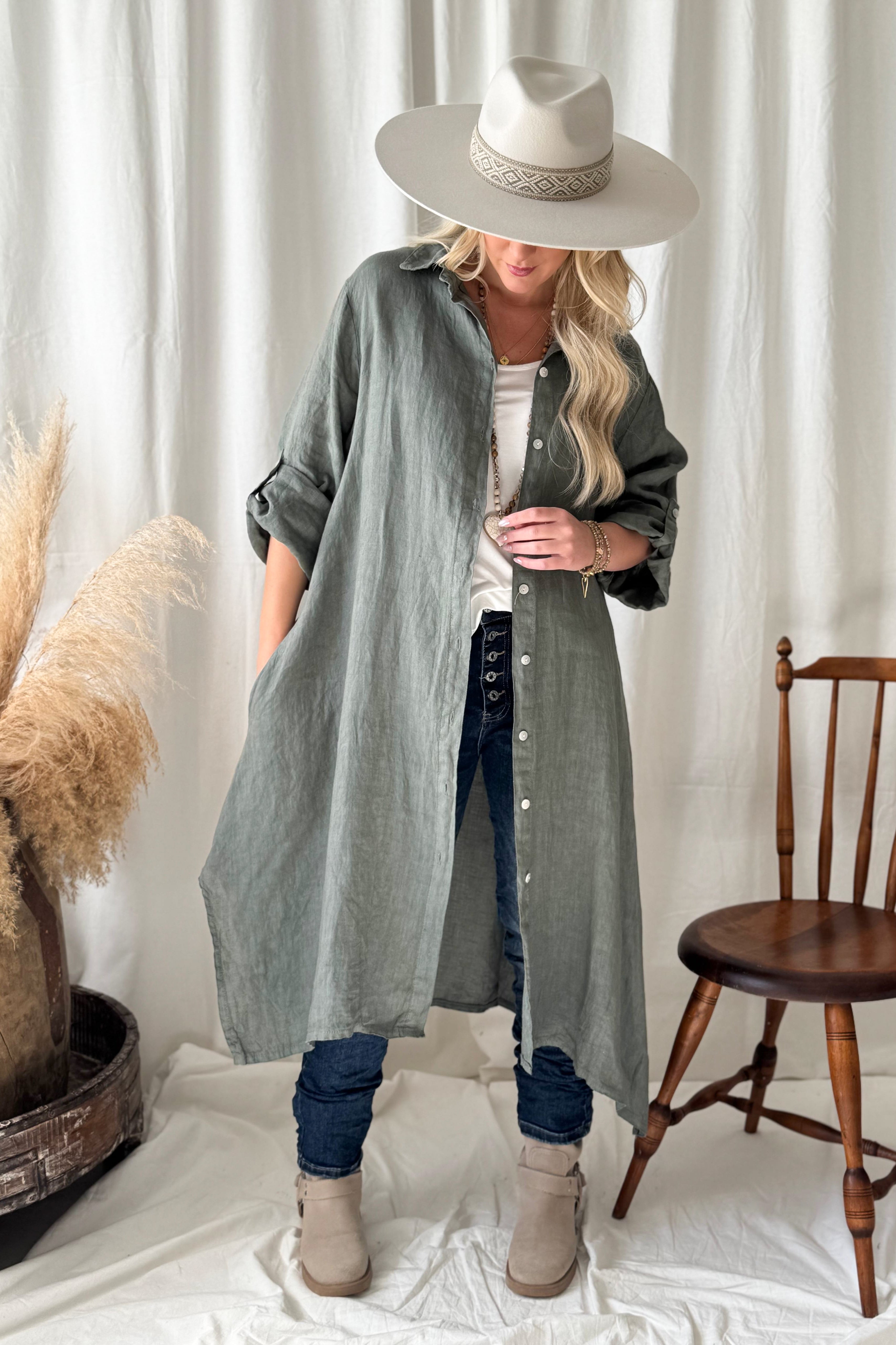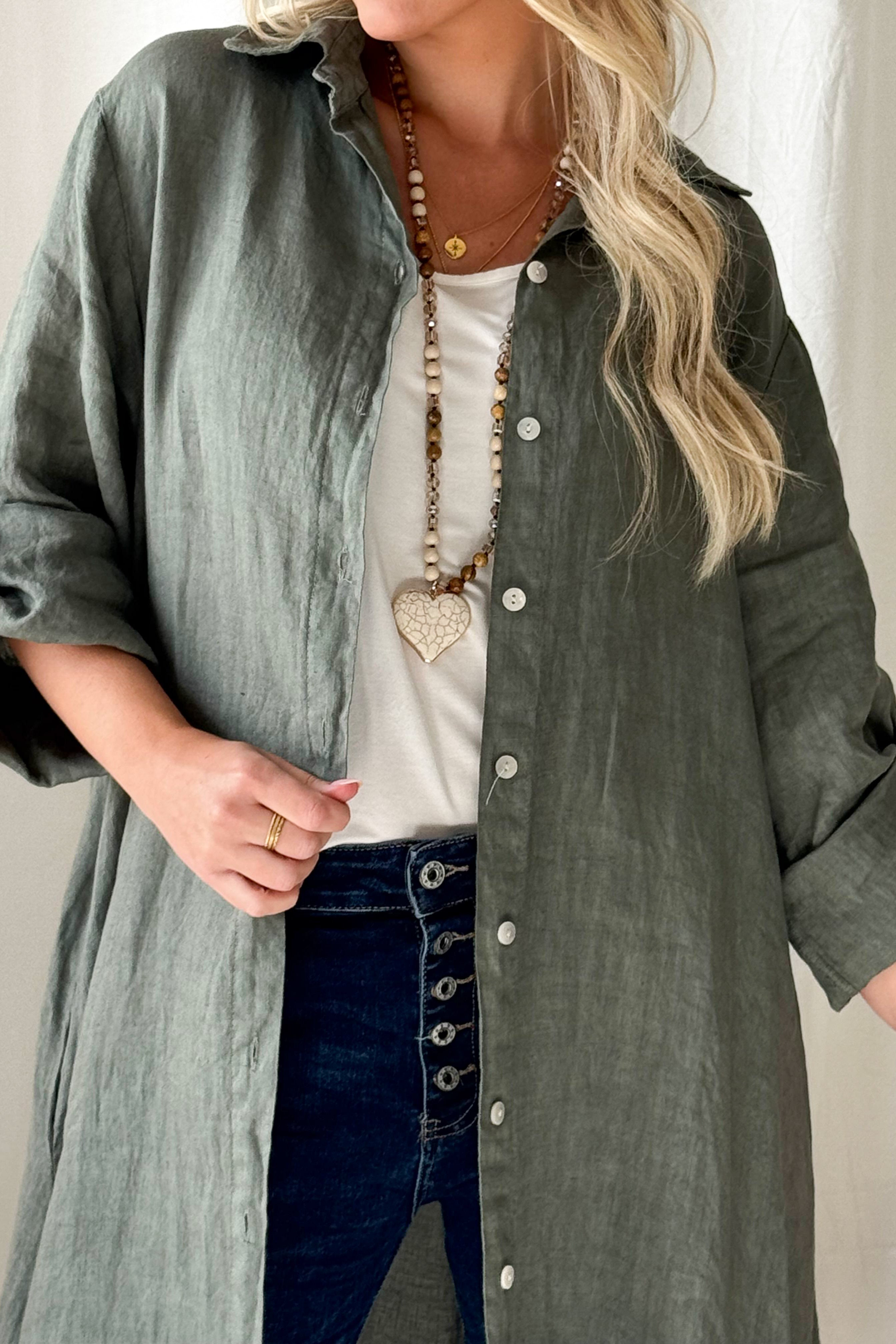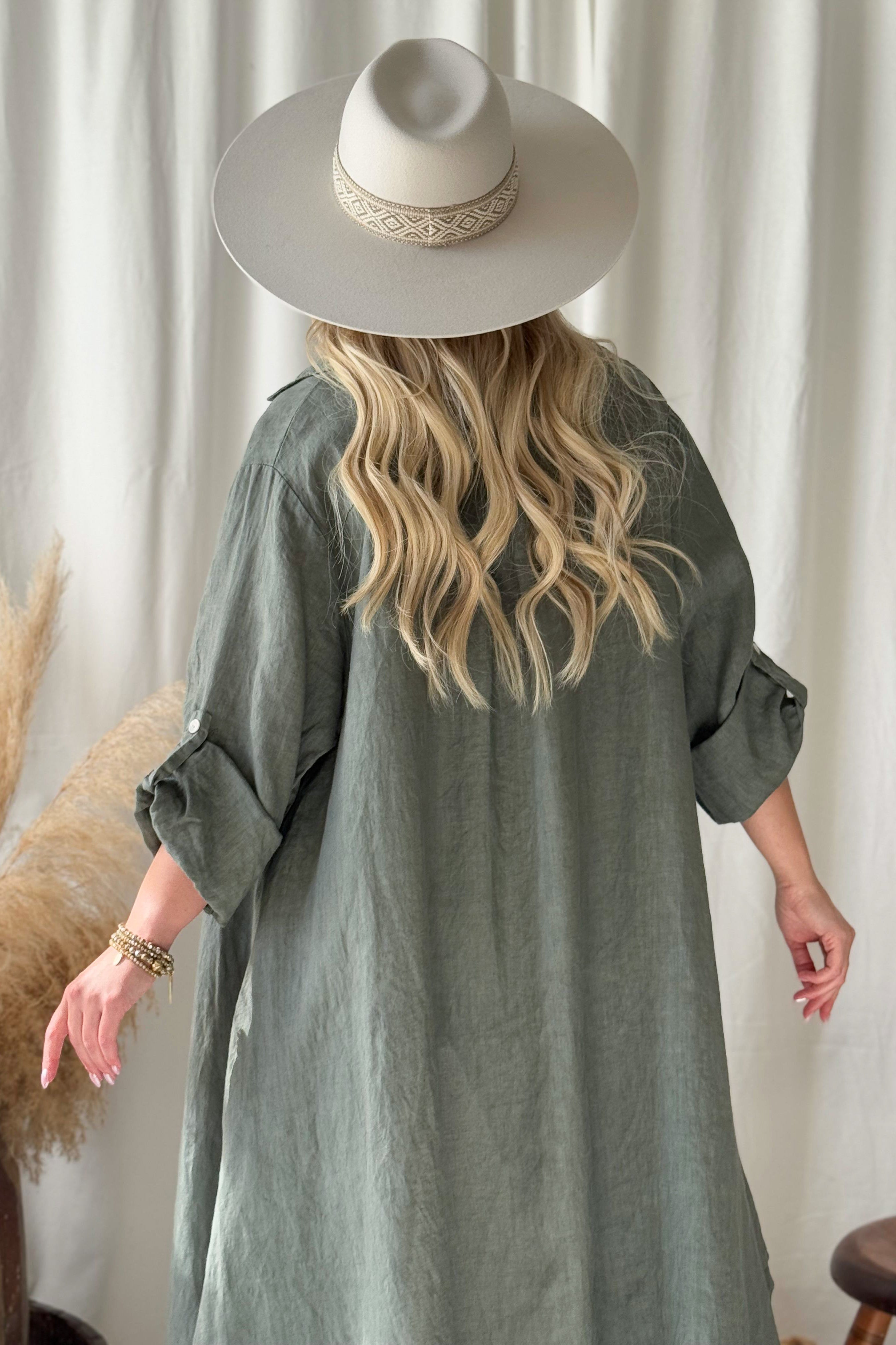 Upea pellavainen paitamekko, jossa kaulukset, halkiot sivuilla ja edessä napitus. Täydellinen pitkä ja kevyt paitamekko, joka sopii puettavaksi sekä pellavahousujen, että farkkujen kanssa.