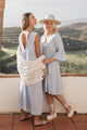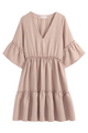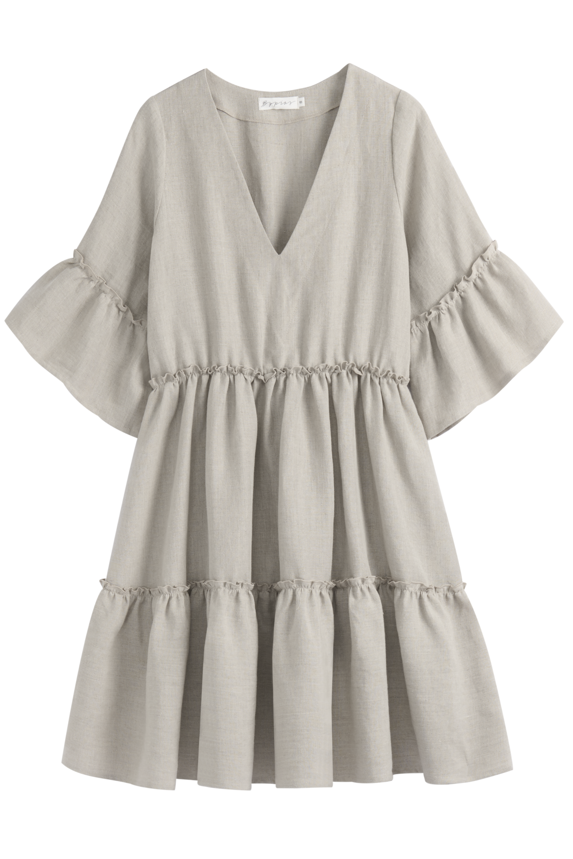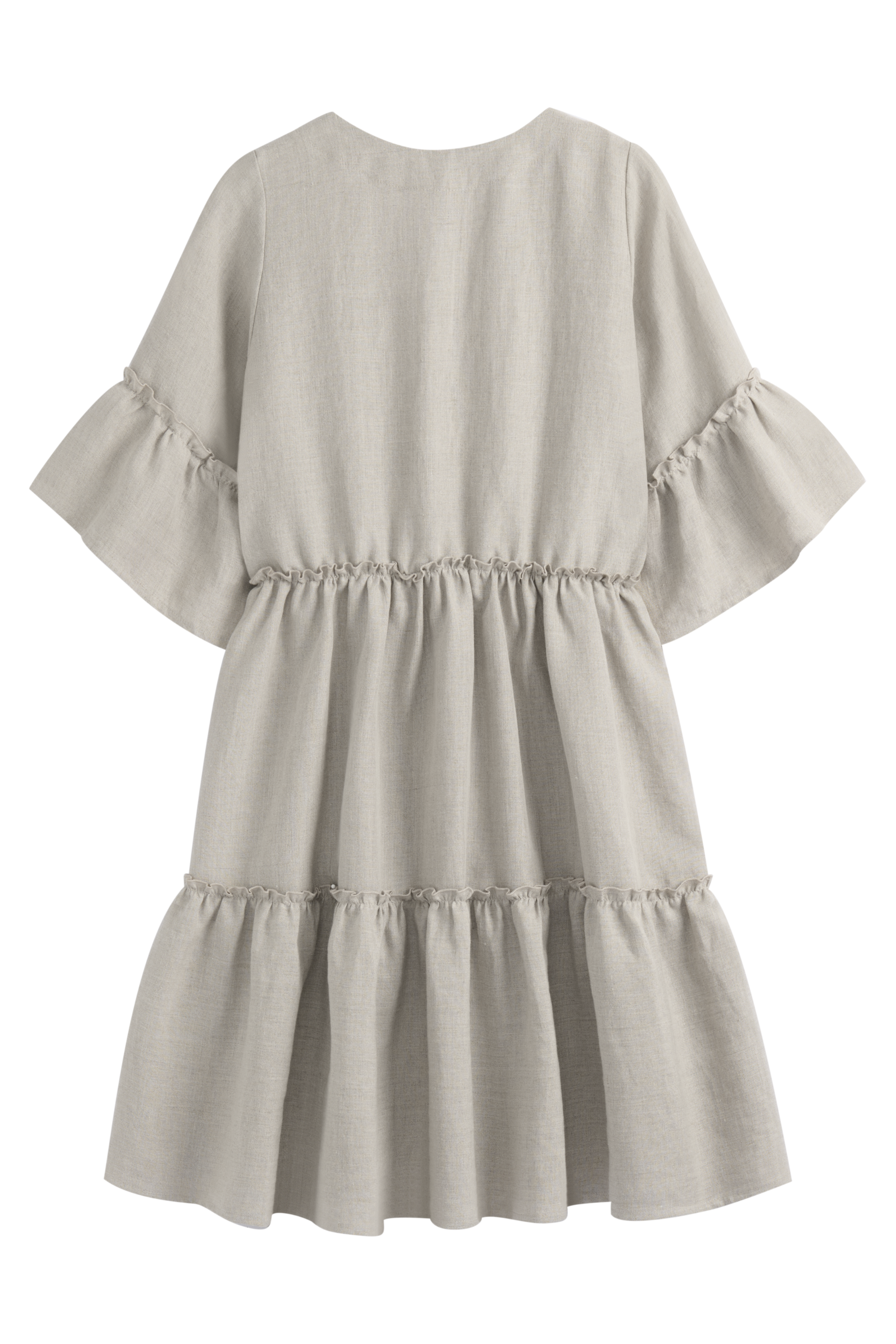 A-linjainen pellavamekko, jossa rypytys vyötäröllä ja V-pääntie. Helmassa kaunis frilla. Puolipitkissä hihoissa frillat hihansuissa.
