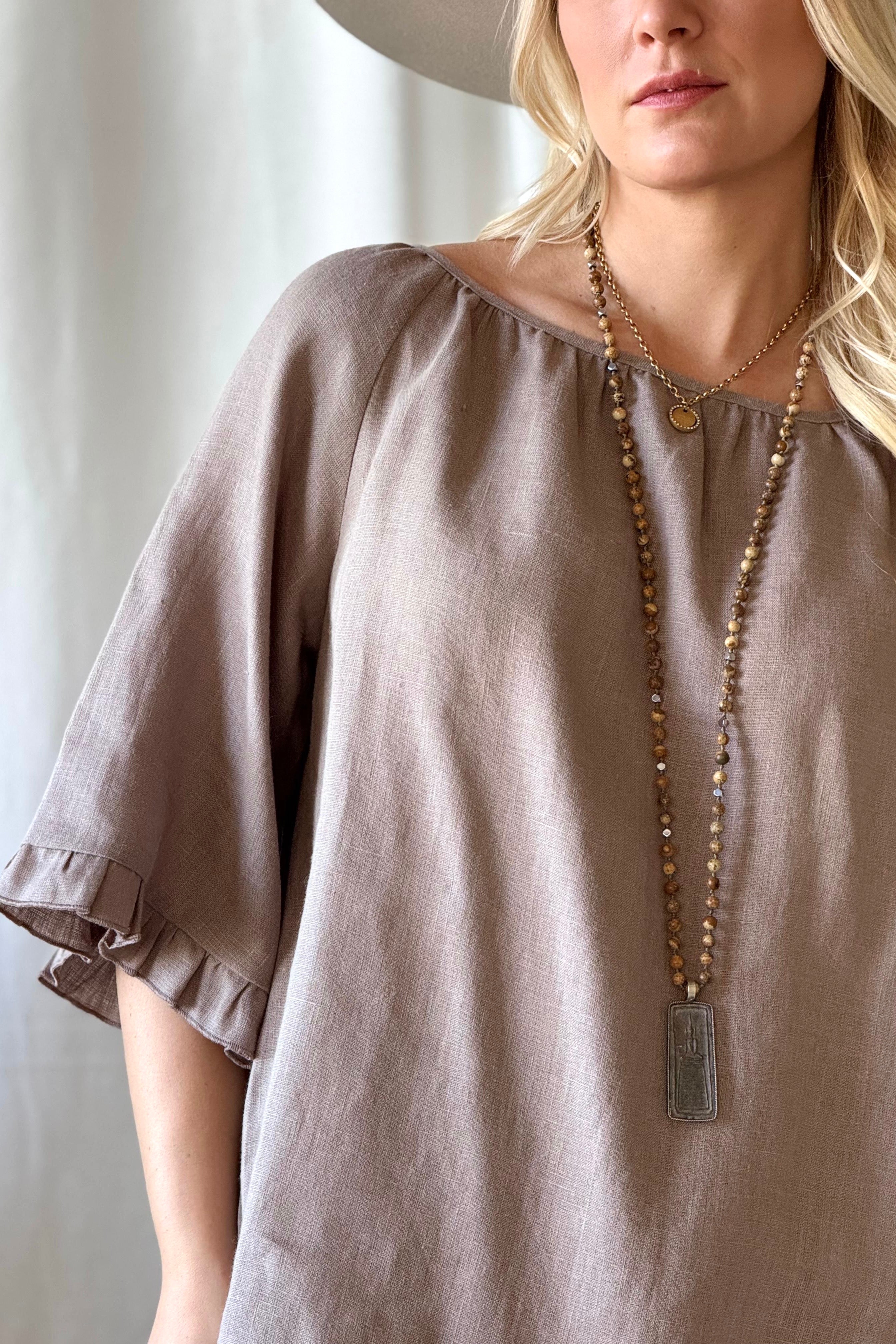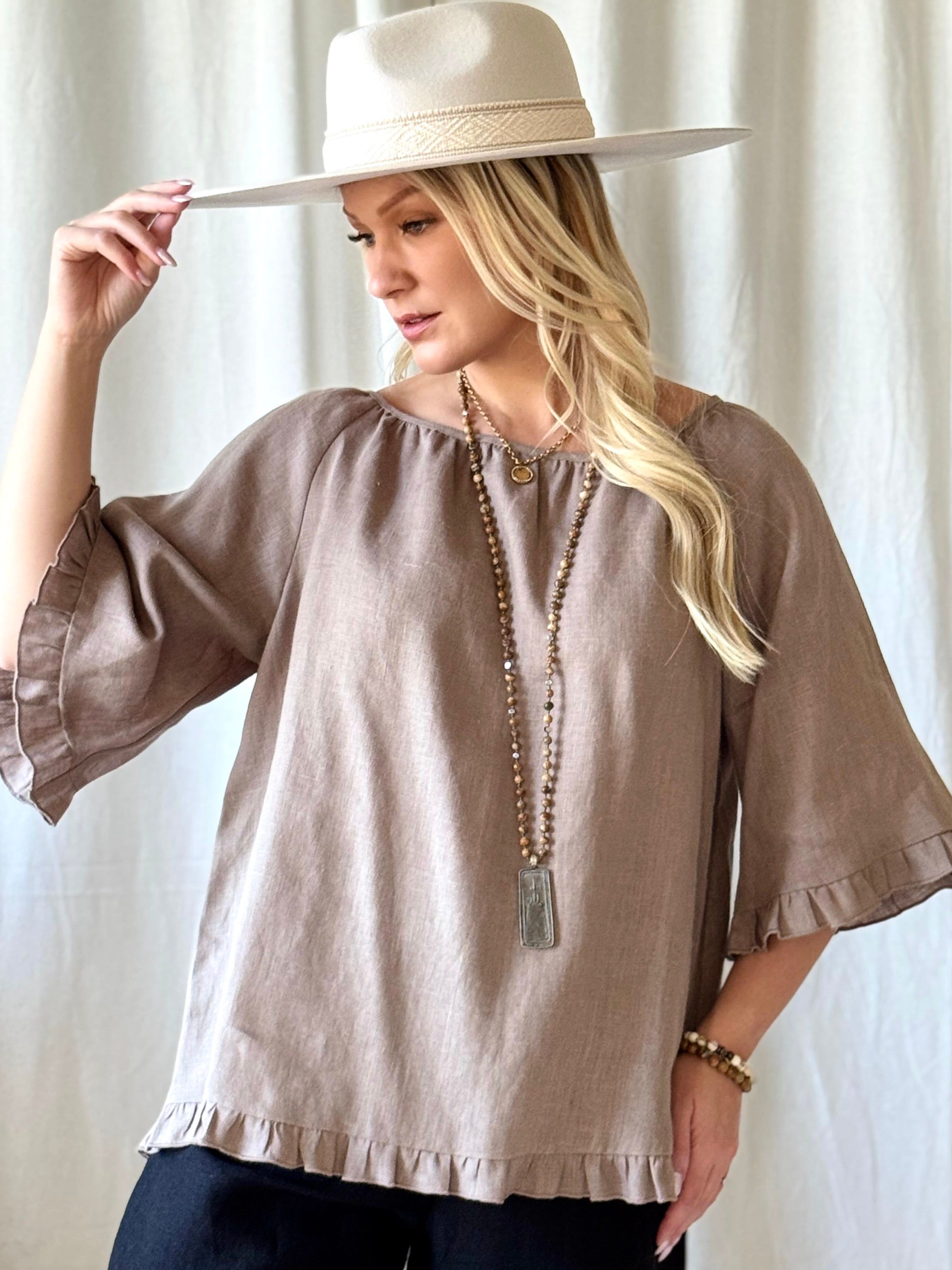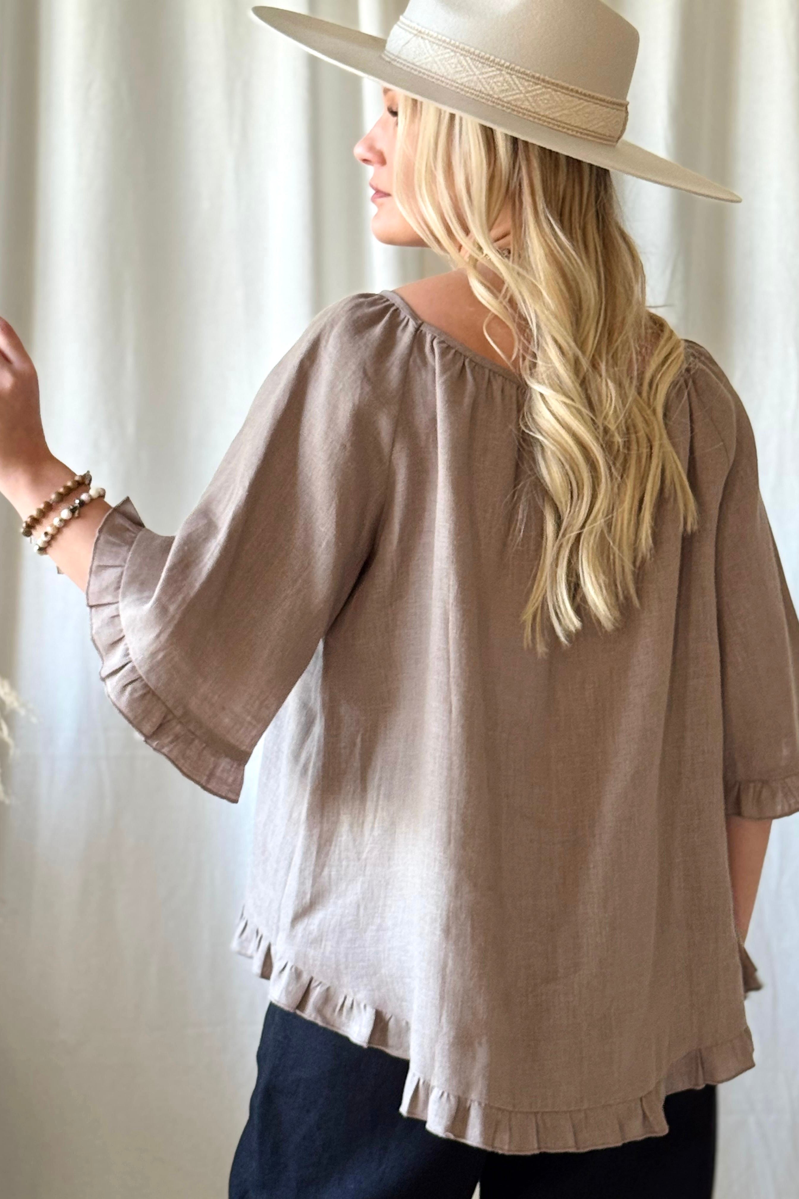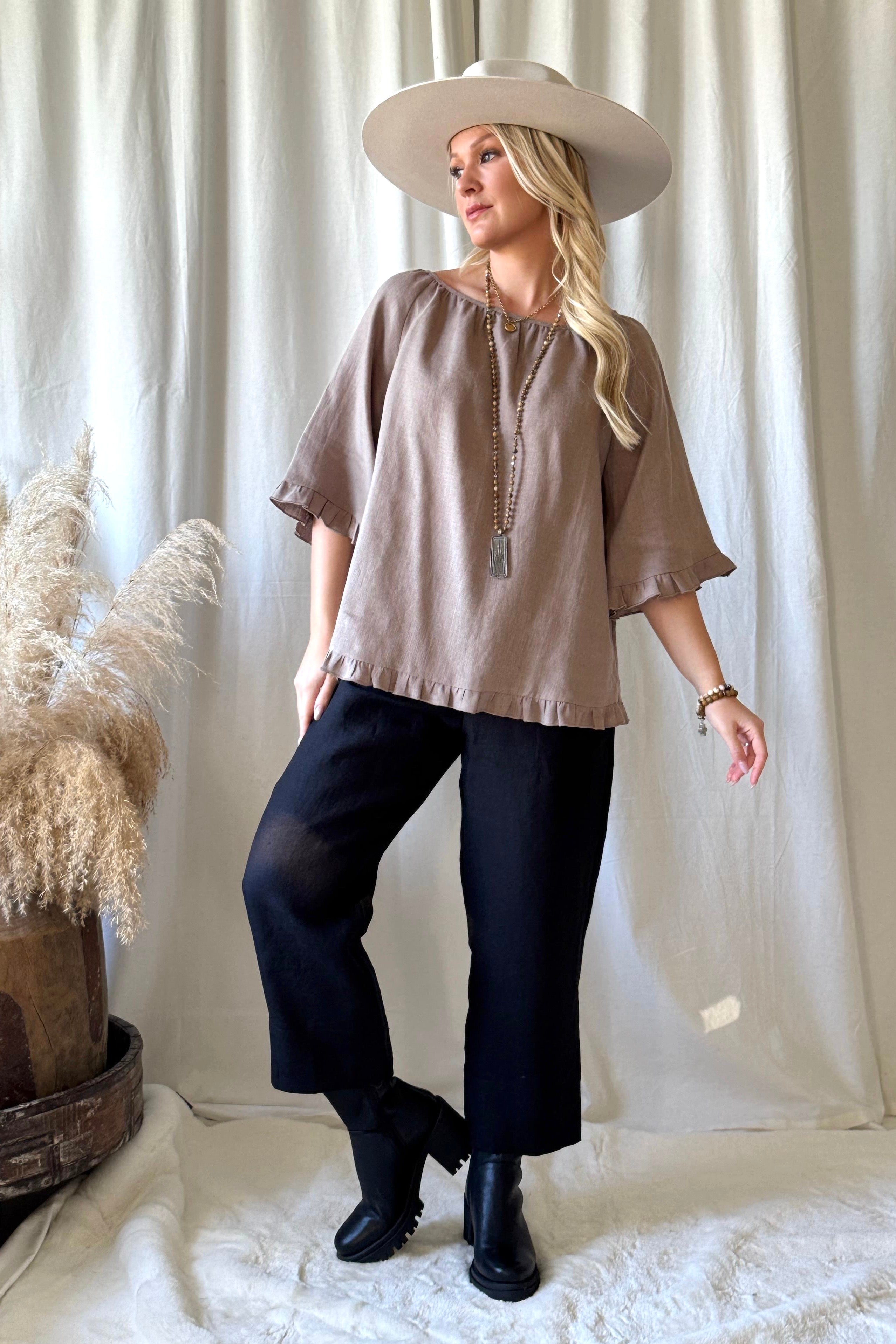 Täydellinen yhdistelmä mukavuutta ja naisellista keveyttä. Laadukas pellavakangas hengittää ja tuntuu ihanan ilmavalta iholla, tehden siitä täydellisen valinnan lämpimiin päiviin. Paidassa on avara pääntie sekä kauniit frillat helmassa ja hihoissa, jotka tuovat paidalle romanttisen ilmeen, kun taas väljä leikkaus antaa rennon ja huolettoman fiiliksen.