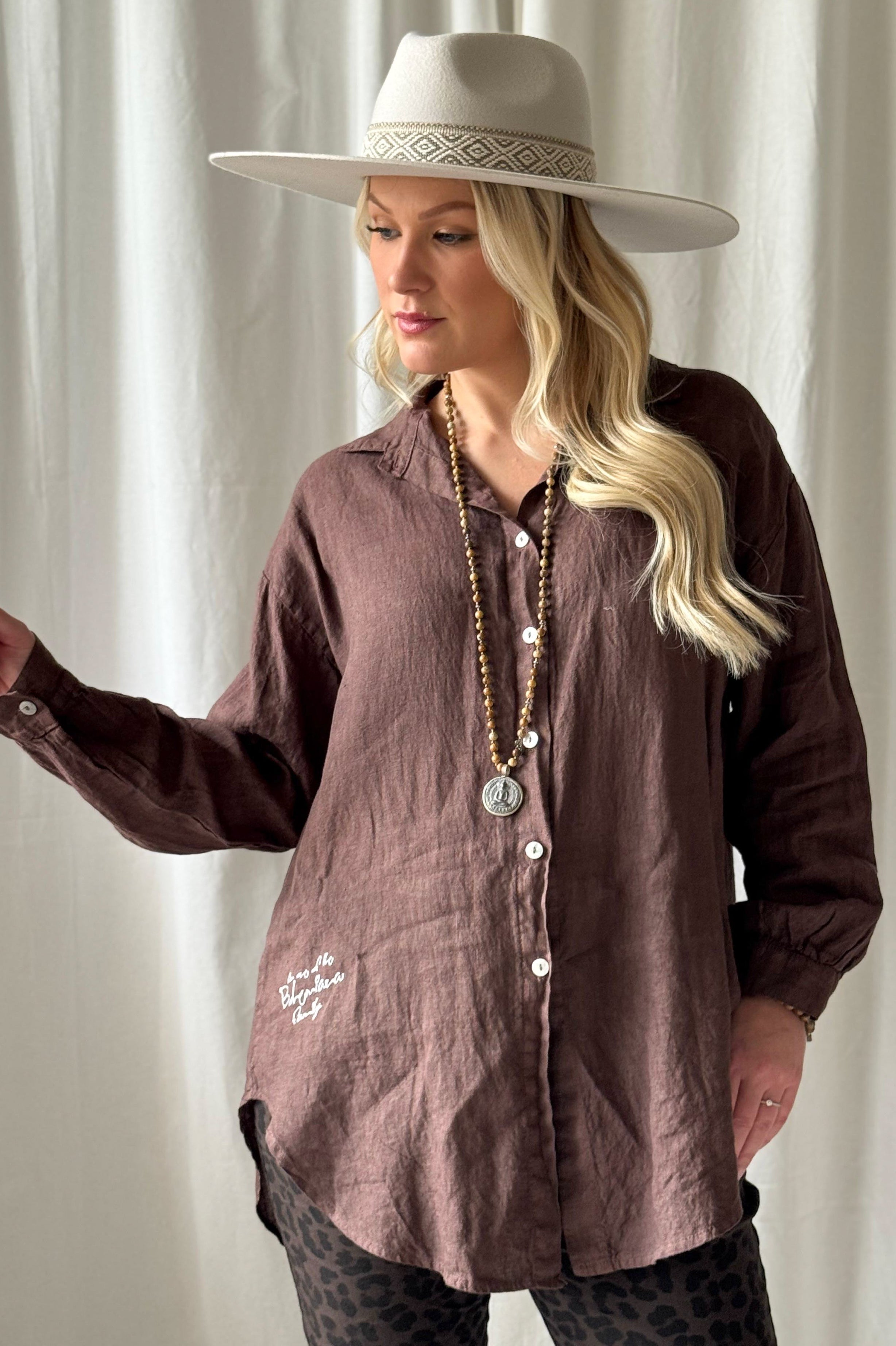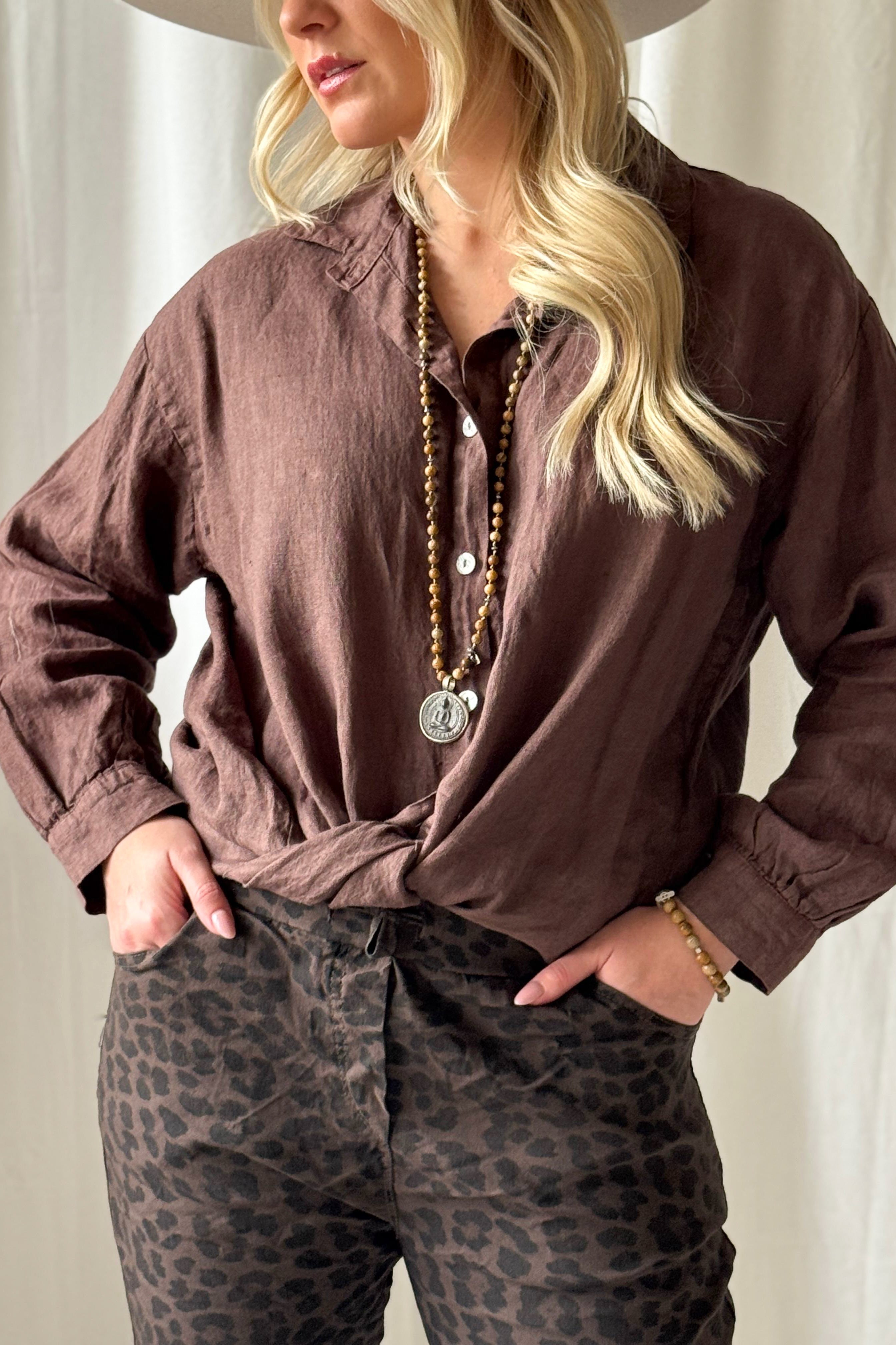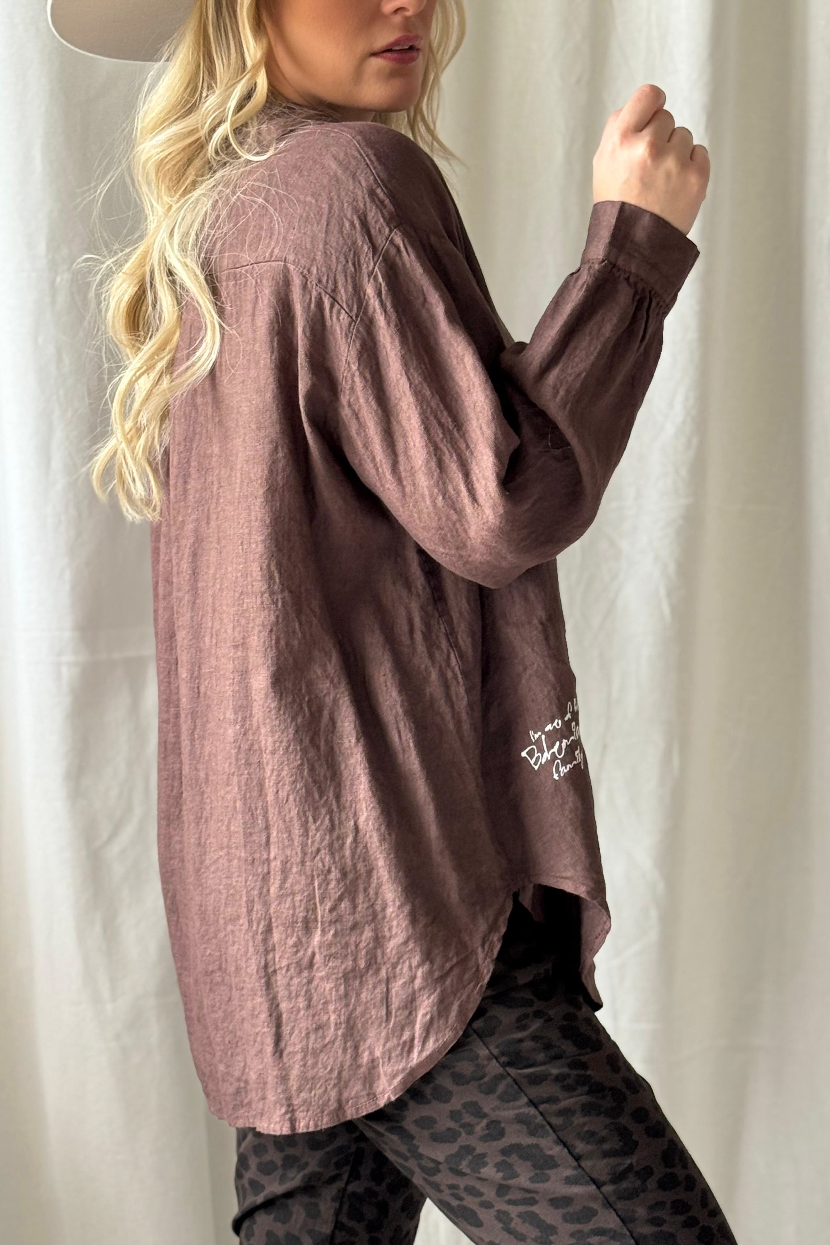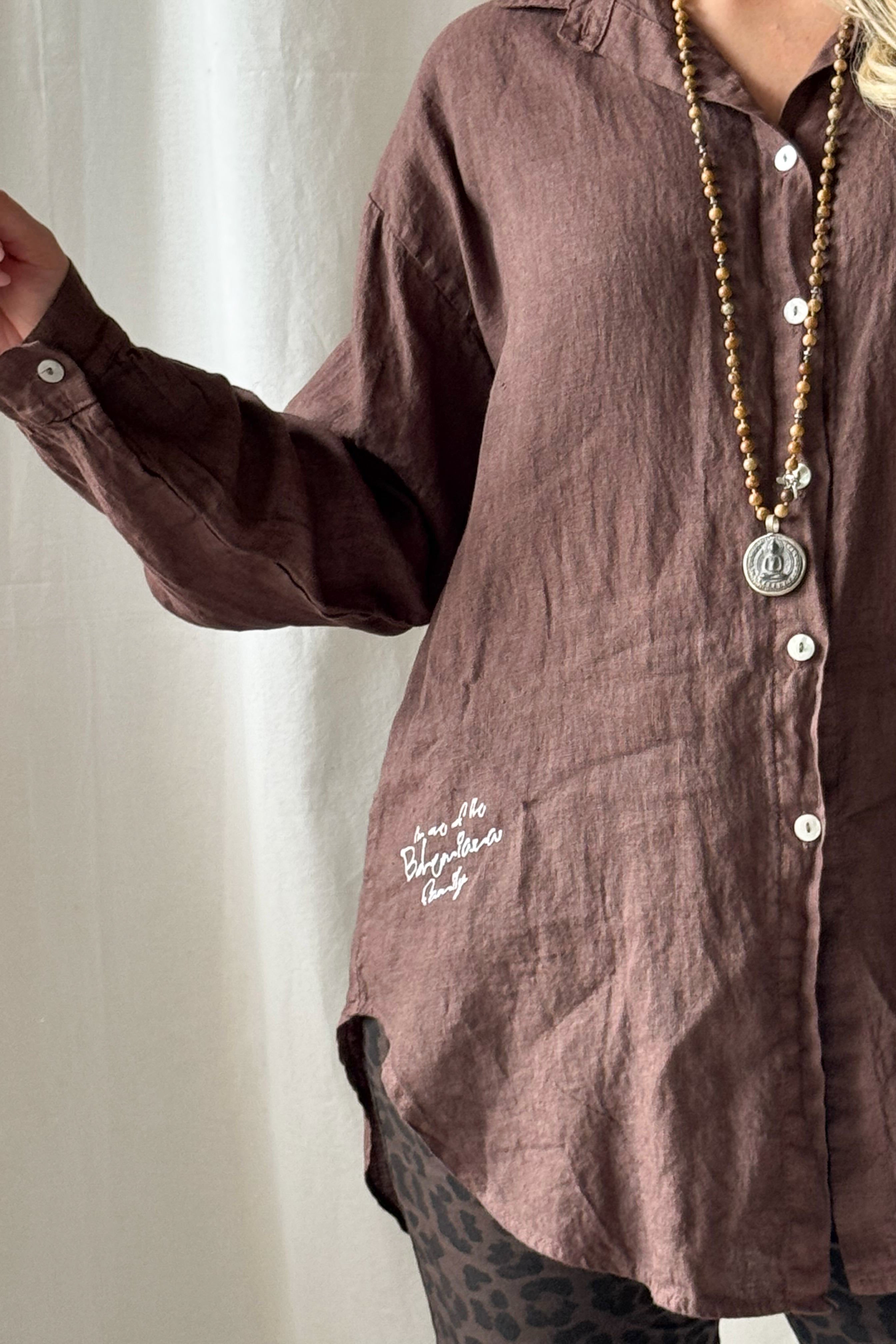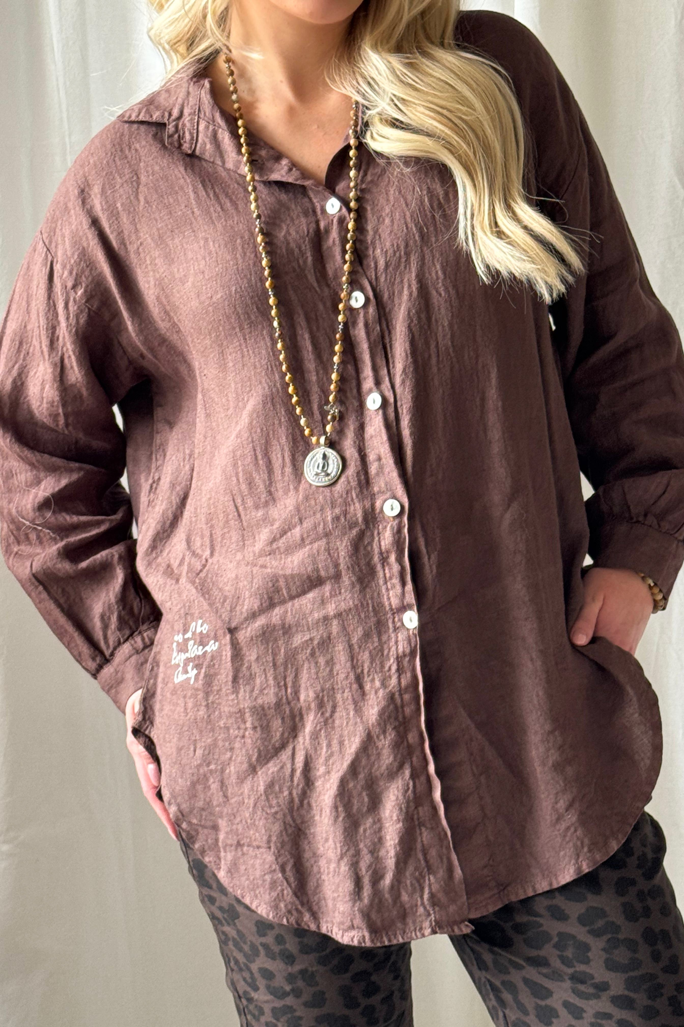 Mahtavan mallinen pitkähihainen pellavapaita, jossa on pyöristetty helma ja kaunis napitus edessä. Paita on kevyttä ja ilmavaa pellavaa ja sopii niin lämpimiin, kuin myös viileämpiin päiviin.
