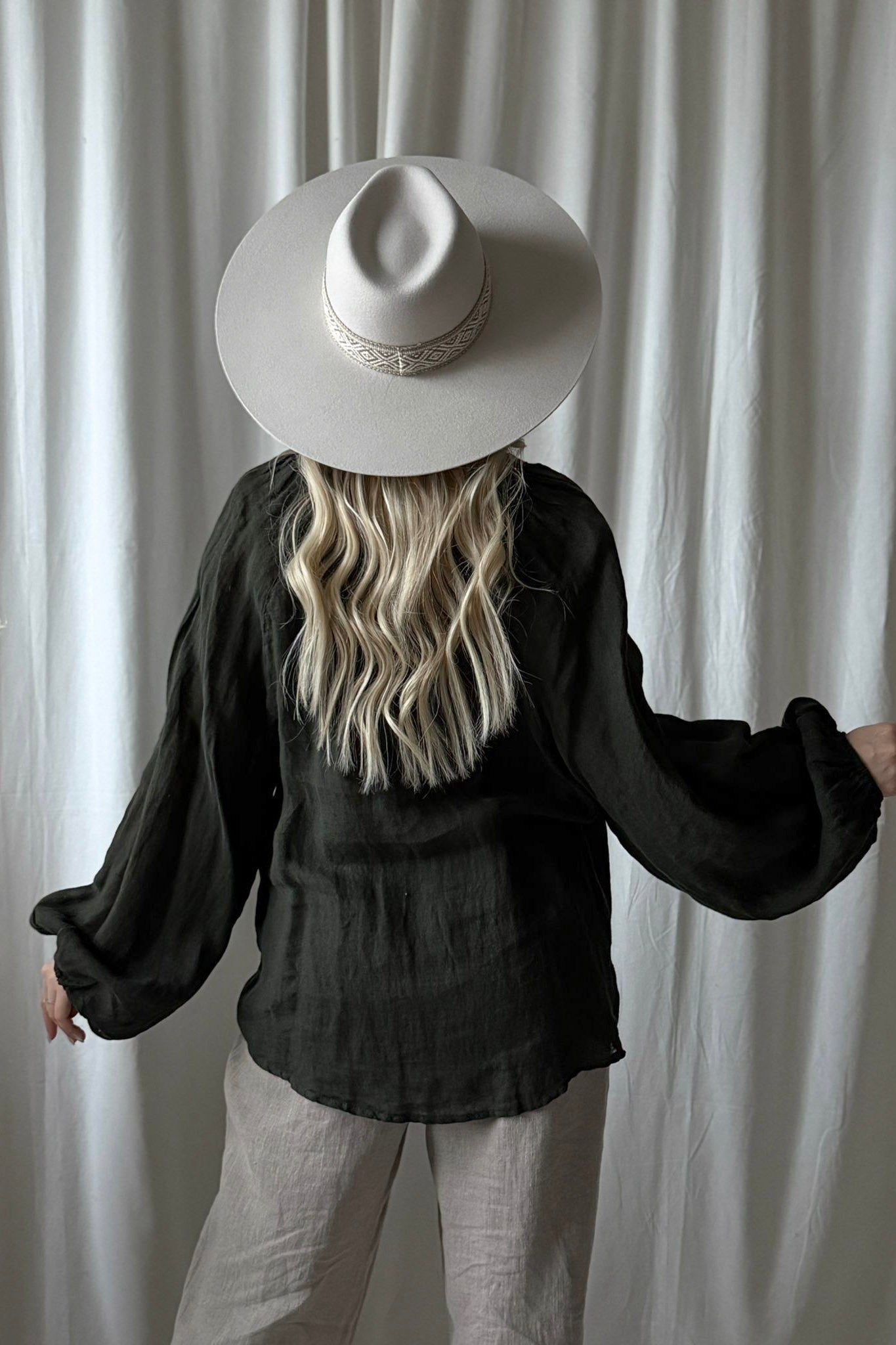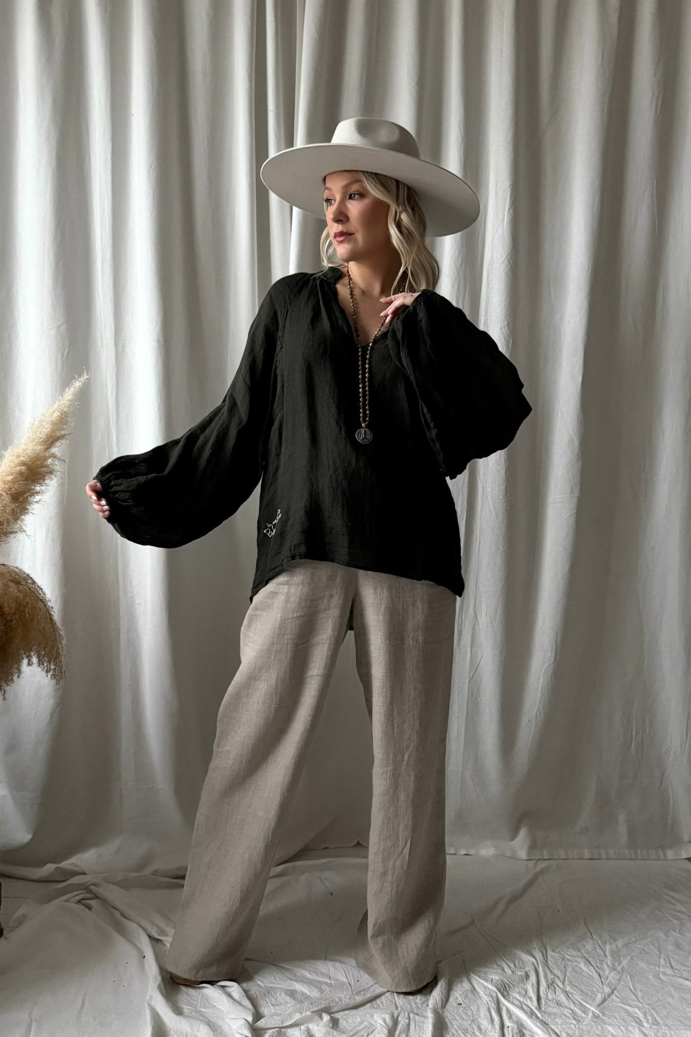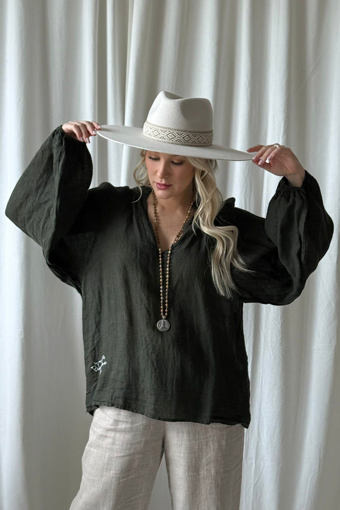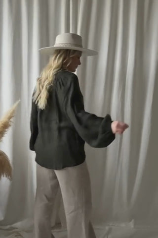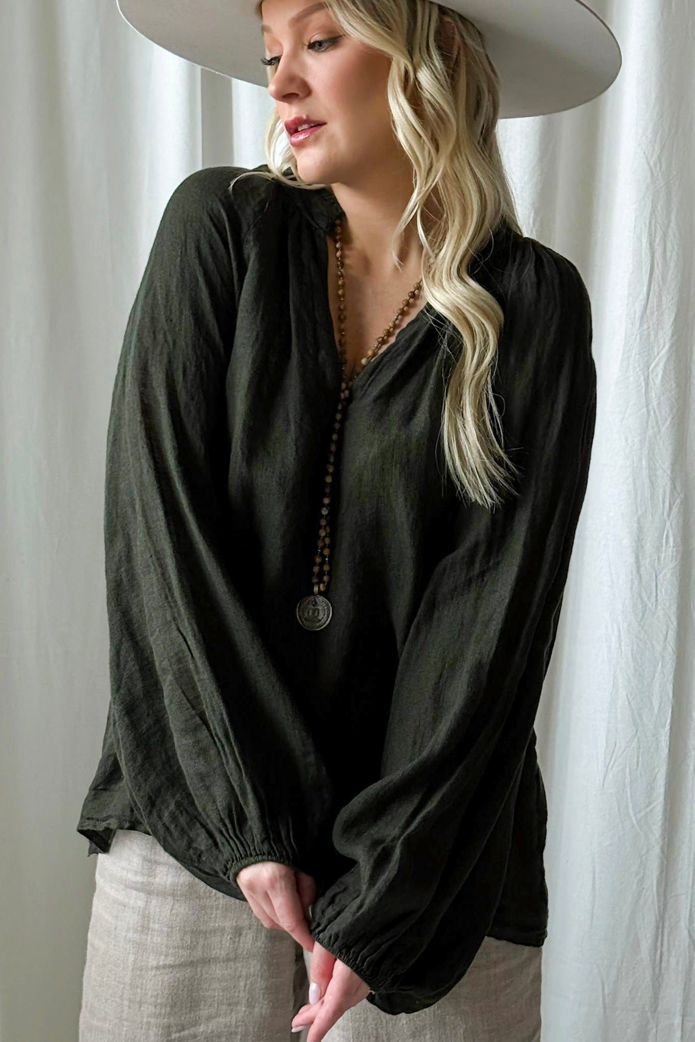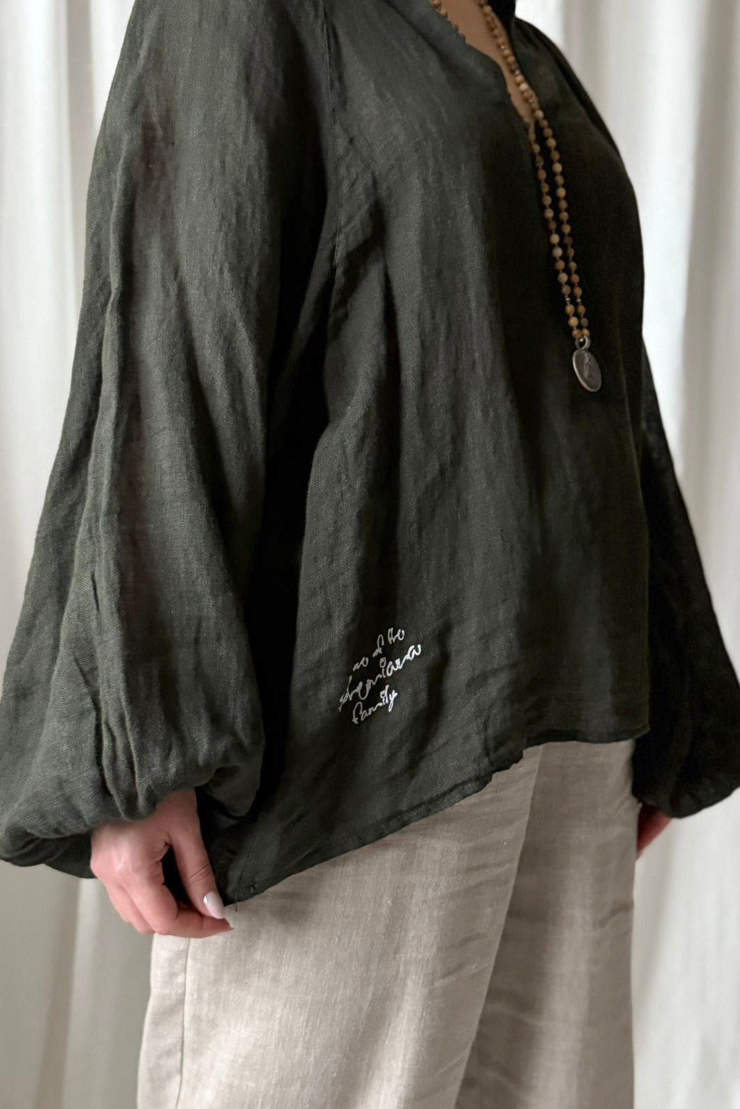 Ihana pellavapiata syvällä v-pääntiellä ja röyhelökauluksella. Leveät puhvelimaiset hihat tuovat vapautta liikkumiseen, hihansuissa resorit. Paita on tumman vihreä.