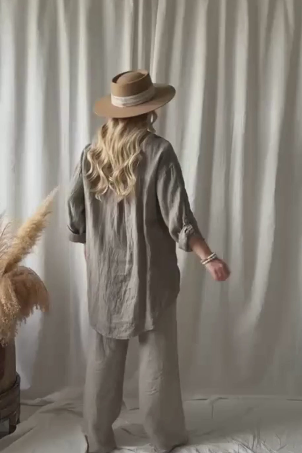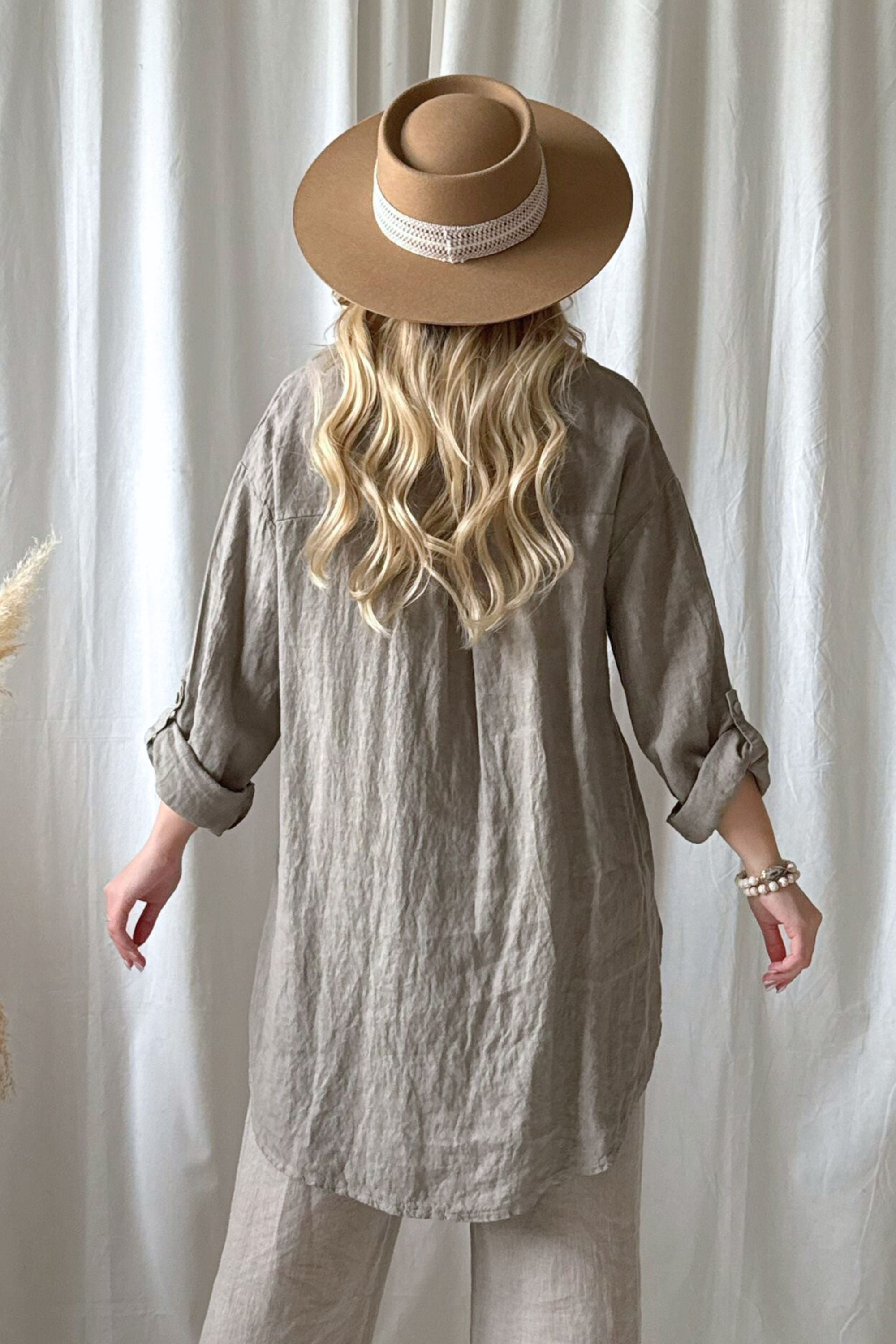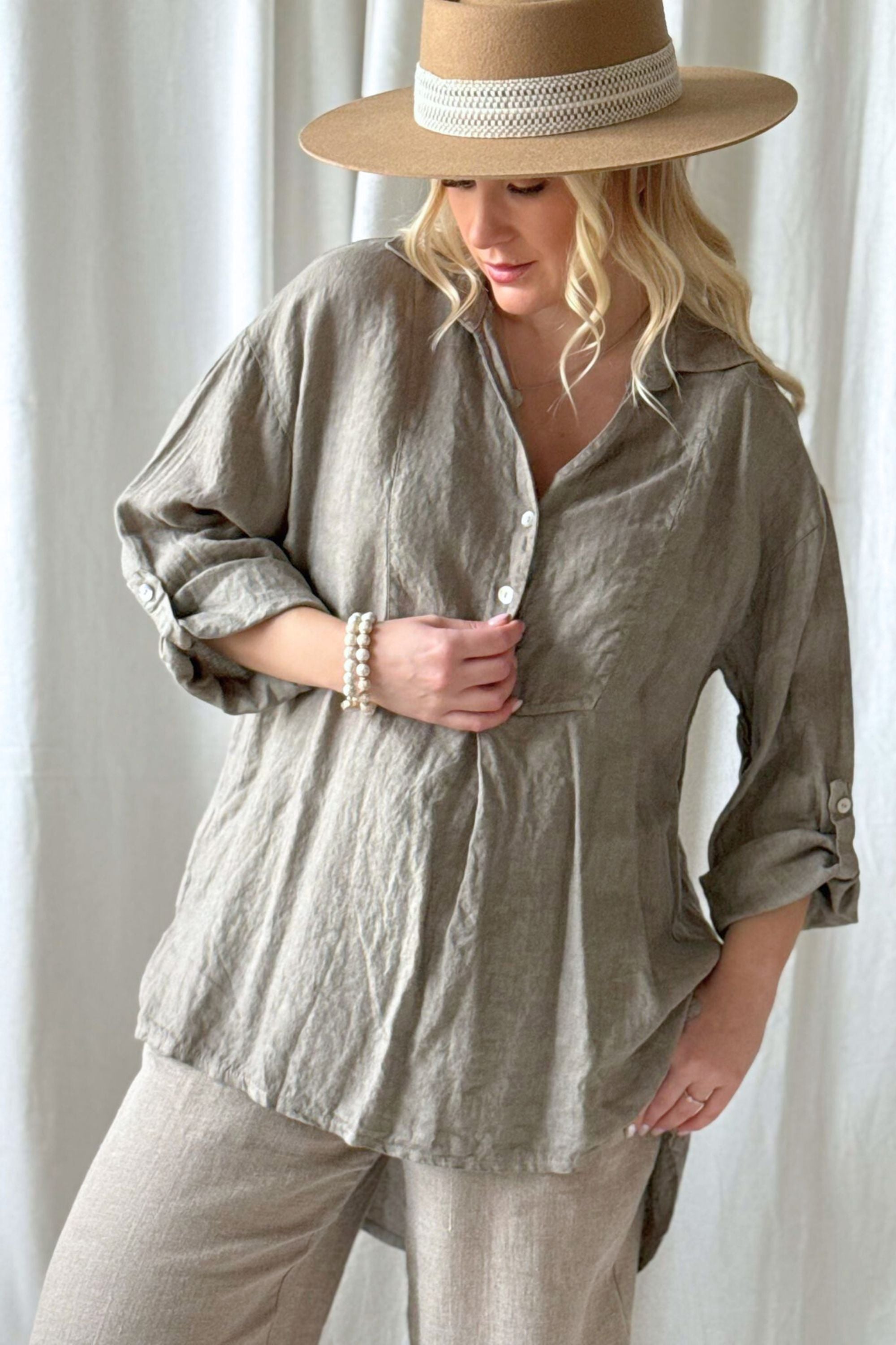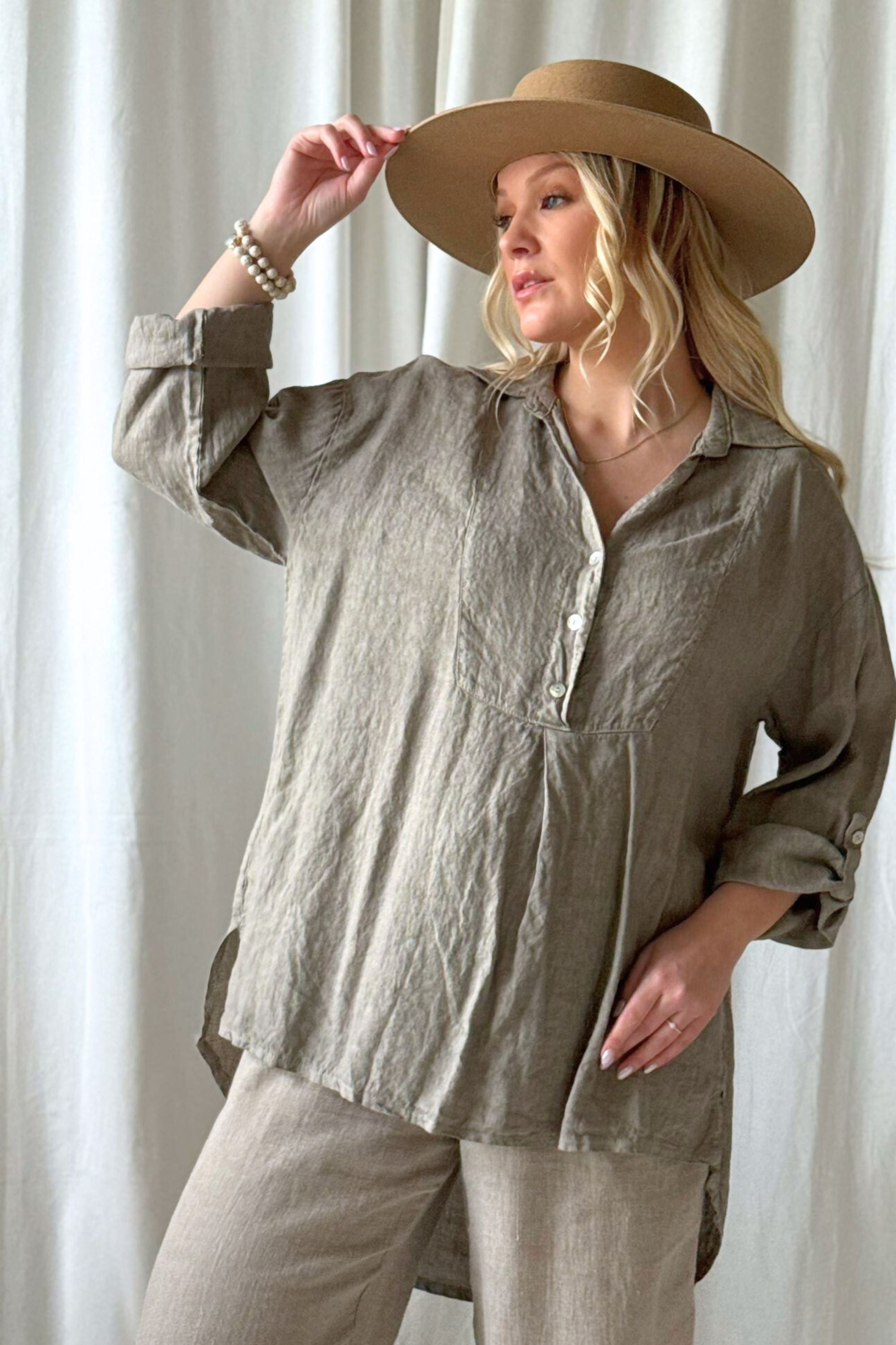 Leikkisä paita jonka jujuna on kiva etukappale, jossa on helmiäisnapitus. Hihat saa käärittyä ja kiinnitettyä napin avulla. Paita on pidempi takaa.