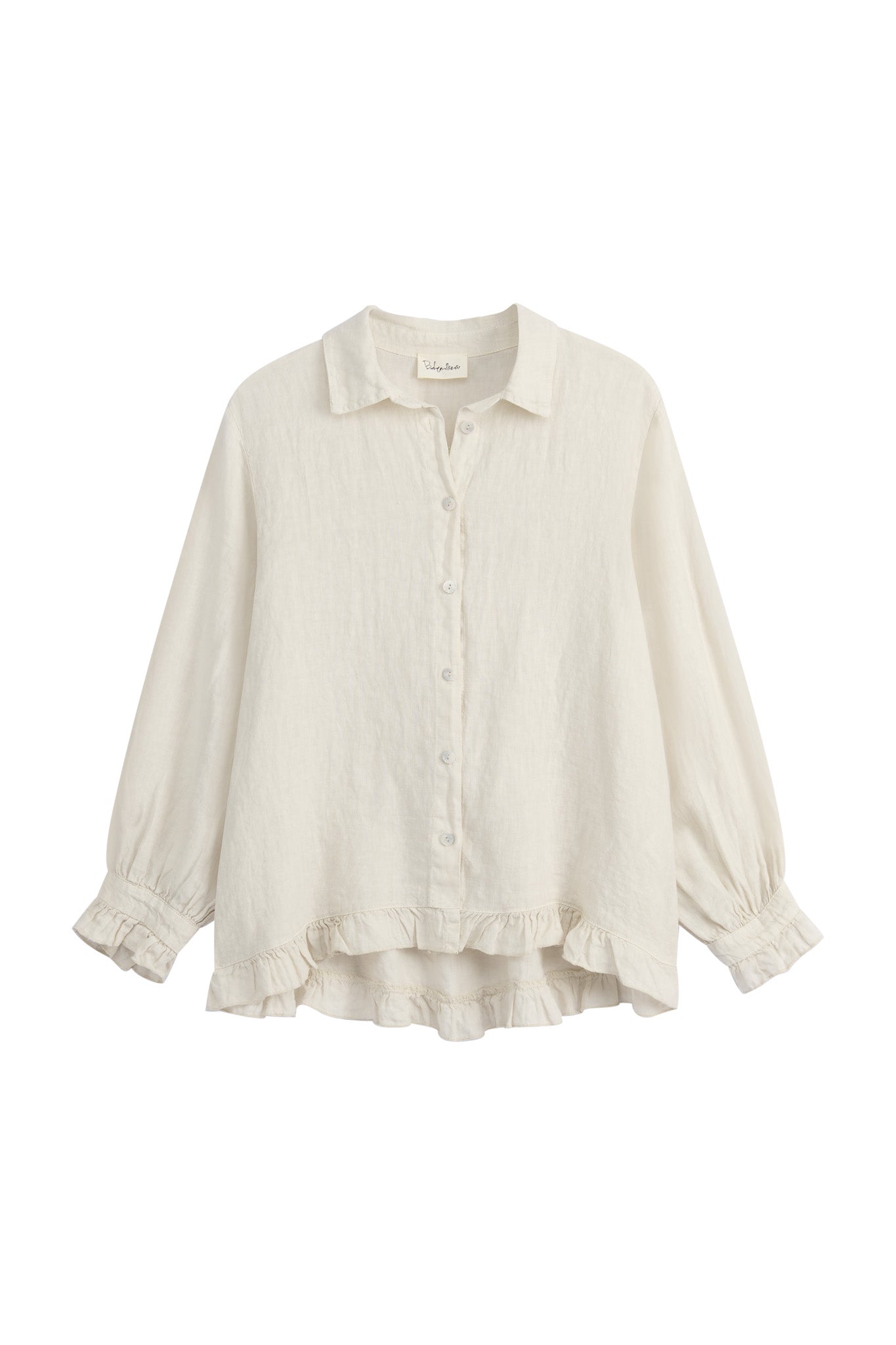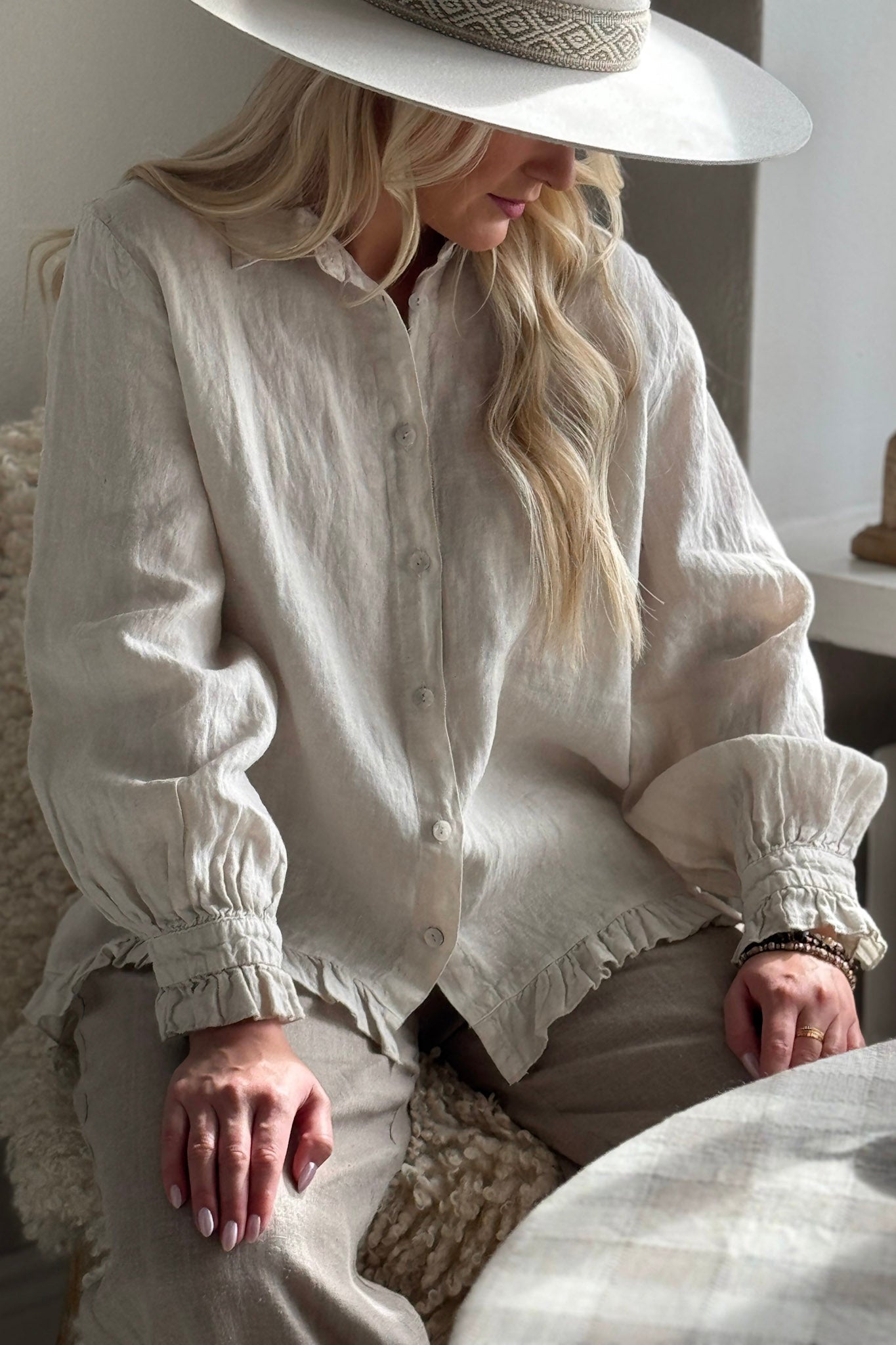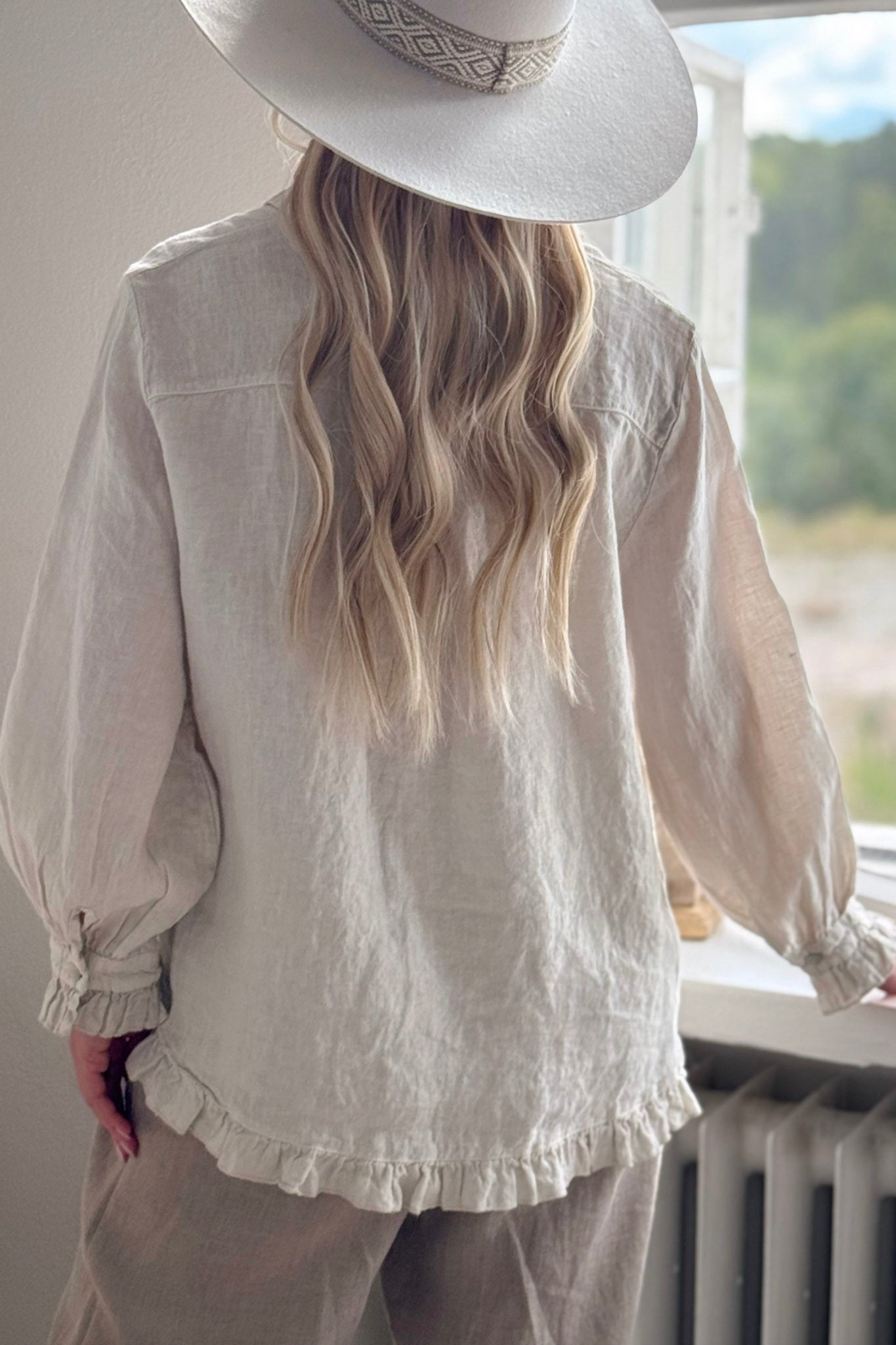 Klassisen naisellinen kauluspaita pehmeäksi pestyä pellavaa, jonka jujuna ovat hurmaavat röyhelöt hihansuissa ja helmassa. Helmiäisnapitus edessä ja hihansuissa. Helma on aavistuksen pidempi takaa kuin edestä.