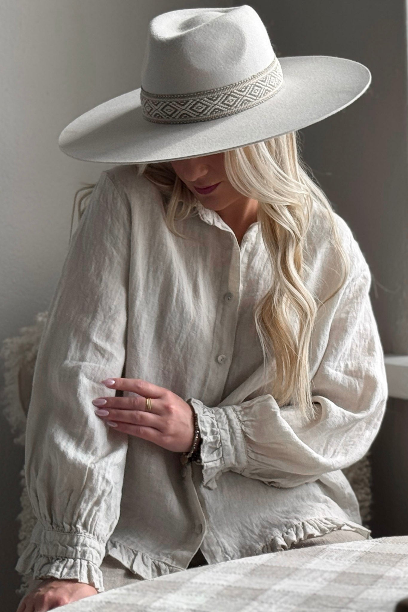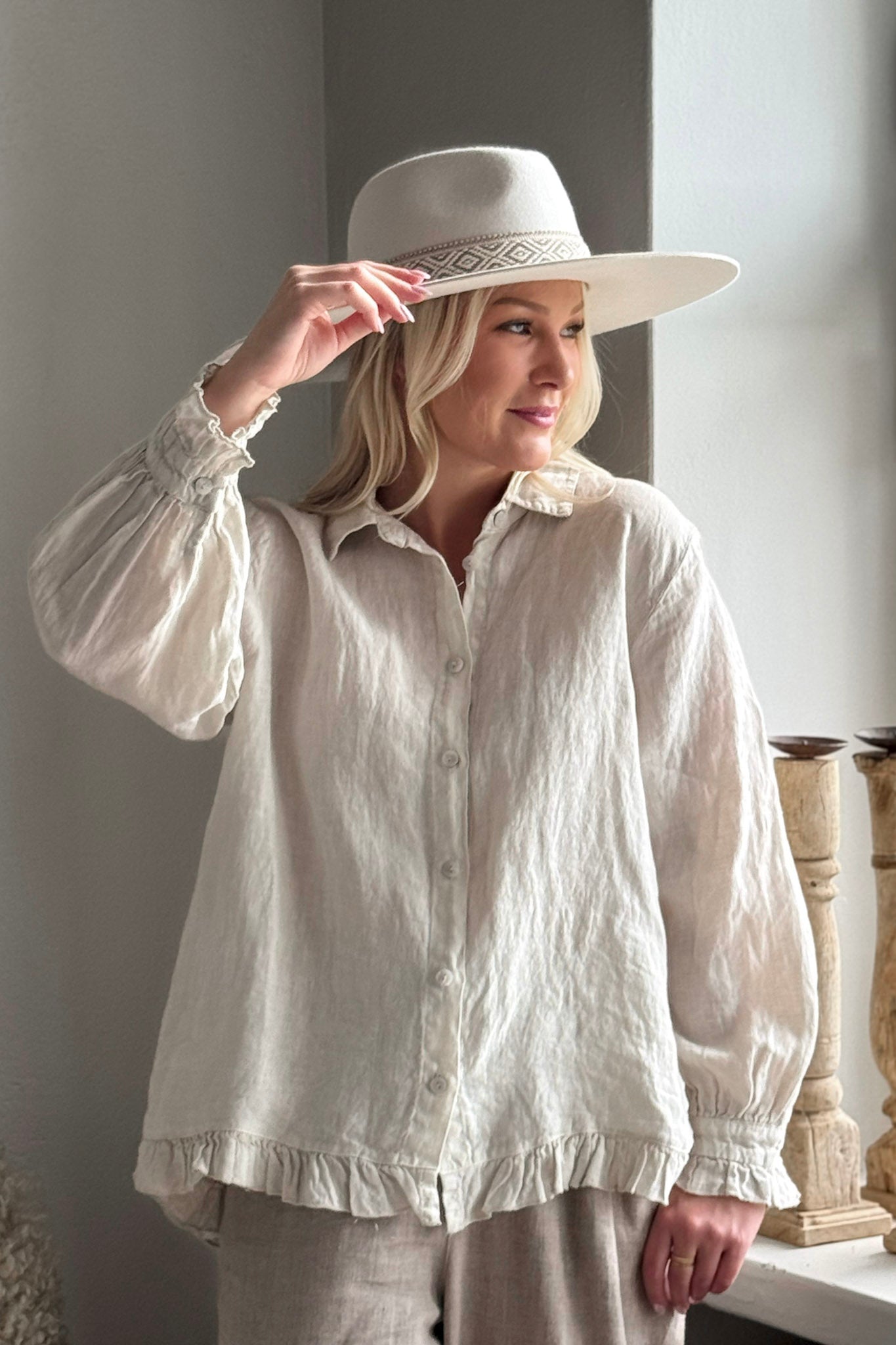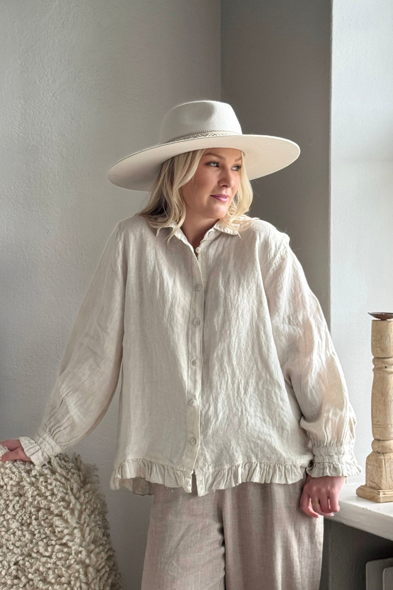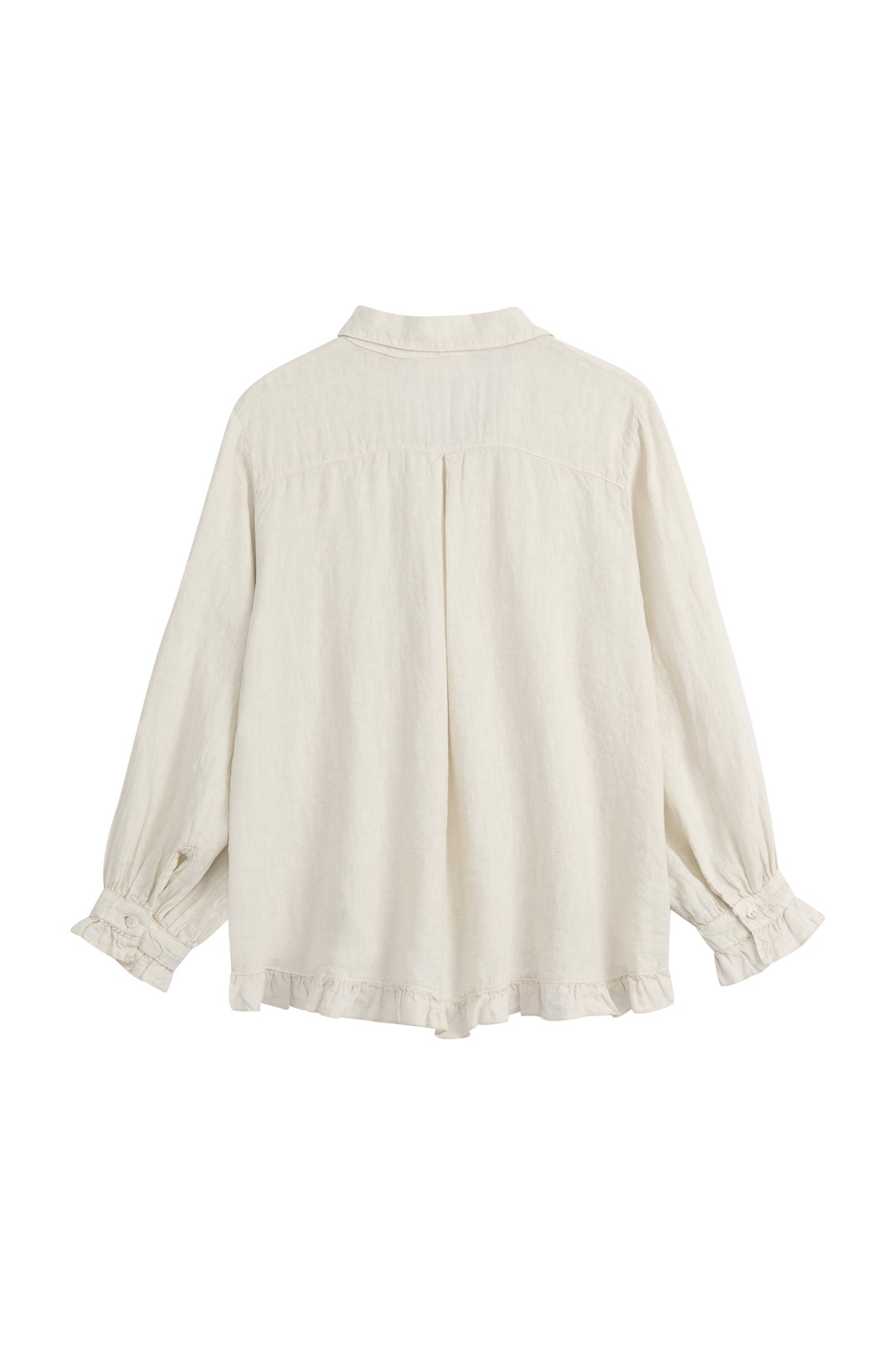 Klassisen naisellinen kauluspaita pehmeäksi pestyä pellavaa, jonka jujuna ovat hurmaavat röyhelöt hihansuissa ja helmassa. Helmiäisnapitus edessä ja hihansuissa. Helma on aavistuksen pidempi takaa kuin edestä.