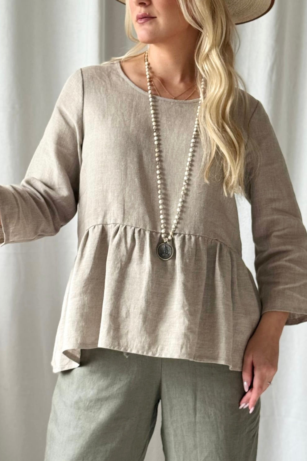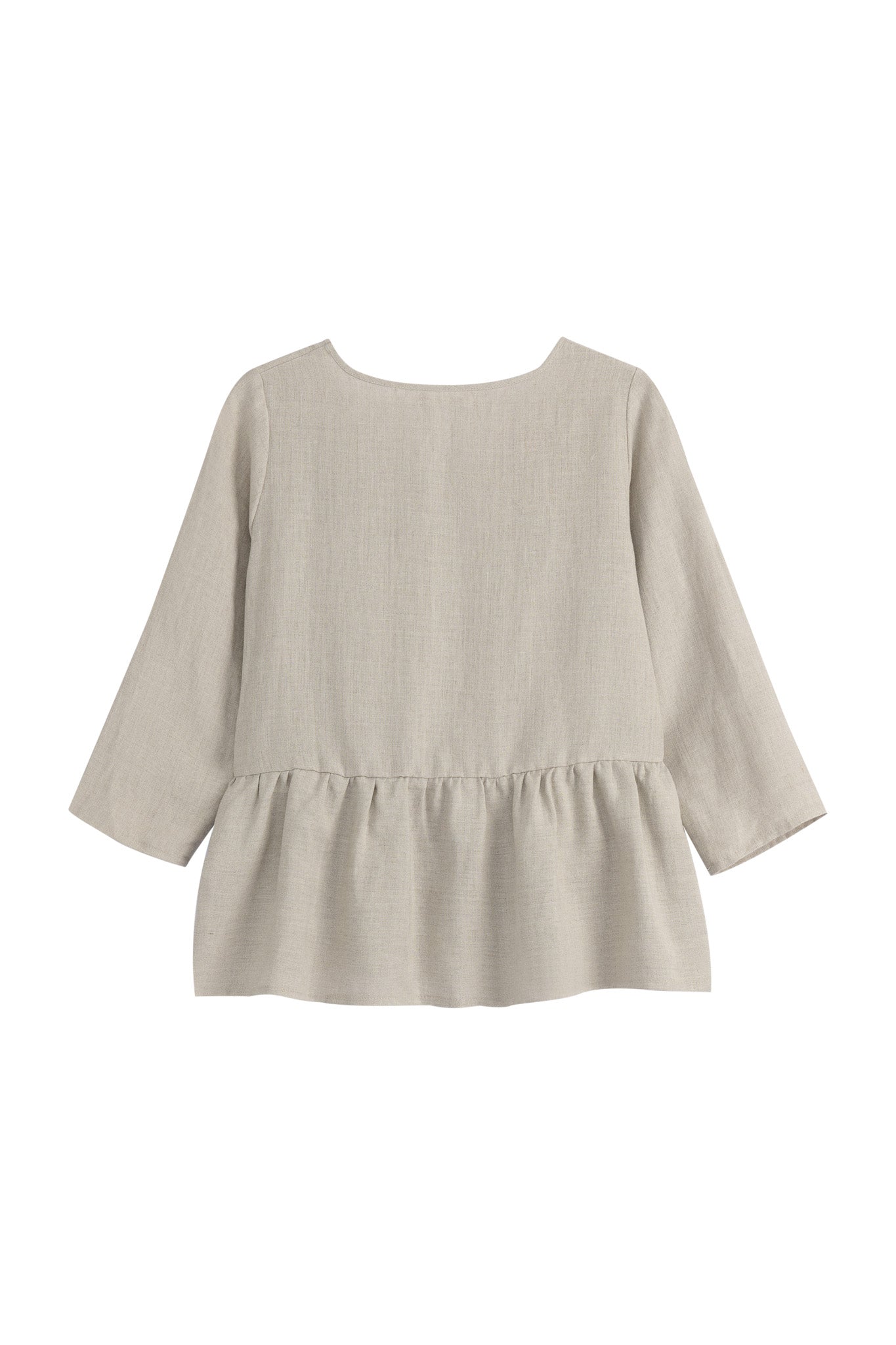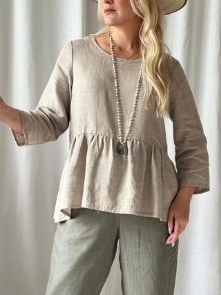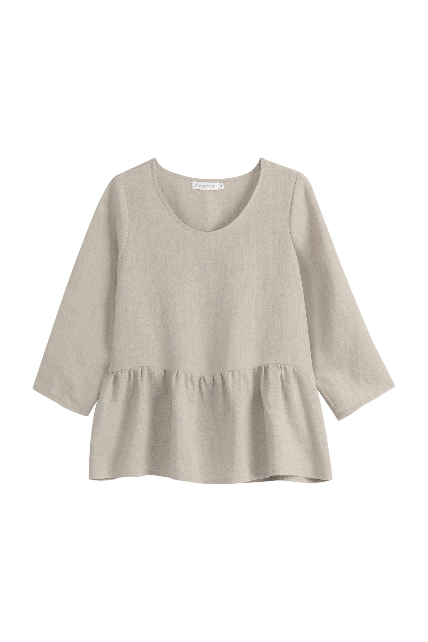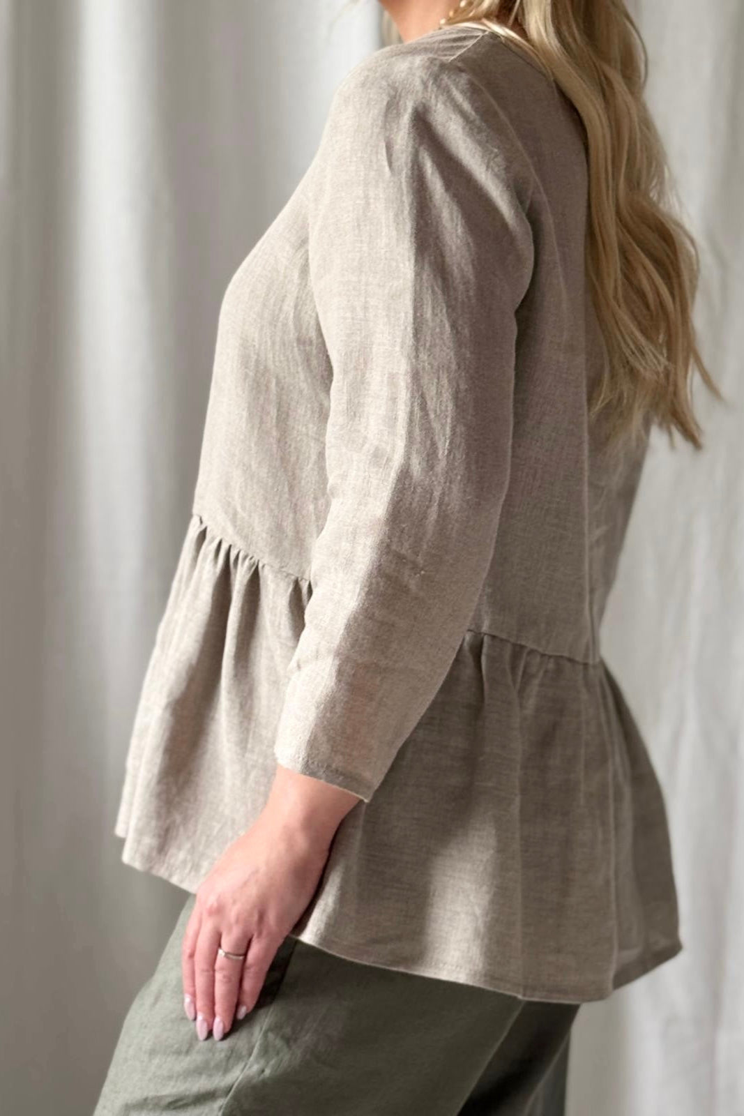 Kaunis Peplum mallinen pellavapaita tekee klassisesta paidasta juhlallisemman kauniin frillan avulla. Paidalla on pyöreä pääntie ja hieman vajaapituiset hihat.