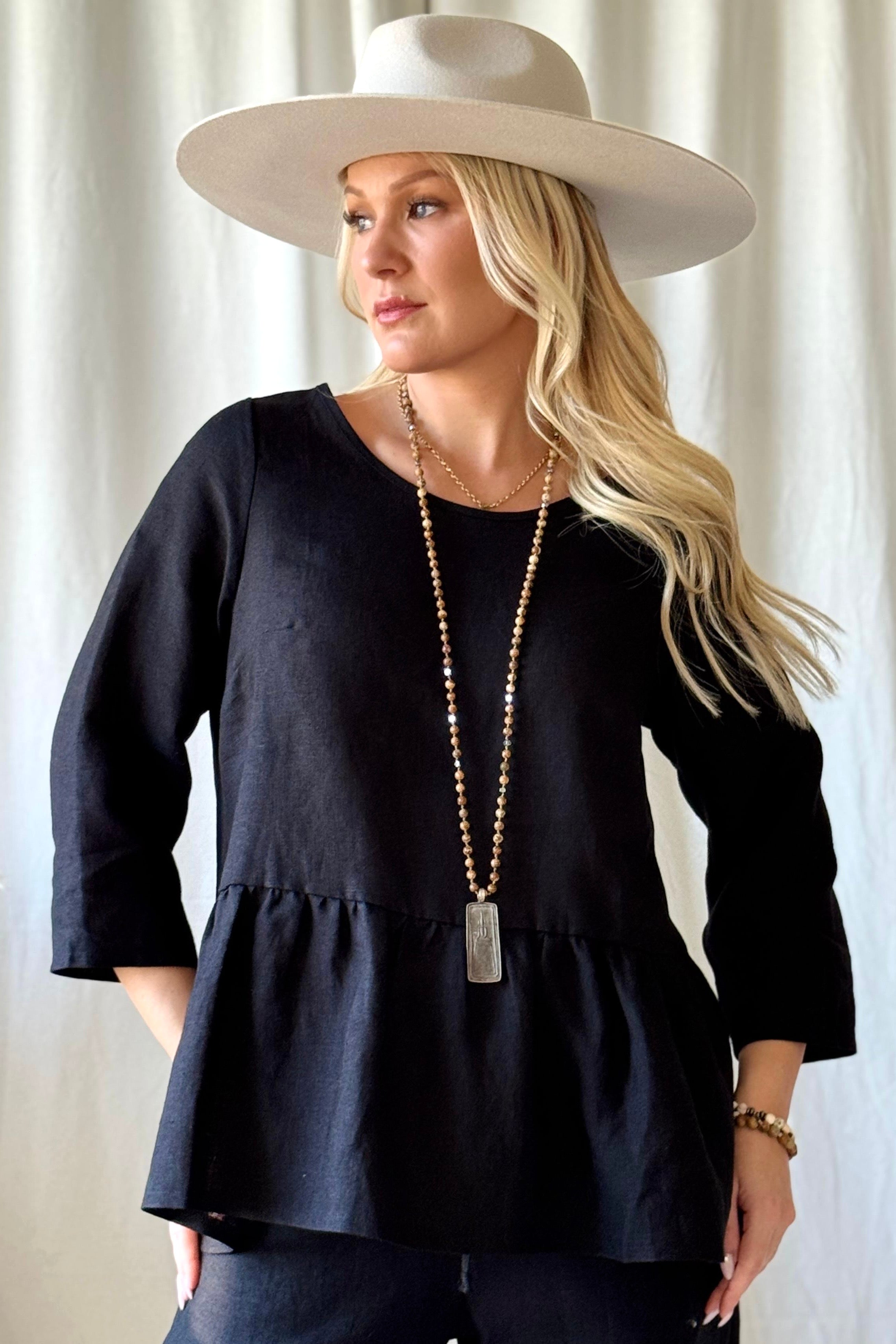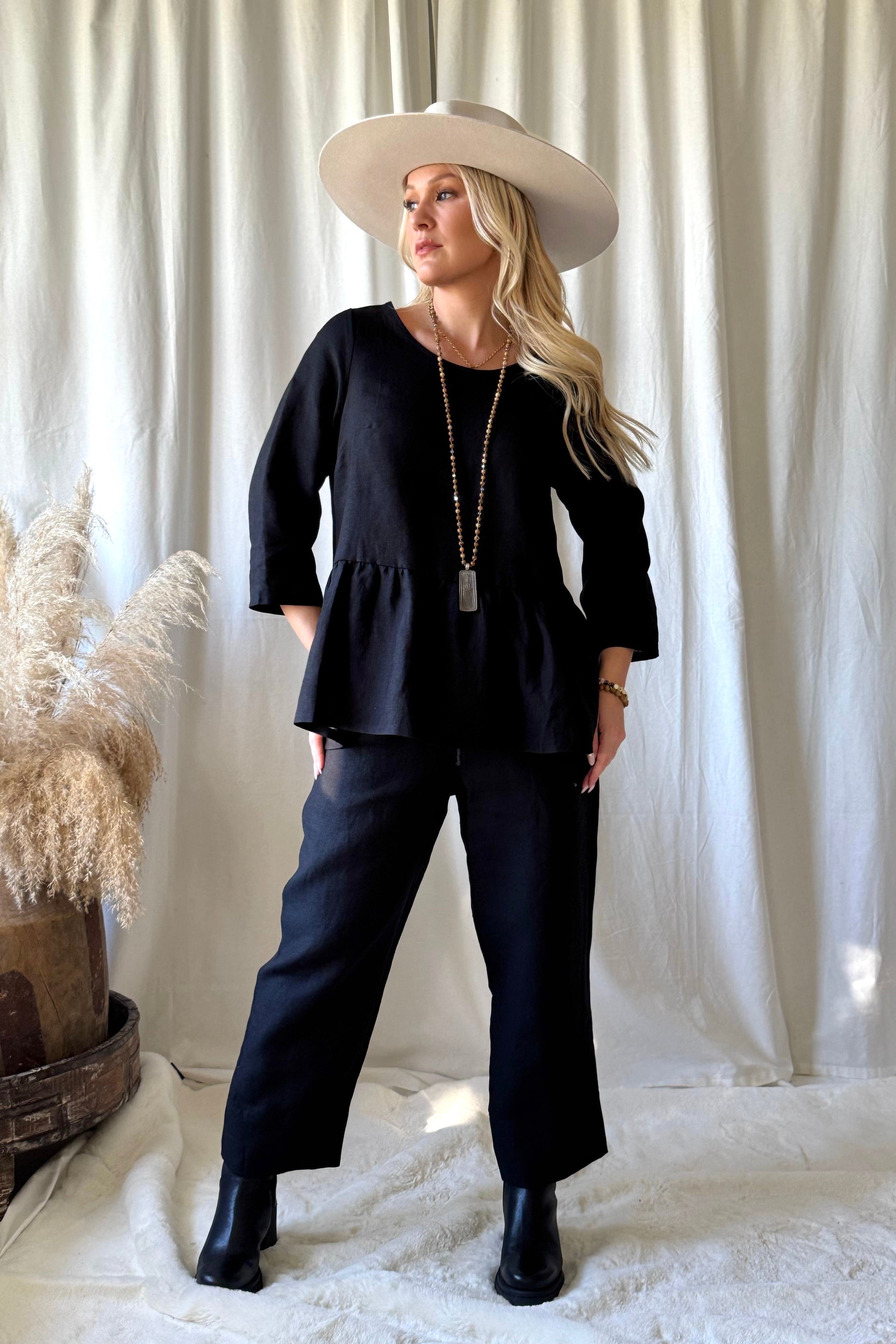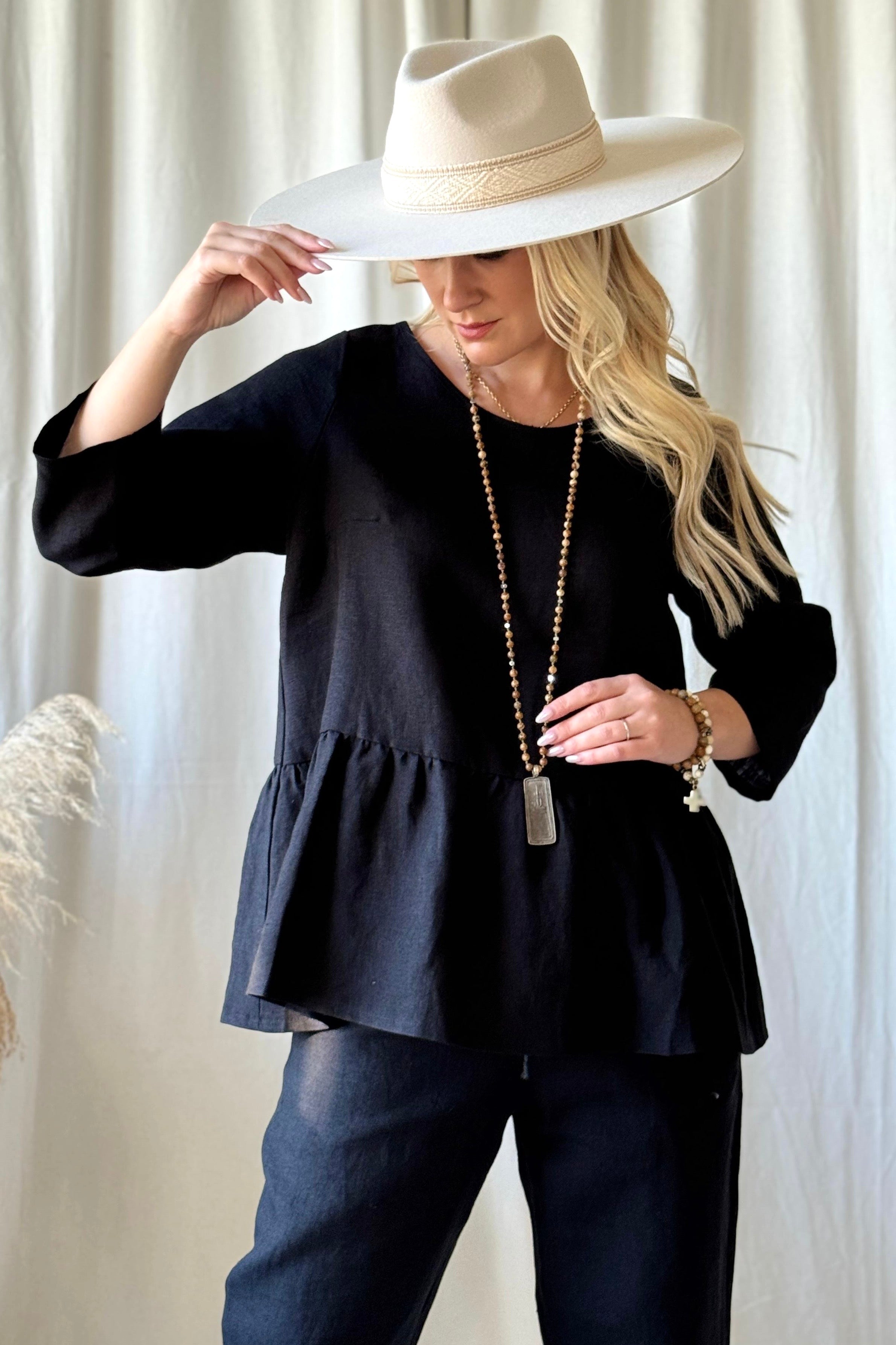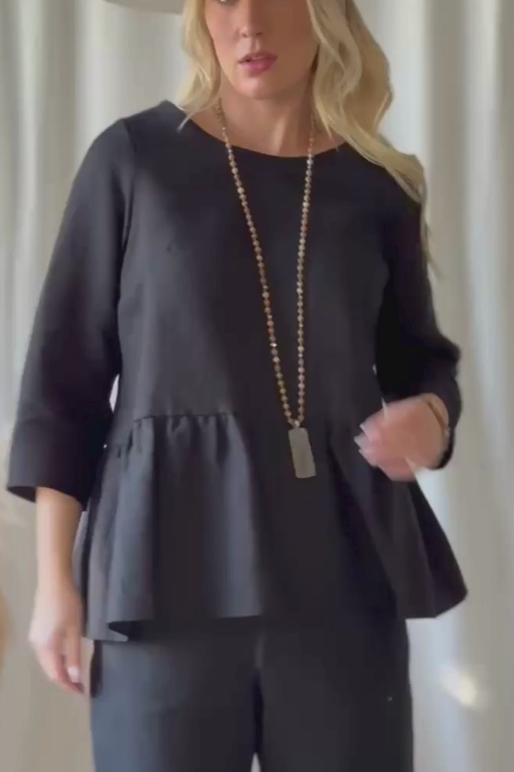 Kaunis Peplum mallinen pellavapaita tekee klassisesta paidasta juhlallisemman kauniin frillan avulla. Paidalla on pyöreä pääntie ja hieman vajaapituiset hihat.