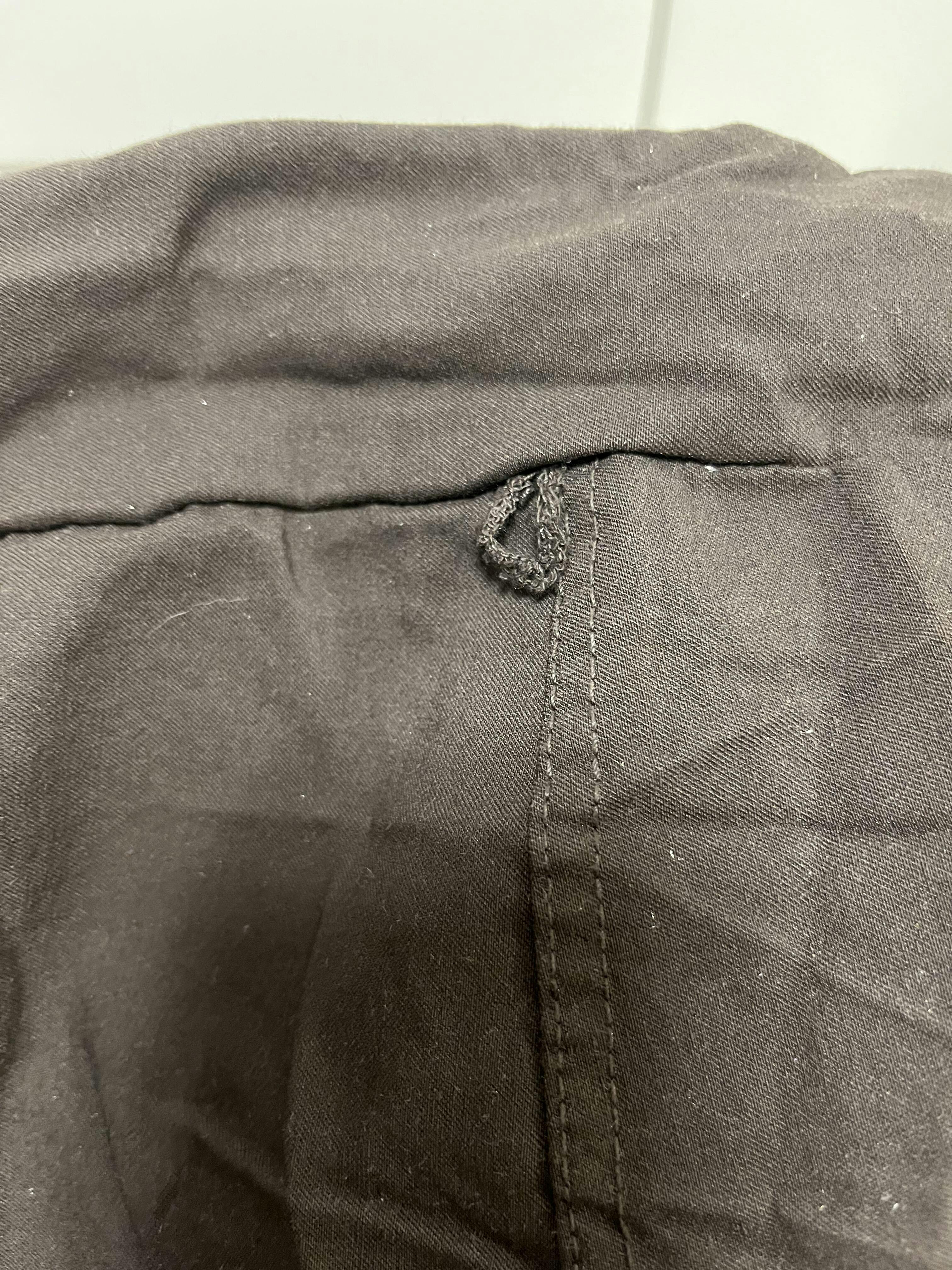 Takataskut pikkasen liian alhaalla. Vyötärön saumasta tuli lanka ulos parin käytön jälkeen.Todella reilua kokoa, jopa xl ihmiselle.