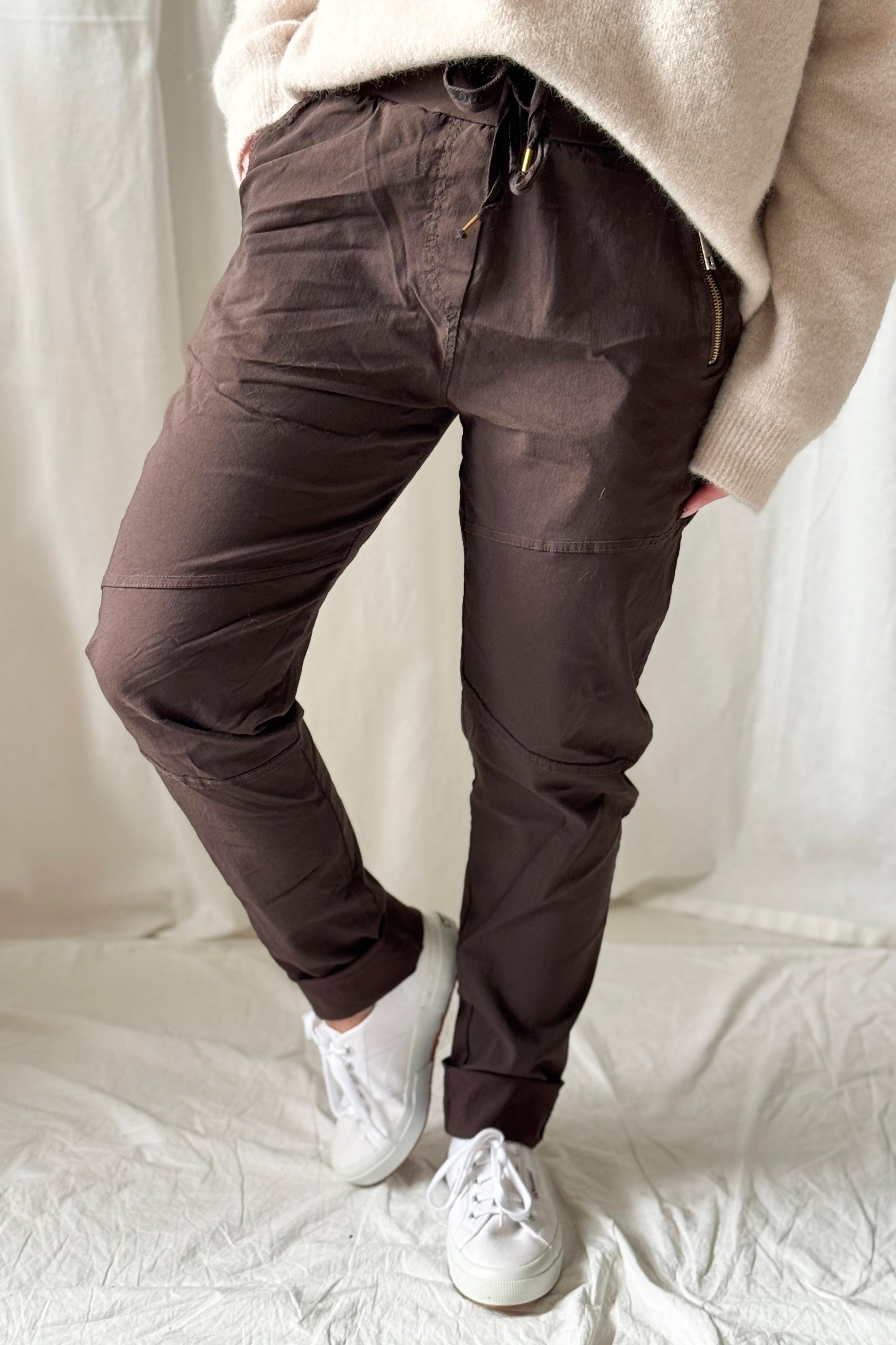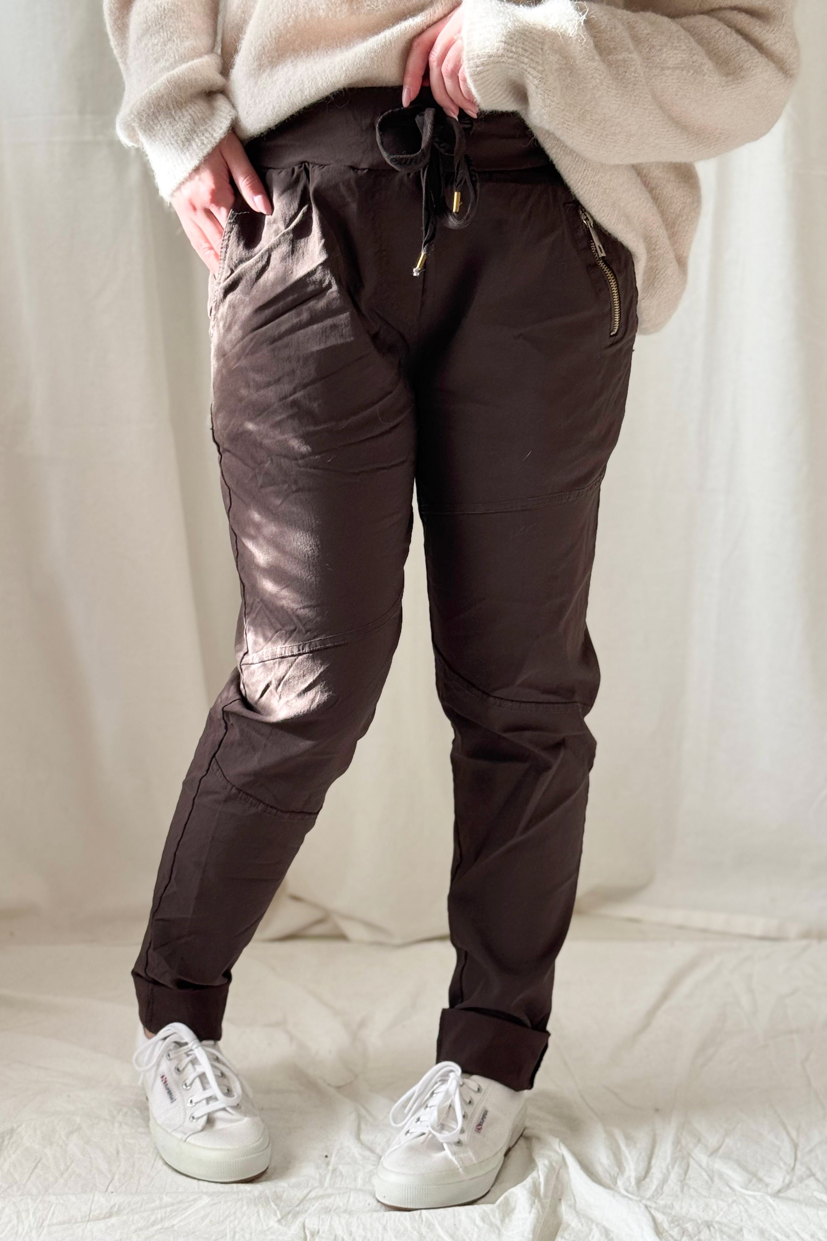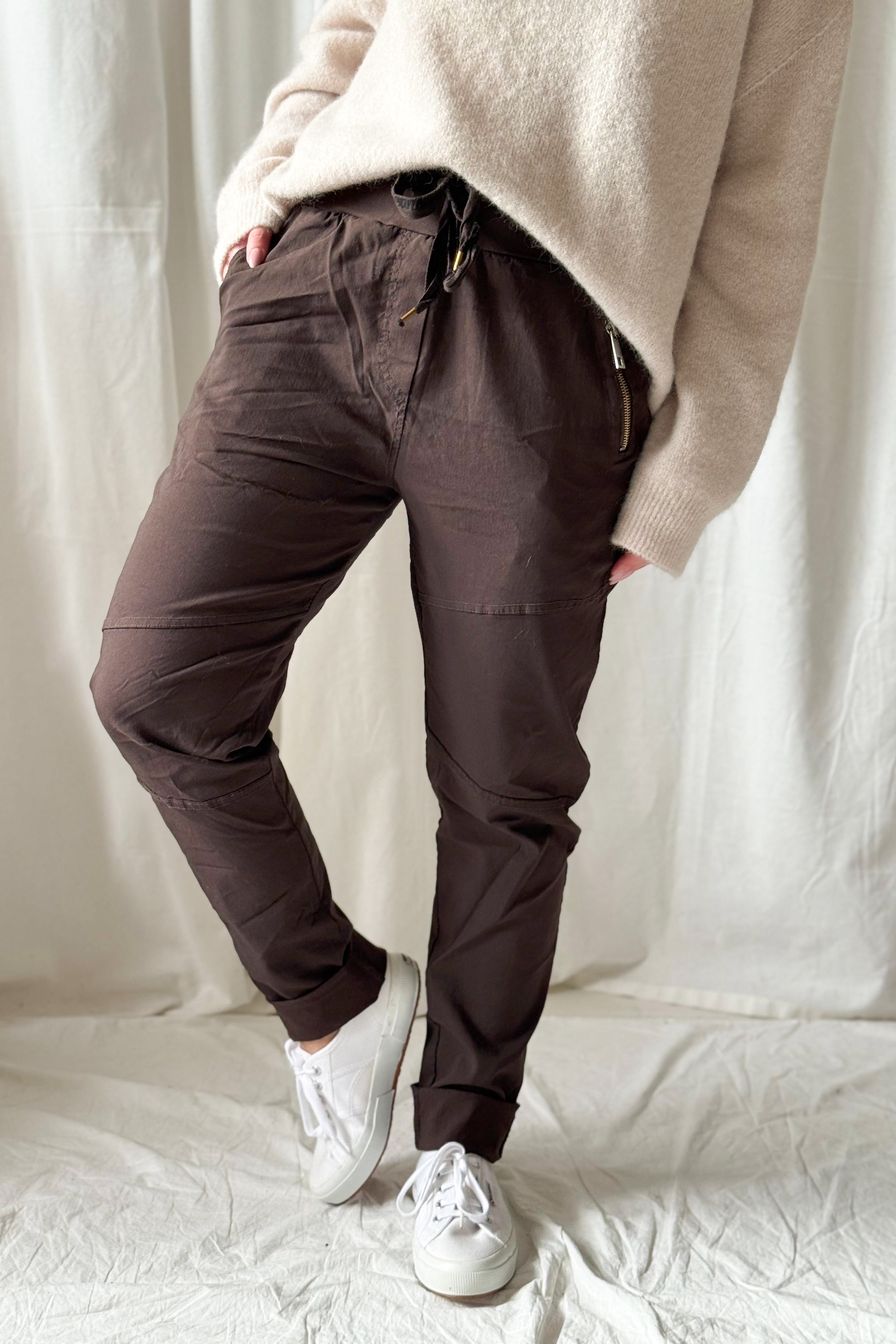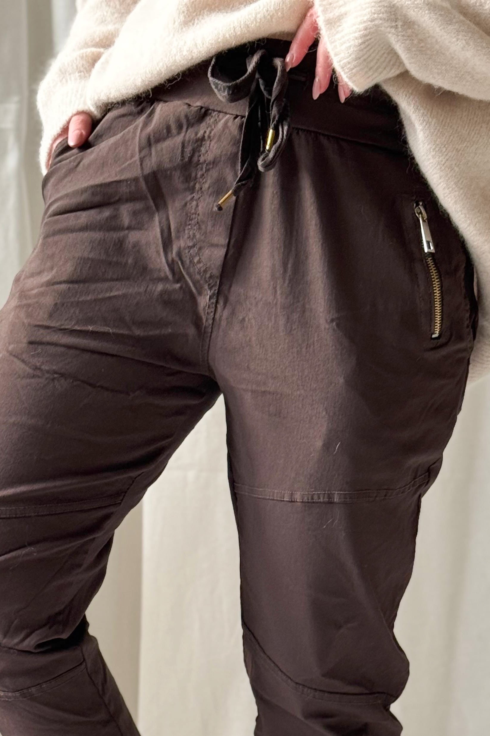 Hyvin joustavissa joggereissa on jujuna epäsymmetriset tikkaukset lahkeiden etuosassa. Toisella puolen piilovetoketju somisteena, ja joggereissa sivutaskut. Pull on malli, ei kiristäviä vetoketjuja tai nappeja. Huikea istuvuus eri vartalonmalleille, materiaali stretchaava bengaline.
