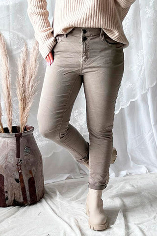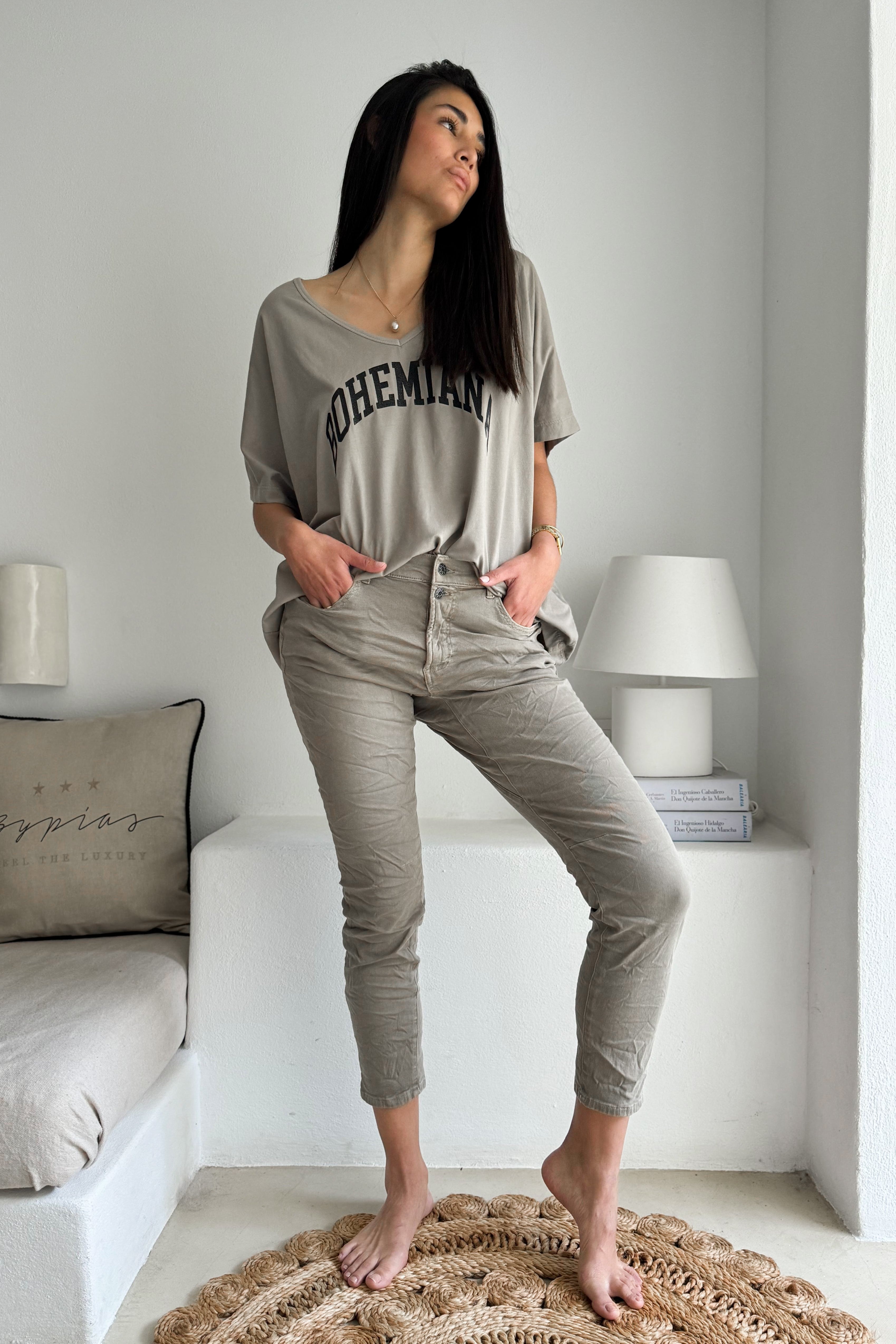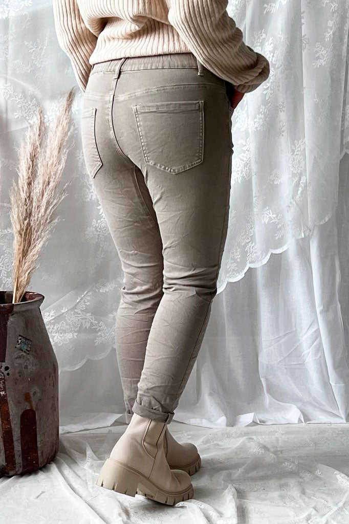 Todelliset must-have farkut! Rento Boyfriend-malli, pehmeää ja hyvin joustavaa stretch-materiaalia. Käännetyt lahkeet ja kuminauhavyötärö takana. Joustavan materiaalin ja puolikorkean vyötärön ansiosta todella miellyttävät housut päällä.