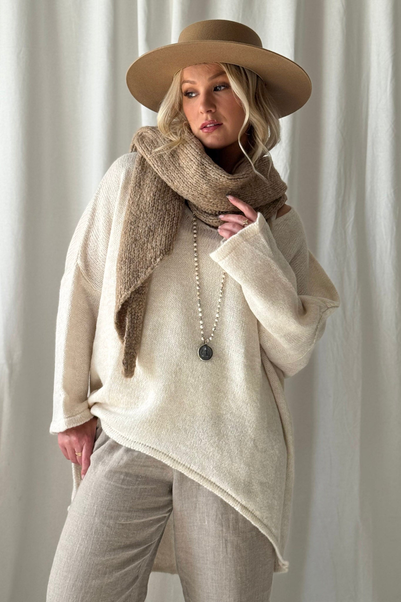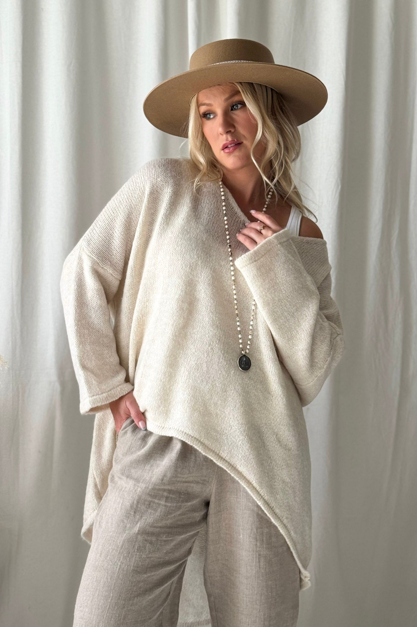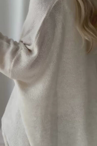 Ylellisen pehmeä neule, jossa kevyt v-pääntie ja helma pitenee sivuilta kauniisti. Täydellinen lisä viileämpiin päiviin esimerkiksi pellavahousujen kanssa.