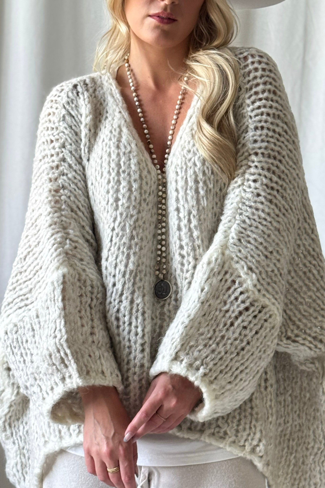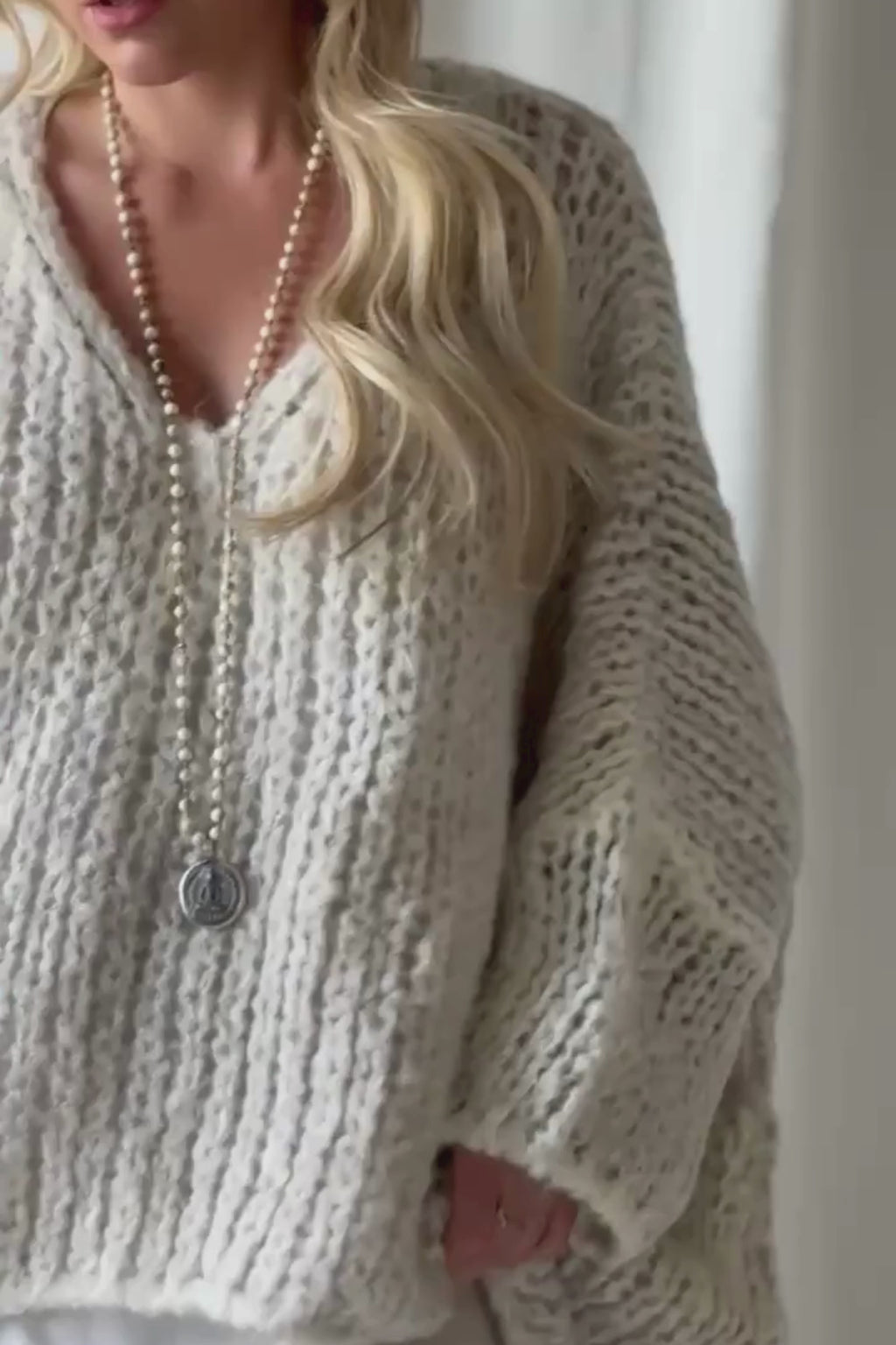 Muhkea ja ylellisen pehmeä, erittäin oversize neule, jossa on v-pääntie ja madallettu olkapäälinja. Hihat ovat hieman vajaamittaiset ja ihanan väljät. Neulepaita on isoa neulosta ja alle on kätevä yhdistää vaikkapa bamboo-toppi. Neuleen väritys jäljittelee ''spray-effect'' tyyliä, jolloin väritys on kauniin usvainen ja epäsäännöllinen.
