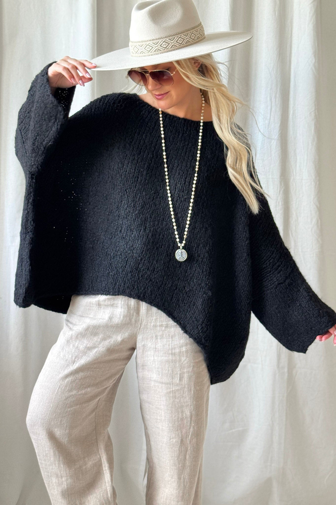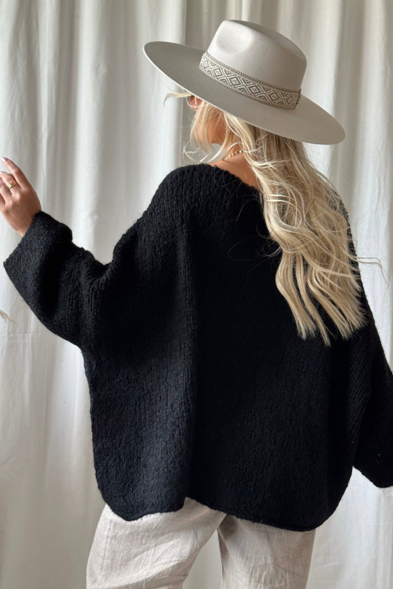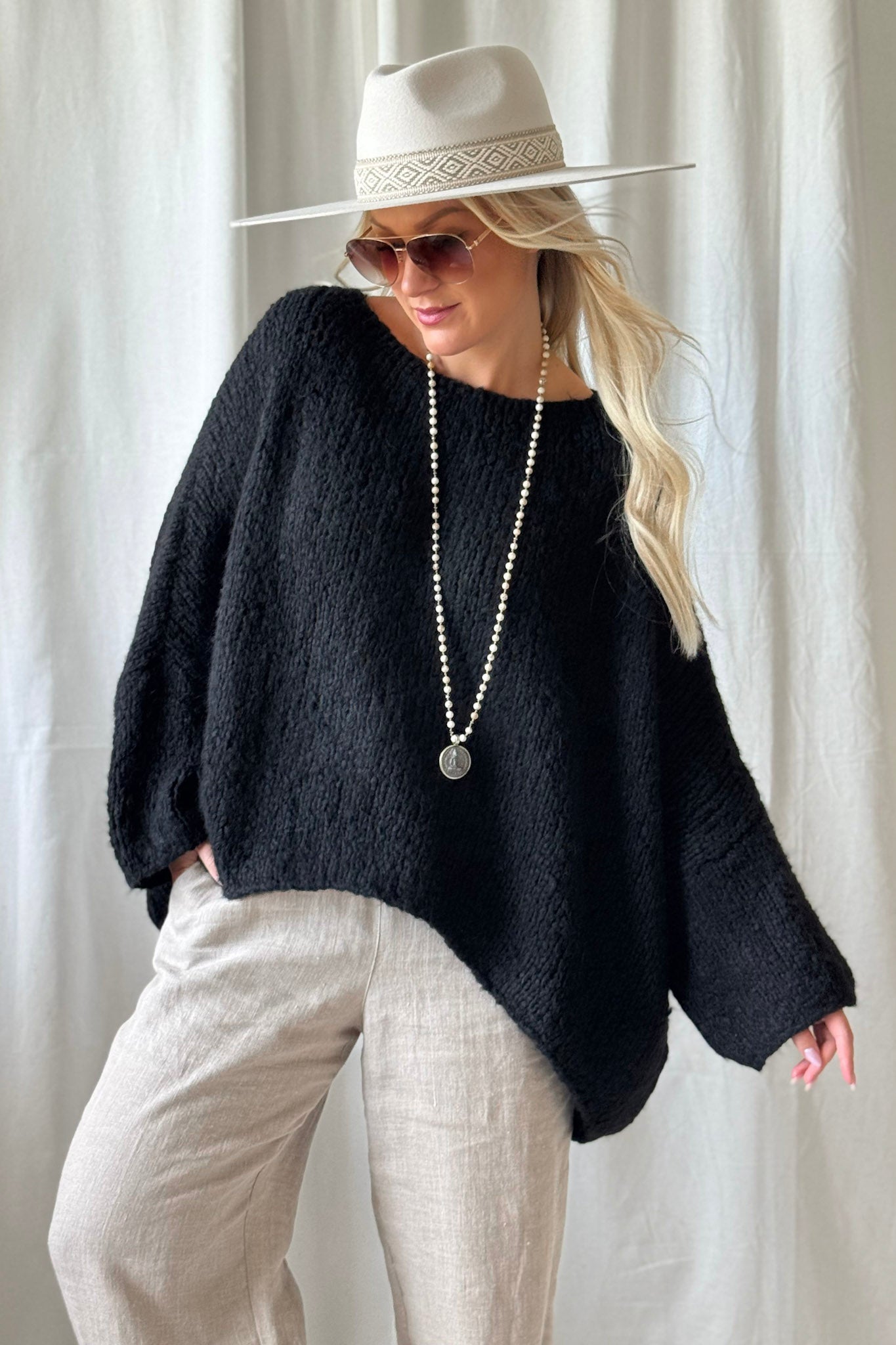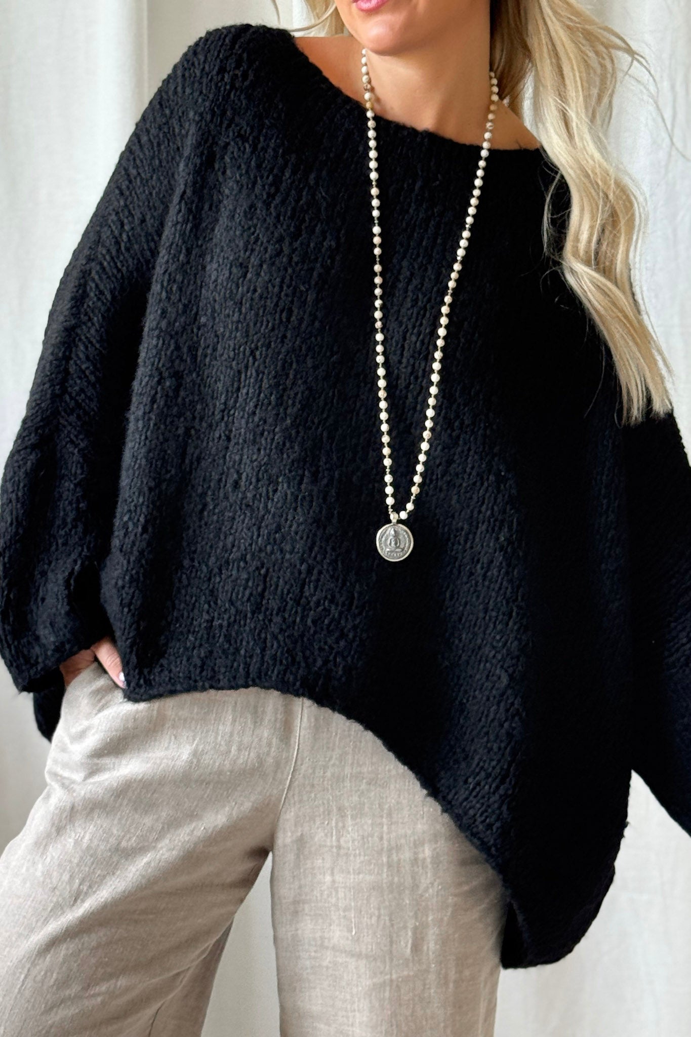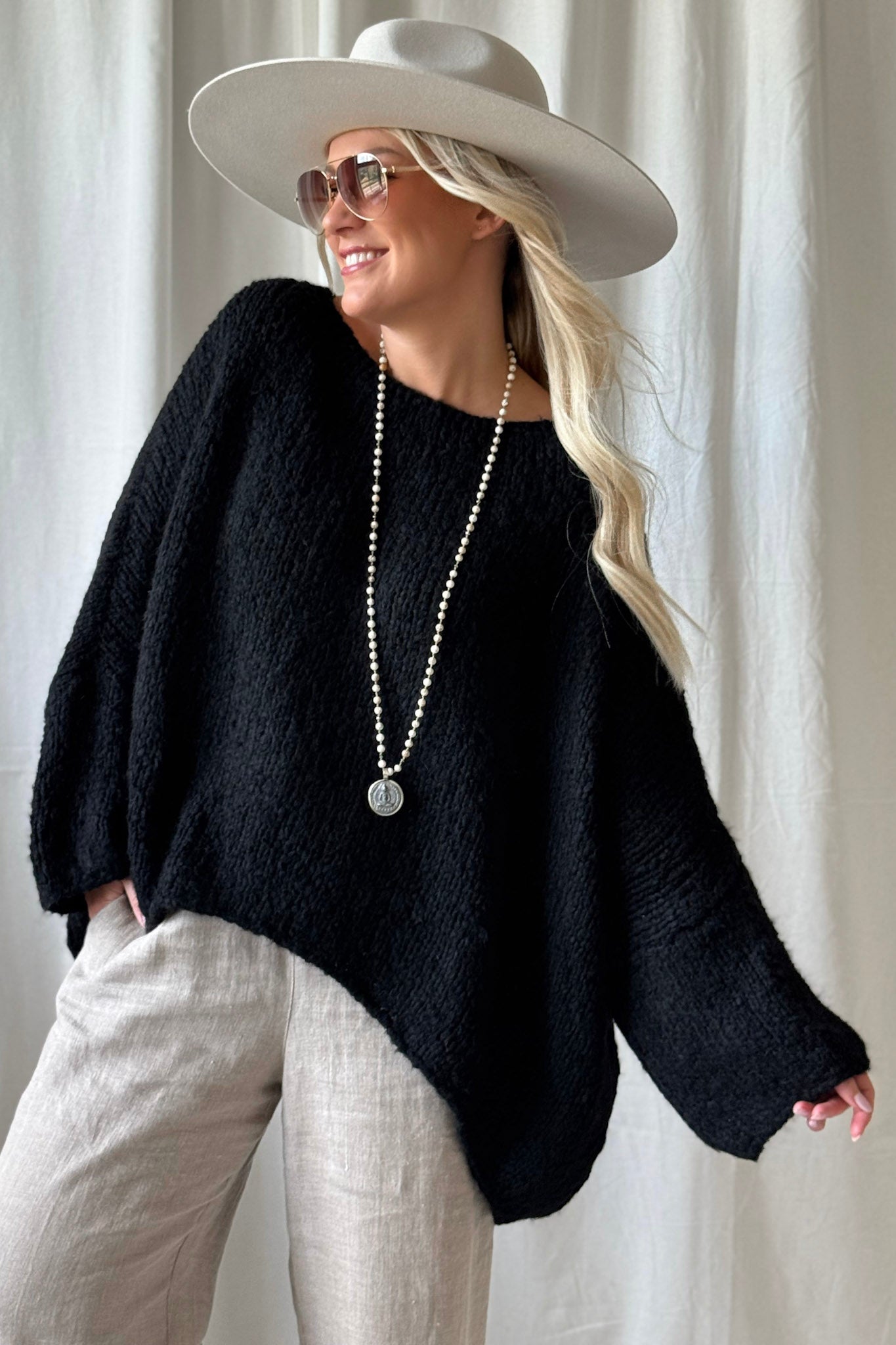 Bouckle-mallistomme ylellisen pehmeä, erittäin väljän mallinen neule, jossa on venepääntie ja madallettu olkapäälinja. Helma on alaspäin levenevä ja oversize mallia. Ihanan muhkea neule viileisiin päiviin! Boucle-neuleet ovat materiaaliltaan helppohoitoisia, eivätkä kutita ihoa.