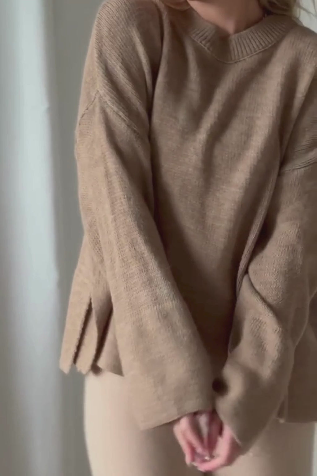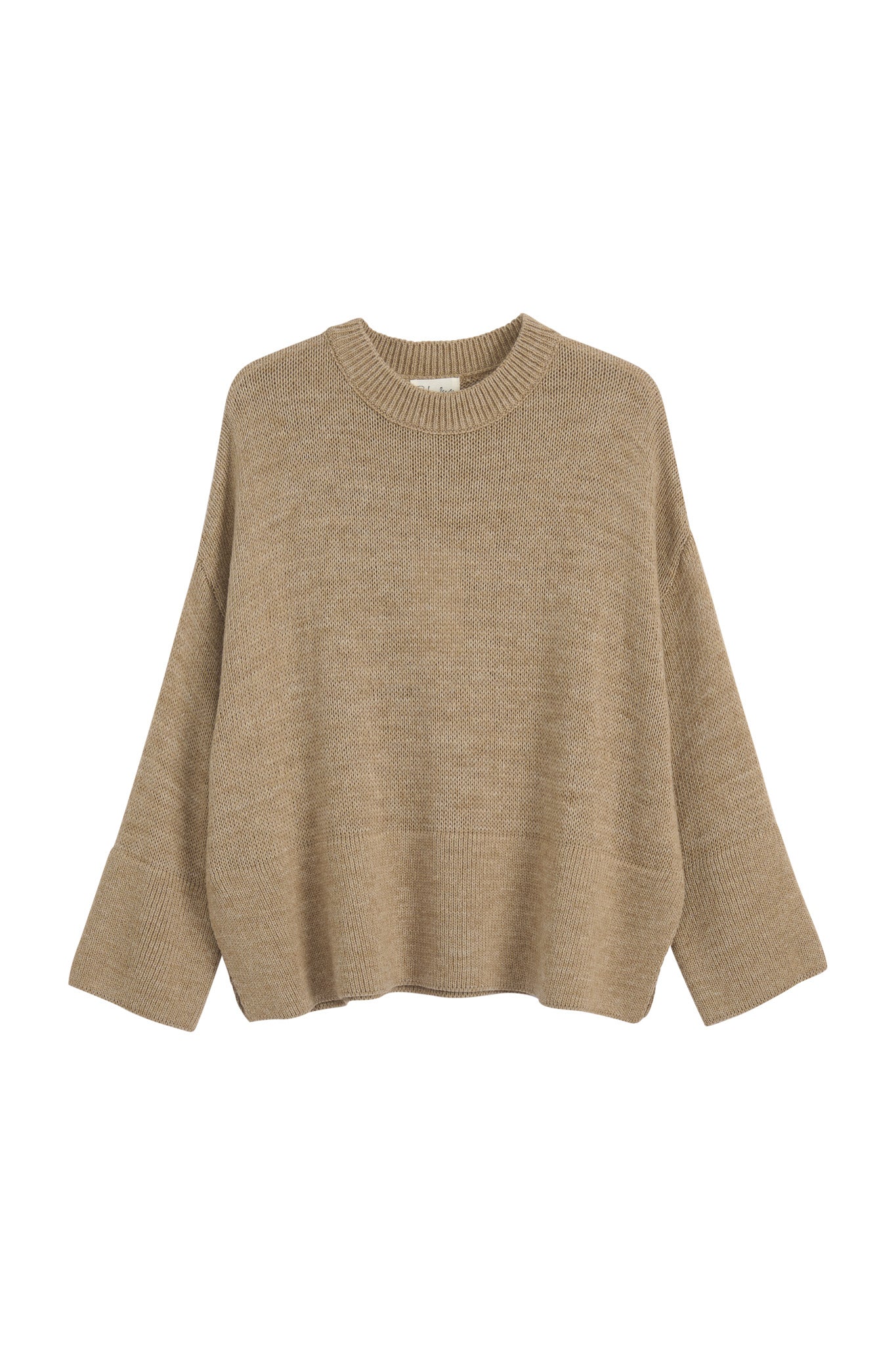 Tyylikäs, ajaton ja monikäyttöinen neulepaita, jossa on pyöreä pääntie, madallettu olkapäälinja ja sivuissa lyhyet halkiot. Paita laskeutuu kauniisti ja on leveähelmainen.