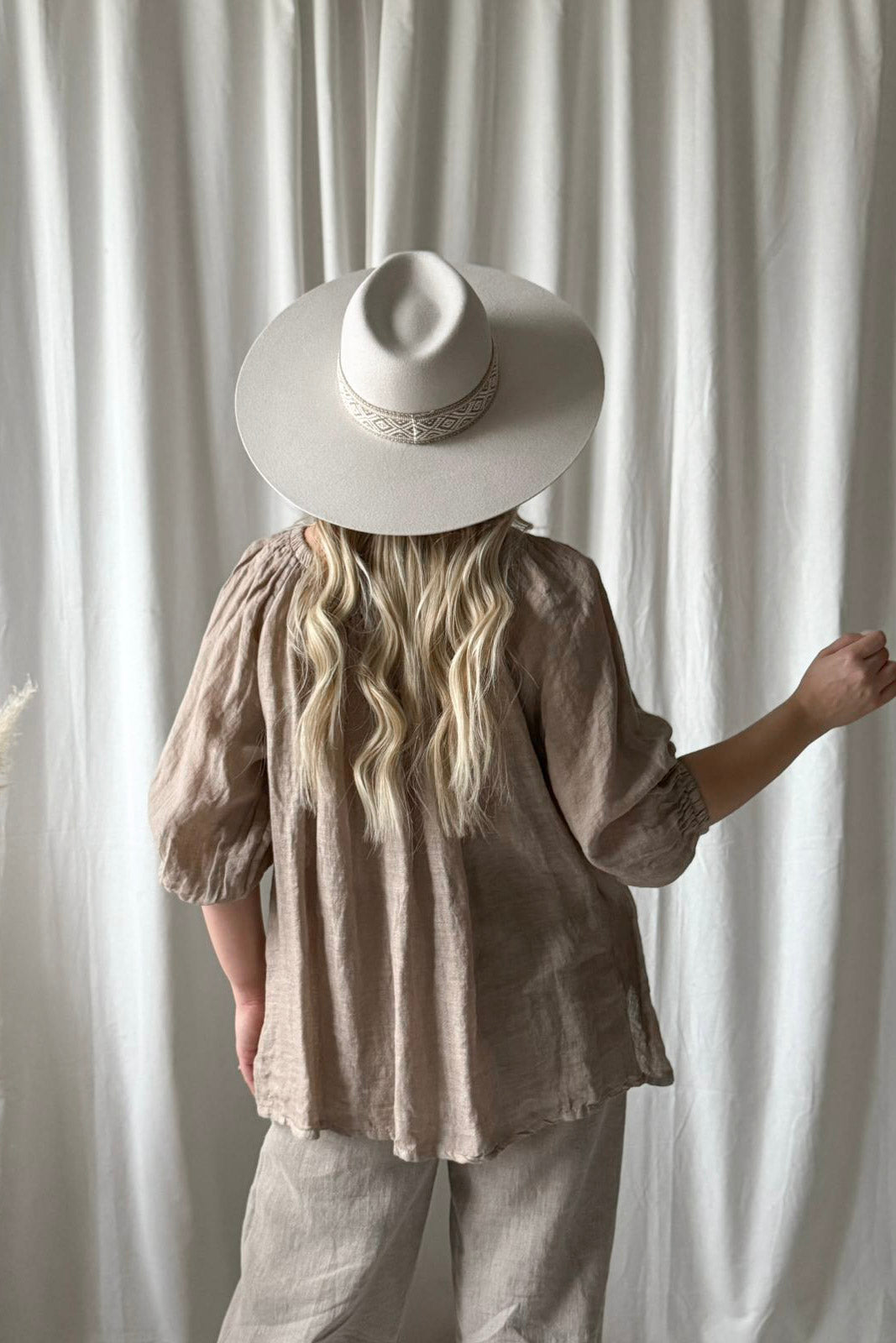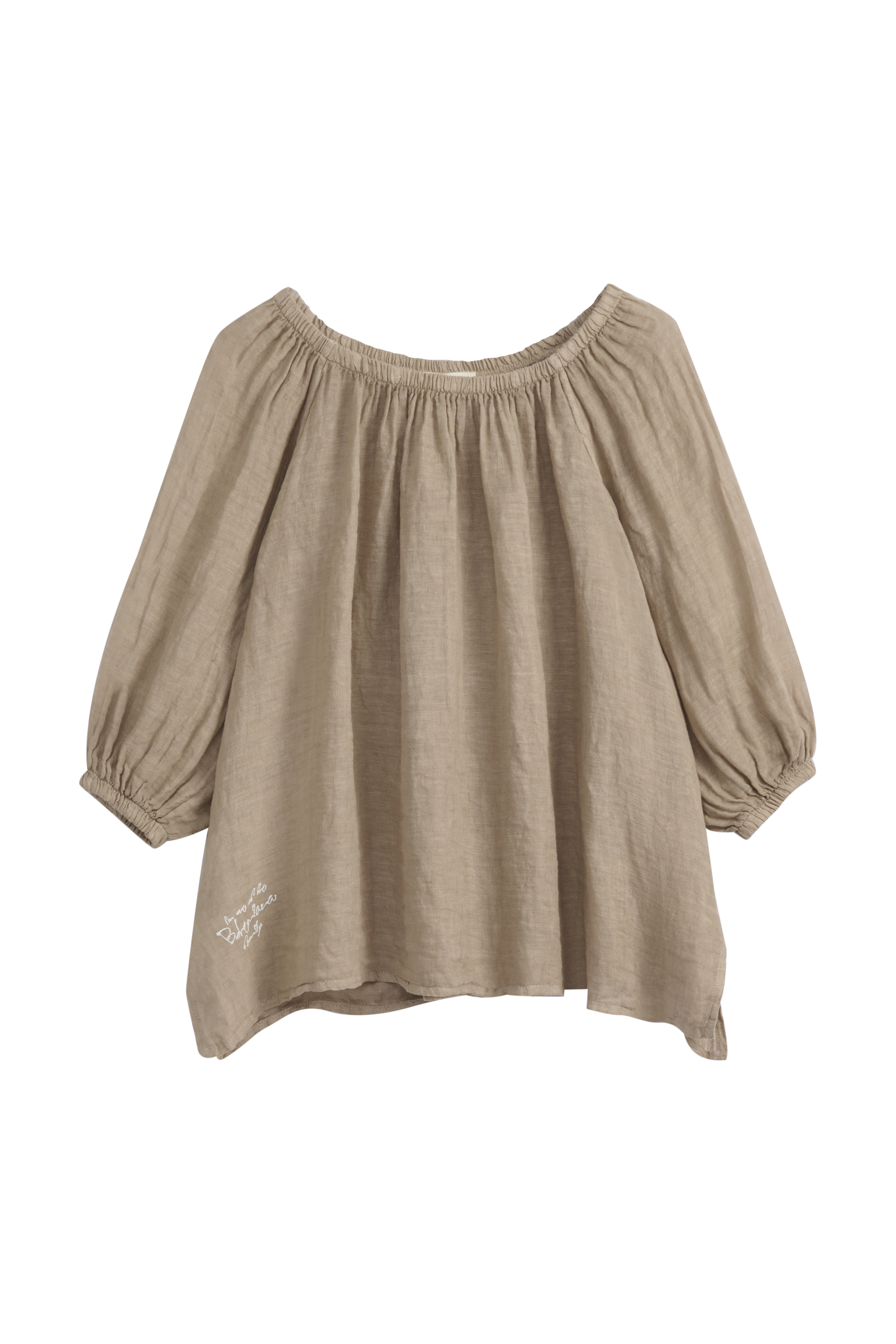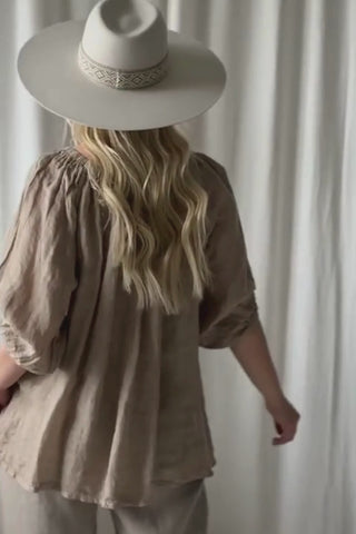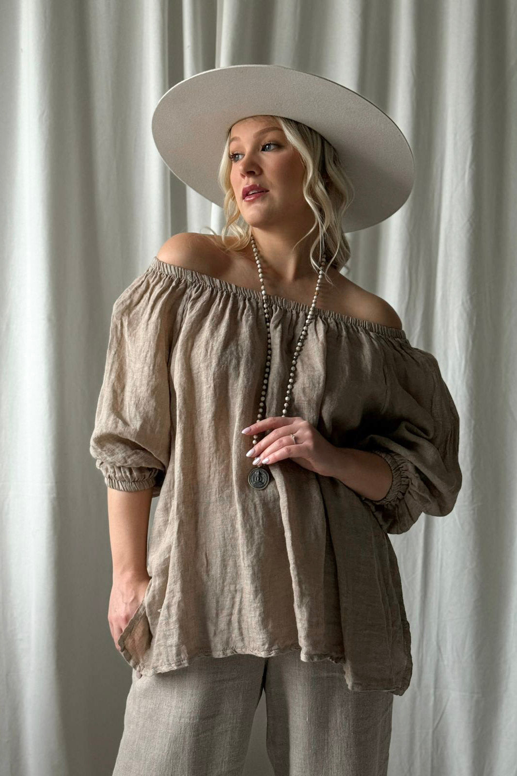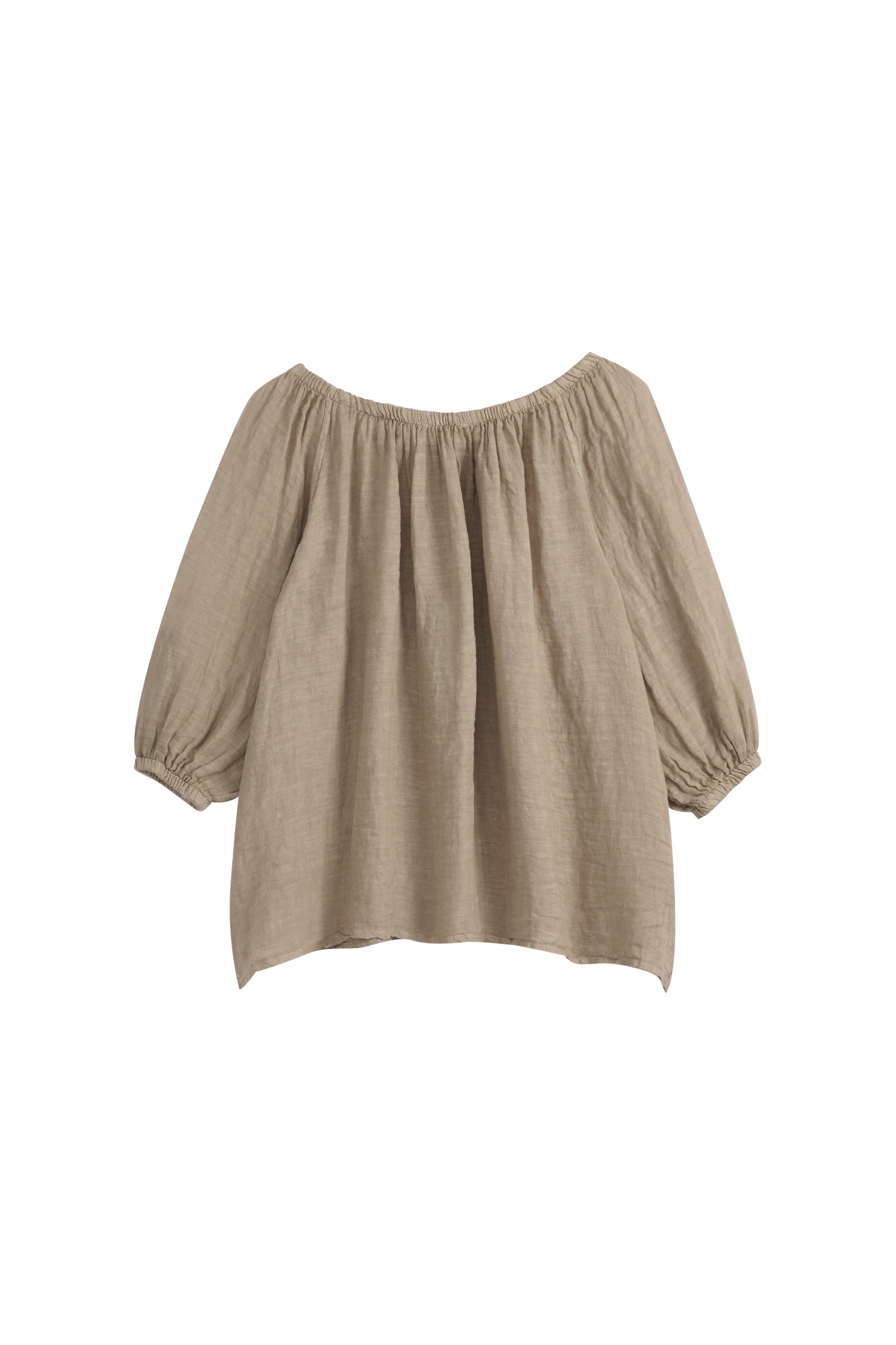 Ihanan kepeä ja romanttinen pellavapaita. Paidan ihanat yksityiskohdat luo resori-pääntie ja sen alla oleva rypytys. Pehmeän resorin ansiosta paitaa voi käyttää myös off-shoulder mallisena. Hihat ovat 3/4-pituiset ja hihansuissa on resorit. Paidan sivuissa on pienet halkiot.
